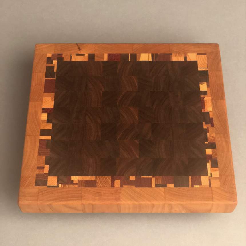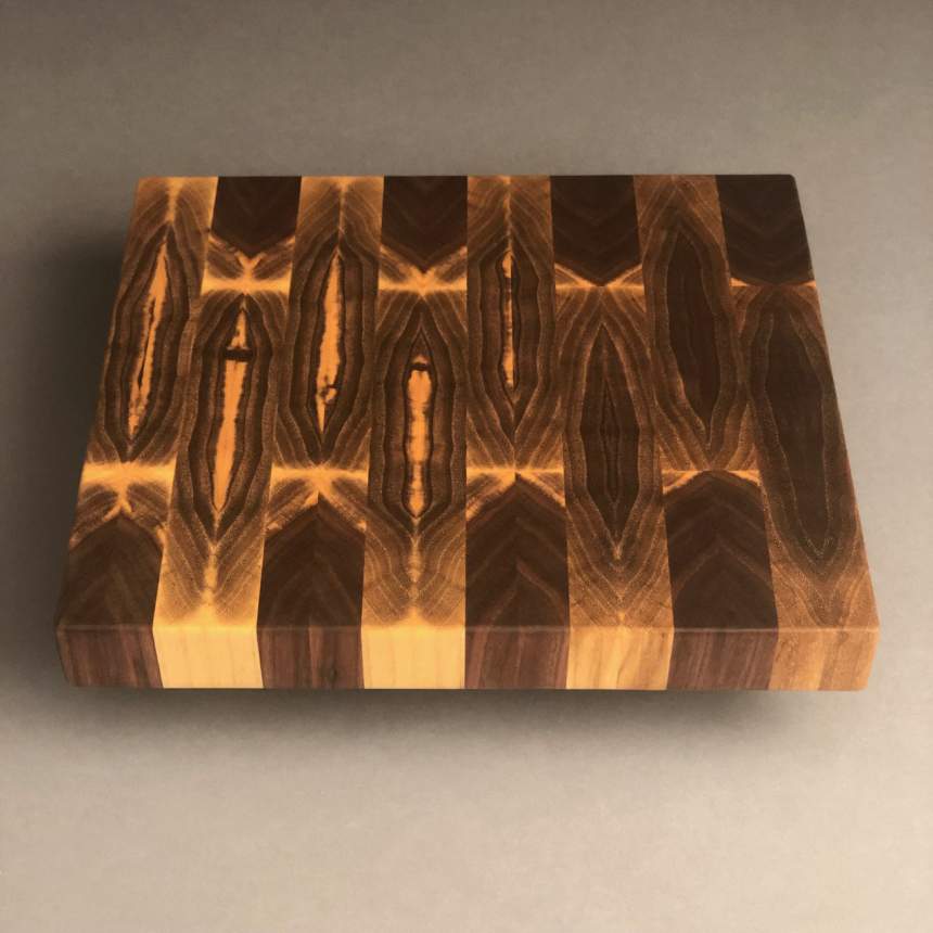 We are a husband and wife team, each bringing unique skills to the cutting board making process. Aaron's grandpa taught him the joy of fine woodworking at an early age, and he has continued that legacy over the past 25 years. Jen was a complete novice when she and Aaron first met, but has learned a great deal from him about woodworking, and brings an eye for design and detail to the team. We both find wood to be naturally beautiful and love how our cutting boards bring functional art into the kitchen. We specialize in end grain cutting boards, and much of the wood used is harvested, milled, and dried on our own property. We intentionally exploit the natural grain patterns in each piece of wood to create organic arrangements that make each one of our cutting boards entirely unique. We also take extreme care with the hand sanding and finishing process, as we feel it is important that each board feels as good as it looks and functions.