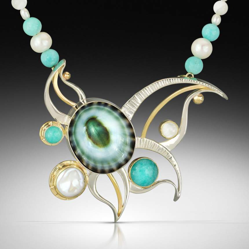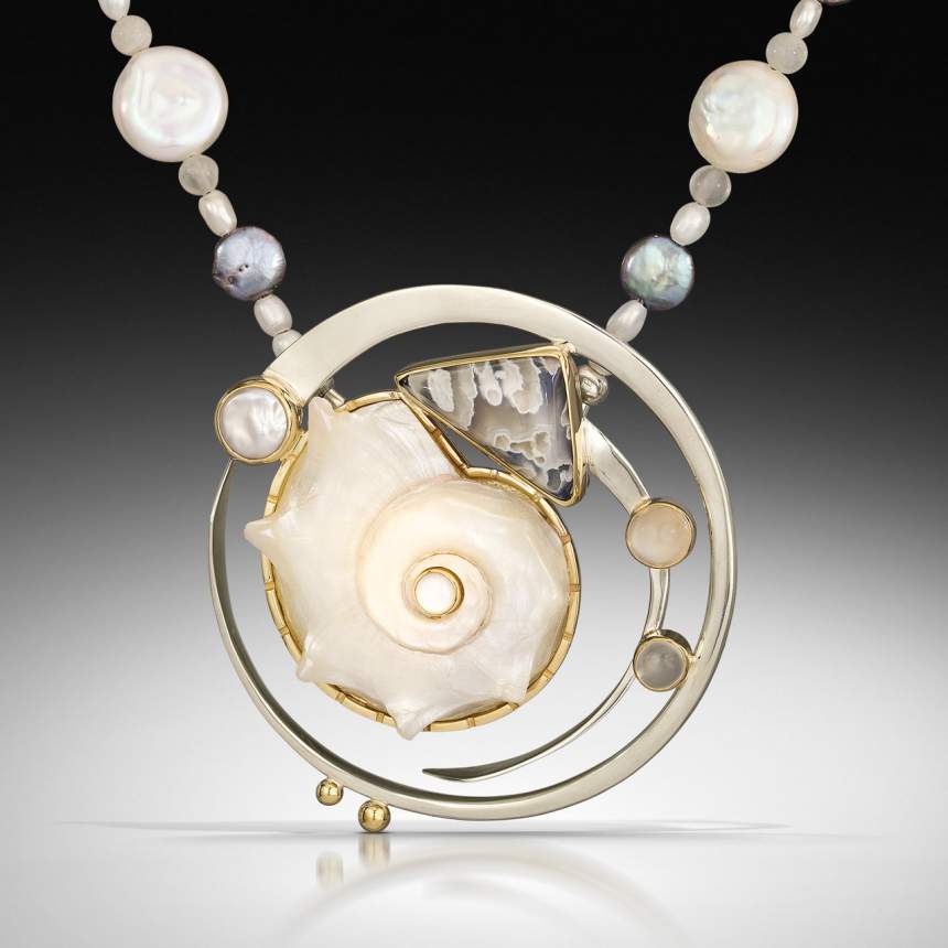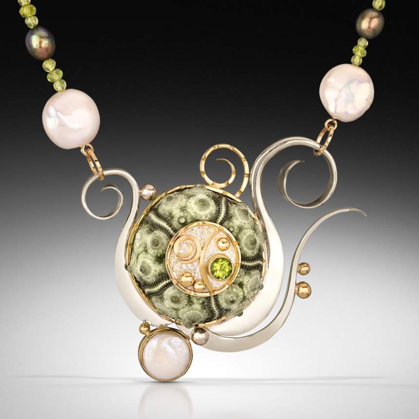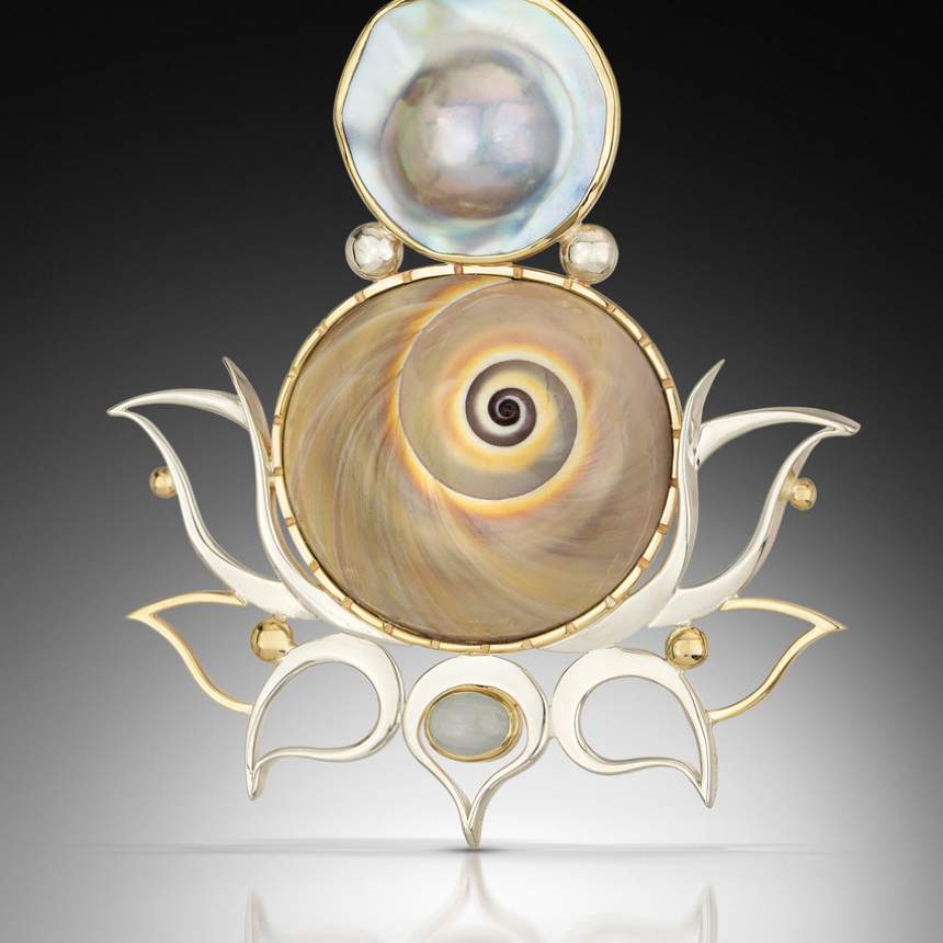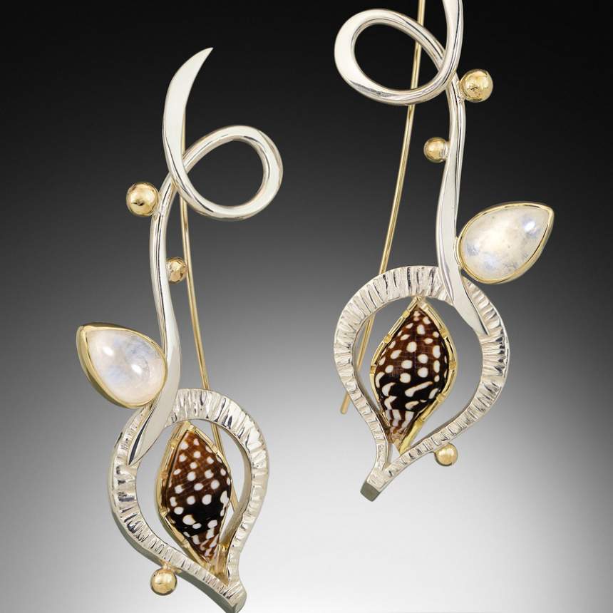 We design one of a kind jewelry made out of sea urchins and shells, inspired by our natural surroundings. We aim to capture the movement of the mythical sea creatures Barbara dreams up, as well as the tropical foliage that thrives in our Florida homestead. We build settings for the shells and stones out of gold sheets and wires, sculpting the silver by forging round sterling wires on an anvil to achieve a fluid sense of motion. Traditional blacksmithing techniques and hand tools are the foundation of our metals practice.