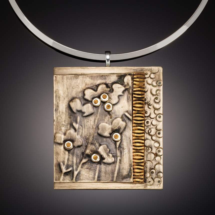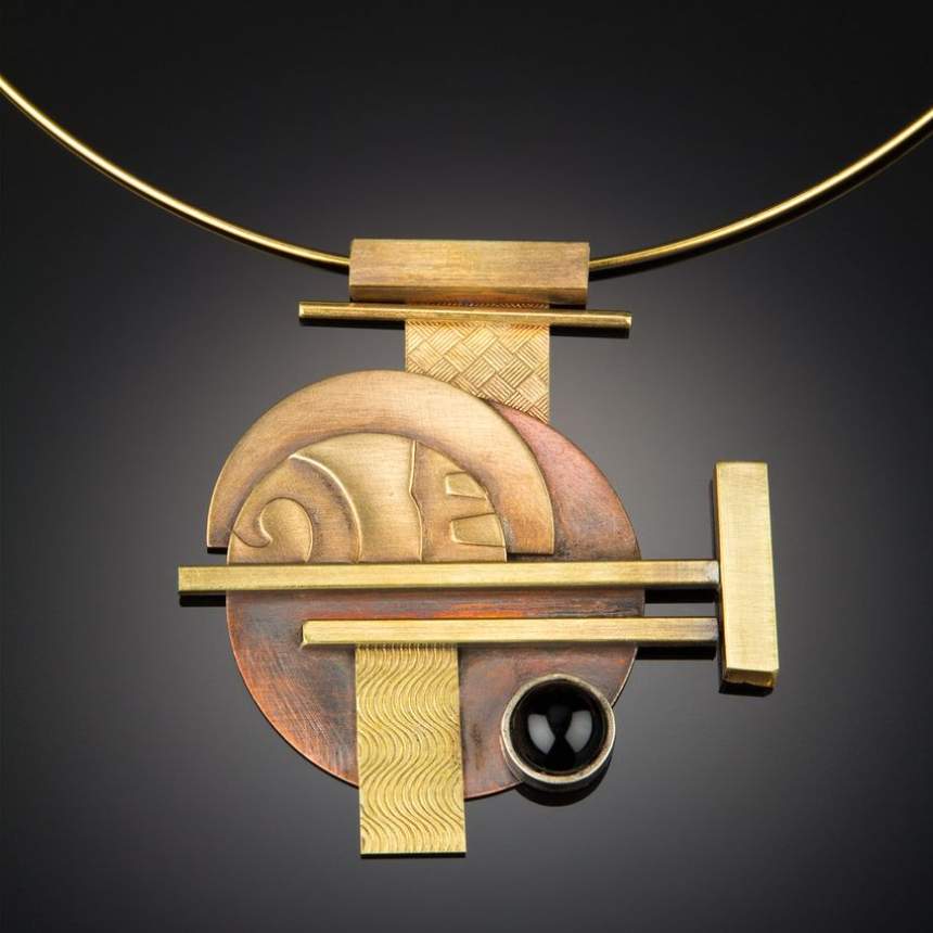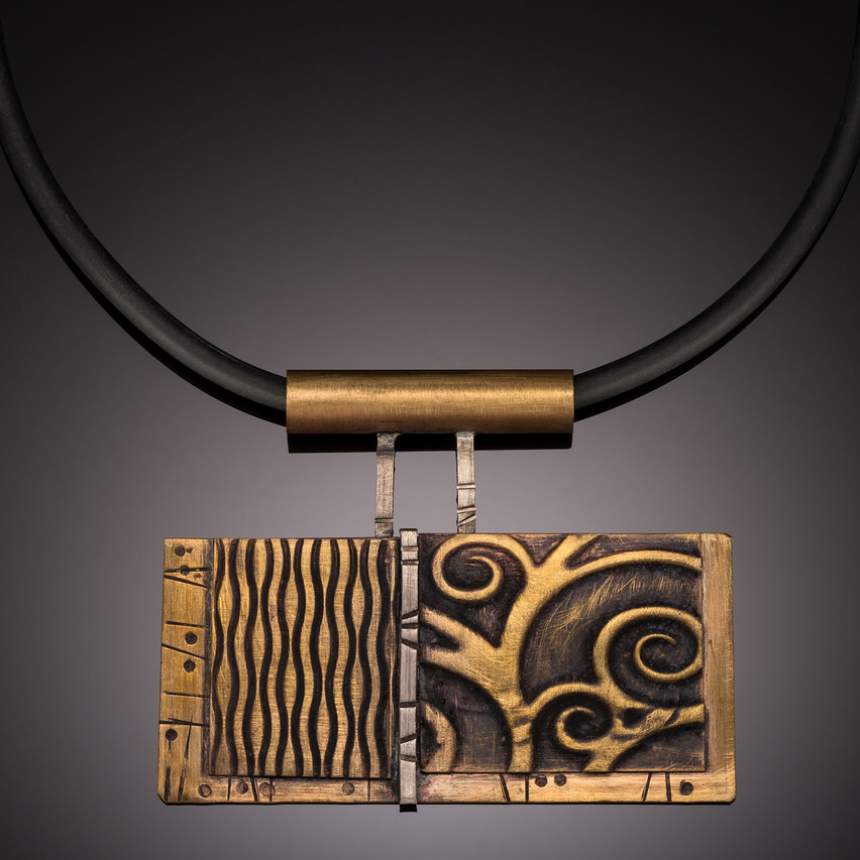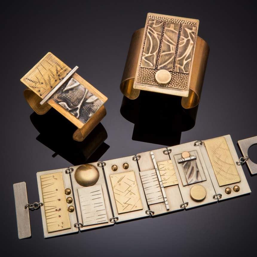 Architecturally inspired, hand fabricated jewelry utilizing silver, copper and brass. Techniques include embossing, oxidation, texturing, riveting and soldering.