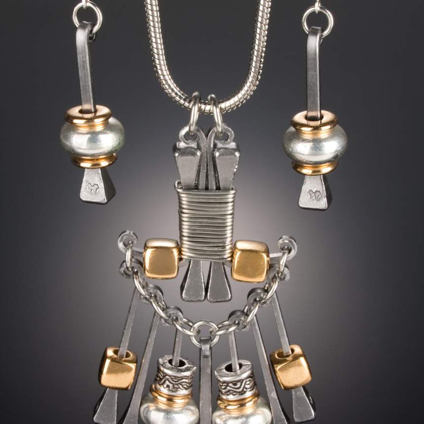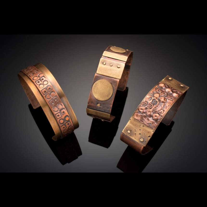 My jewelry is all hand fabricated using silver, brass and copper metals. Each piece is a one of a kind creation utilizing embossing techniques, wiring, soldering and oxidation. I design bracelets, earrings and necklaces.