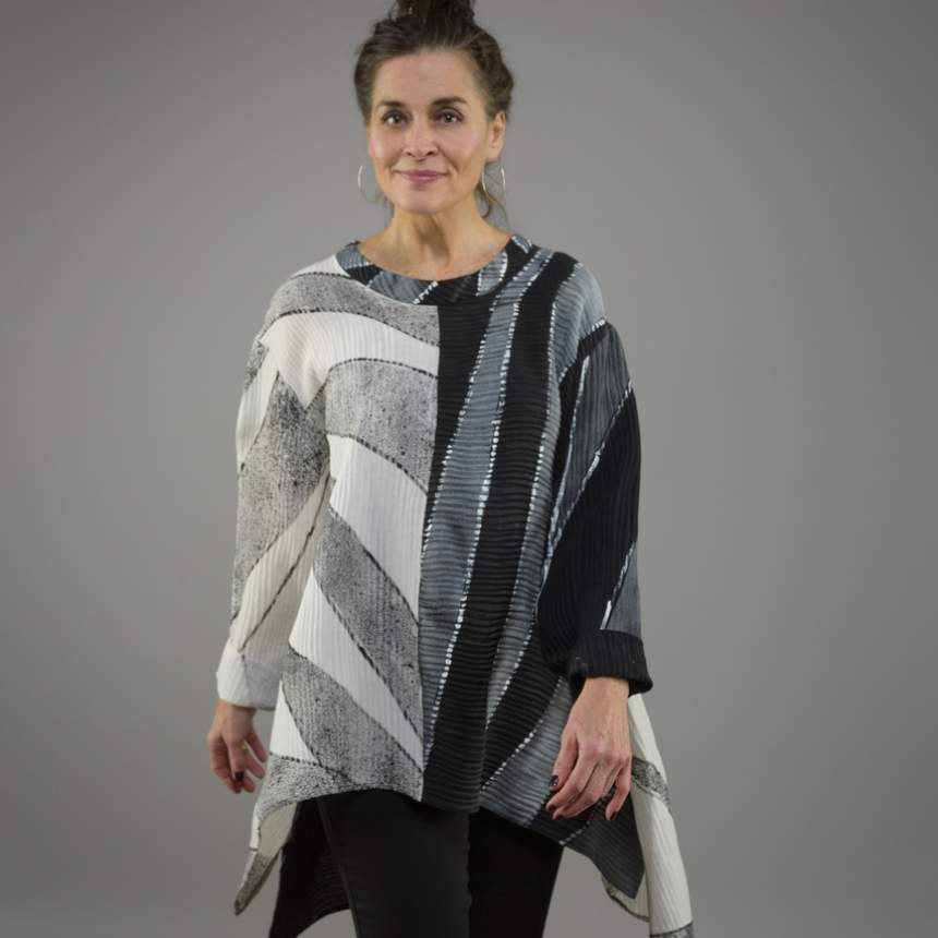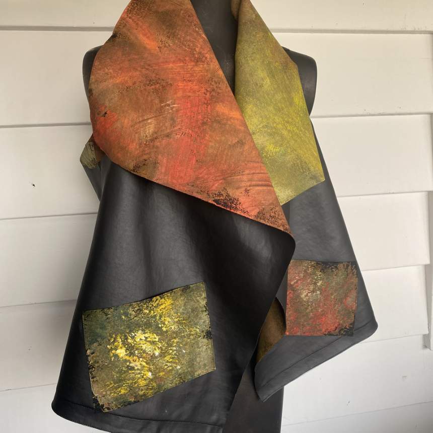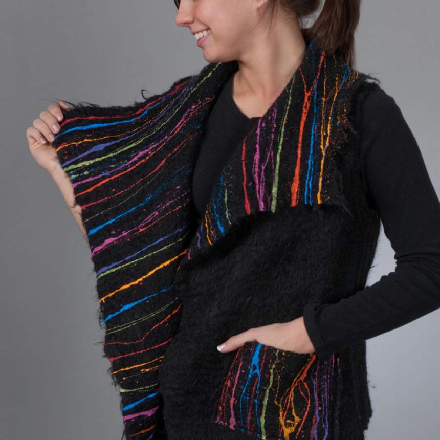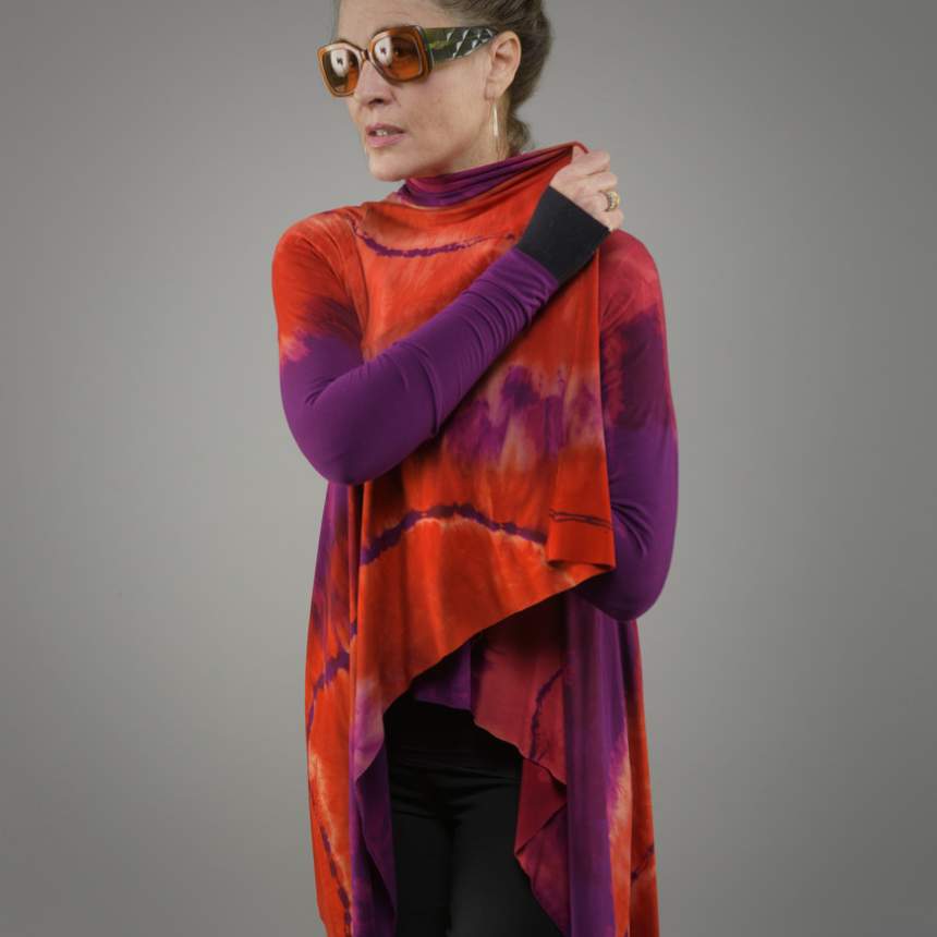 As an artist, I'm inspired by the order and chaos of natural processes. I aim to create the kind of untamed yet cohesive beauty found in nature. When paints and dyes meet fabric, I allow the unexpected to inform the original idea, while keeping in mind the human form that the clothing is meant to celebrate. I seek to give a vibratory quality to the hand-painted patterns, imparting energy to the wearer without being overwhelming. I work with a variety of fabrics, using a range of techniques that involve brushing, flinging, splattering, twisting, dripping and dipping. The result is clothing that bears the uniquely expressive mark of the artist's hand while allowing the wearer to shine through. Sometimes people instinctively find what works for them and sometimes we collaborate, discussing proportion, pattern, line, color and fit. The most rewarding part of the process is seeing people who look and feel wonderful in my clothing because a harmonious match has been found.