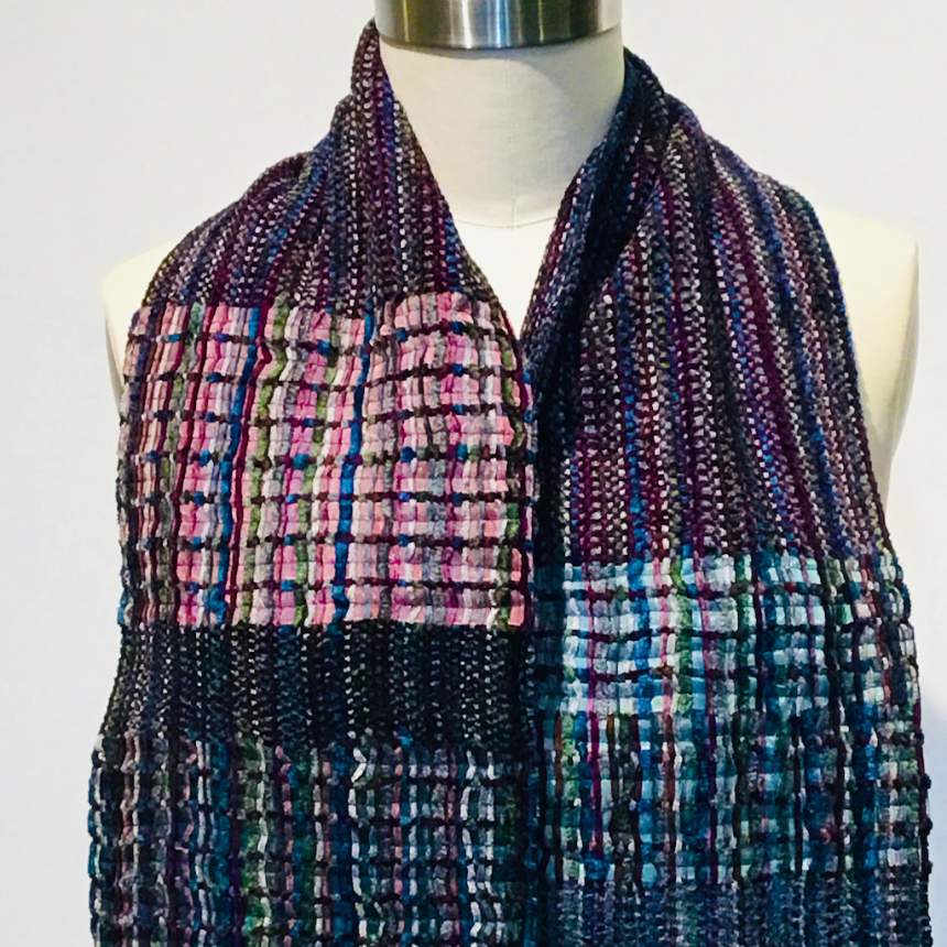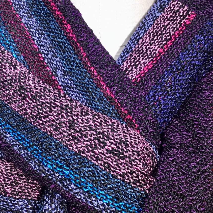 My work is hand woven in an array of variegated ribbons, rayon boucle, and bamboo. The garments and accessories are designed for work, play and travel. I am inspired by the drape and luminescence of what can be created from a single yarn, as it is woven into a fabric.