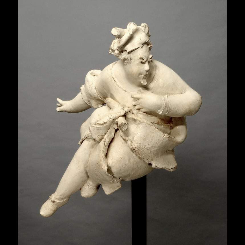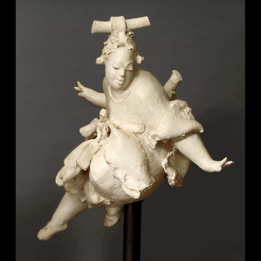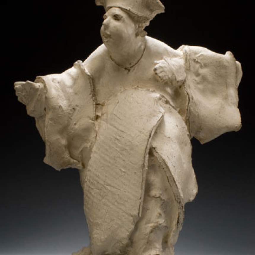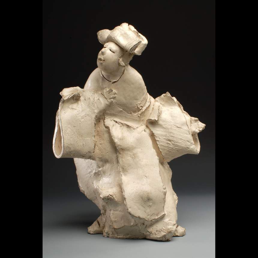 Asian-inspired figures modeled in clay, fired to cone 04, and colored with iron oxides and applied pigments. They are sometimes cast in acrylic-modified plaster for outdoor use.