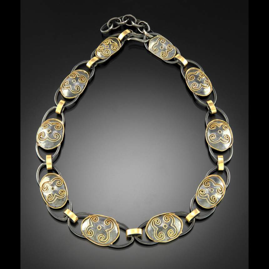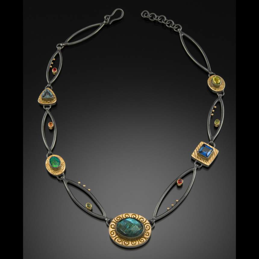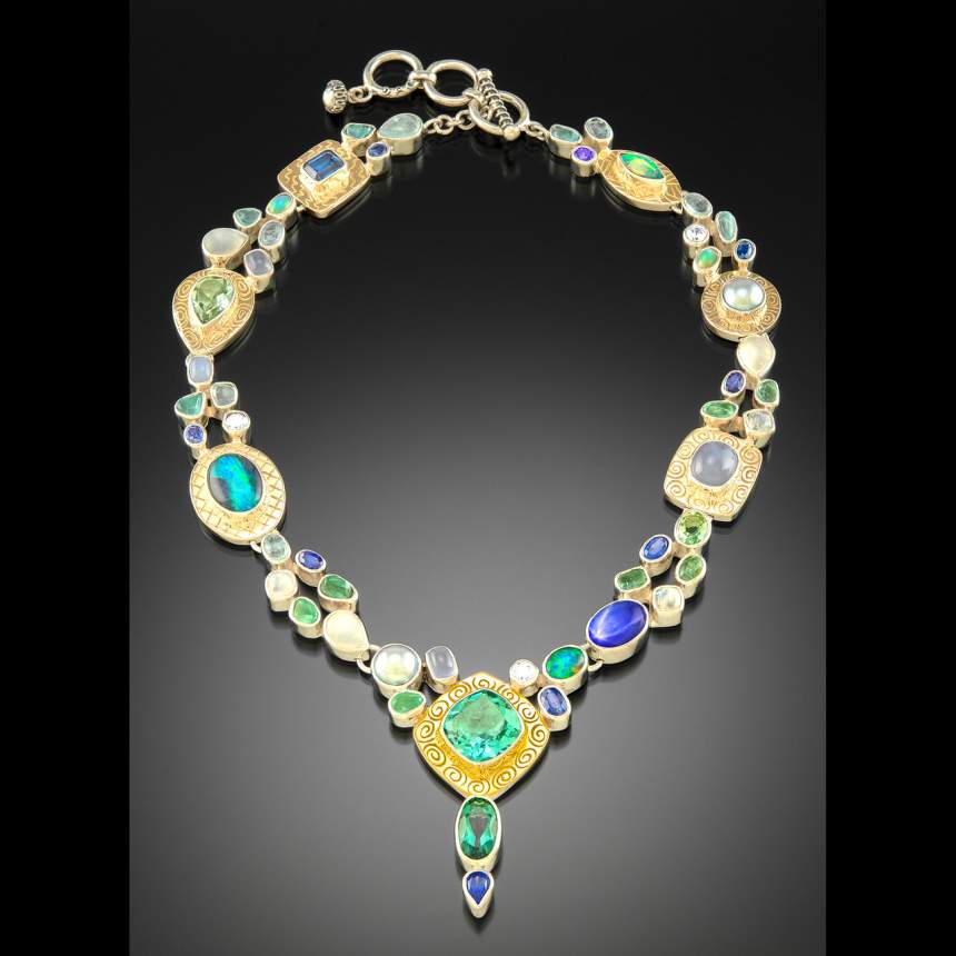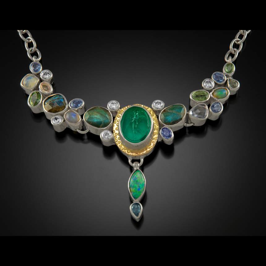 I create award-winning textured silver with gemstones and 18k gold decorated bezel work. Some bezels are etched surrounds, others pierced to let light illuminate the stones or fabricated to make the stones attractive from all angles. I also make pieces that are either carved out of wax, repoussed or fabricated in layers using piercing for the base, soldered sides, sealing the top and finally creating the third layer with individual cutouts in 18 k gold.