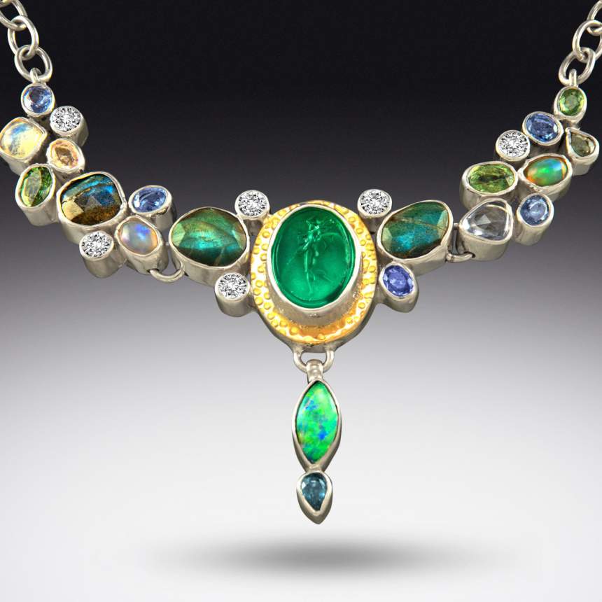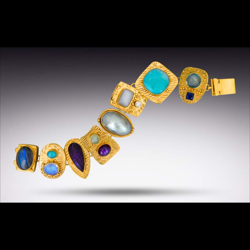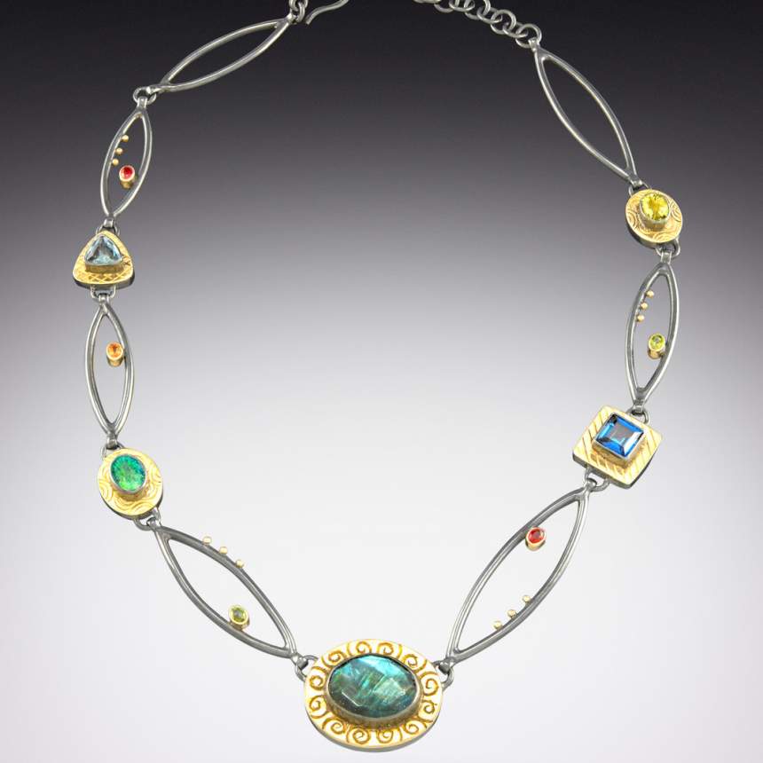 Deborah creates award-winning textured silver w/gemstones & 18k gold accents. Some bezels are etched surrounds, others pierced to let light in or fabricated to make it attractive from all angles. She also makes pieces that are either carved out of wax, repoussed or fabricated in layers.