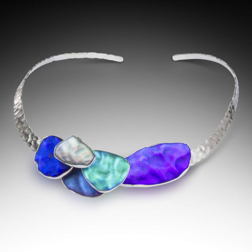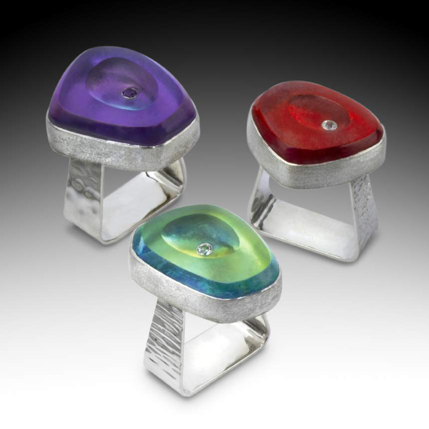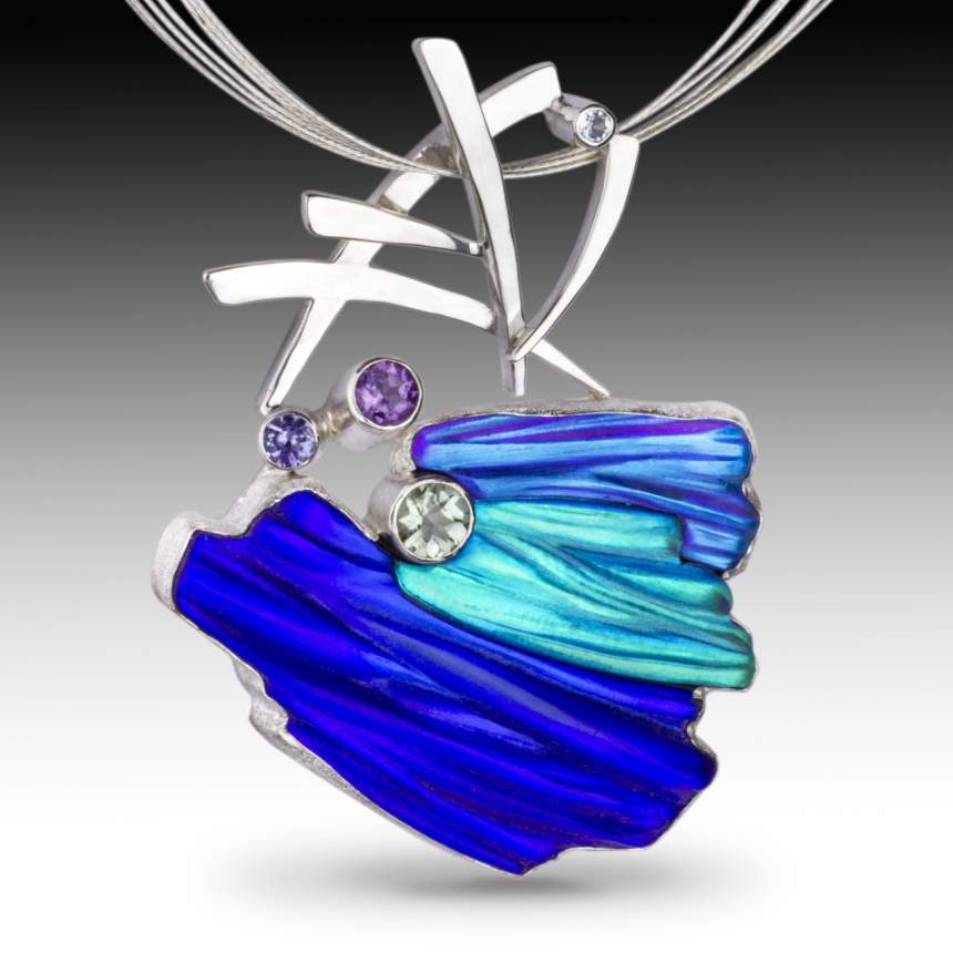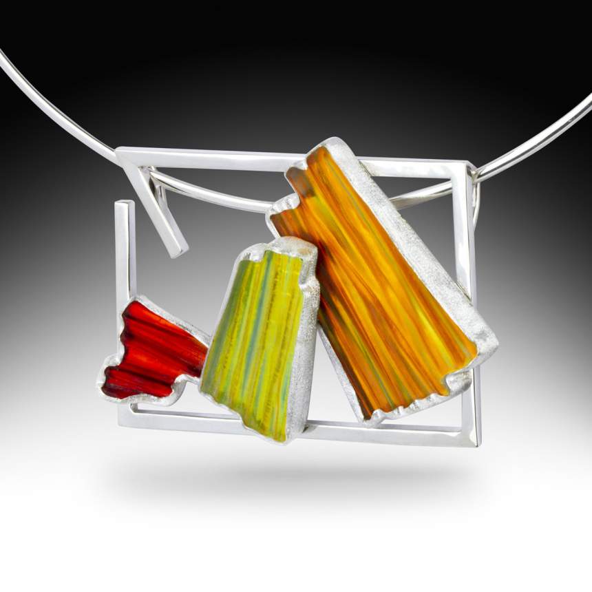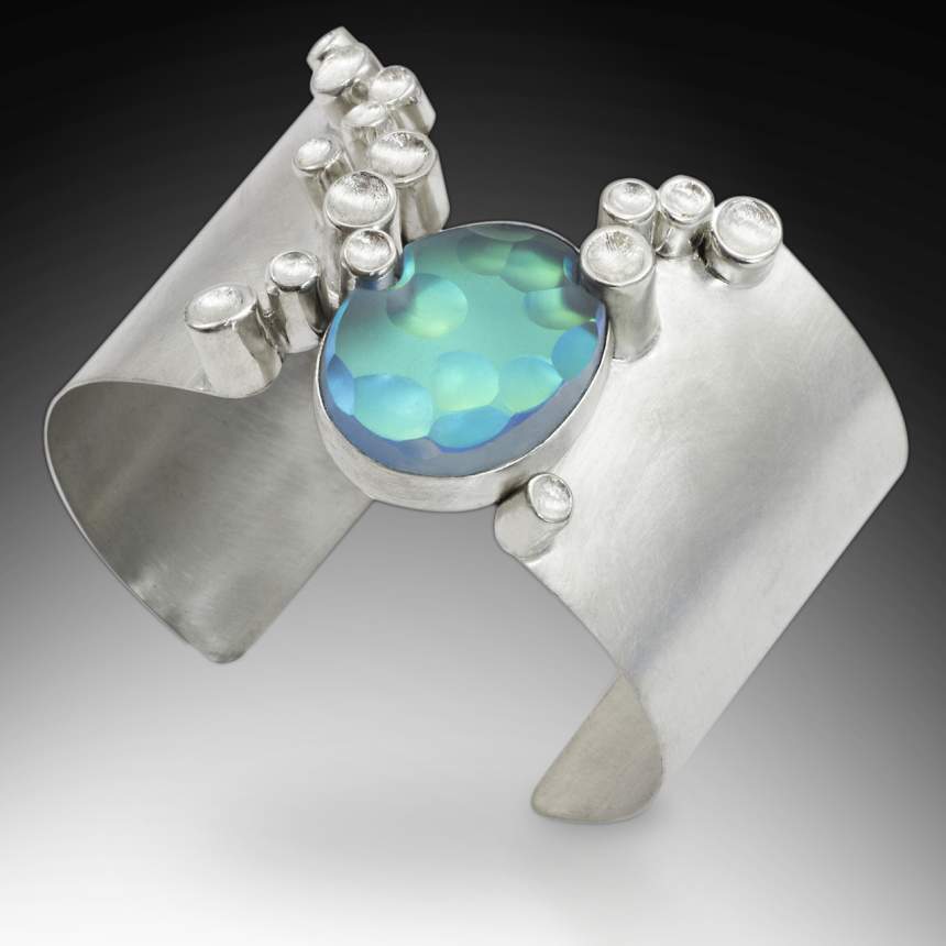 I am formally trained jeweler who graduated from art school before ‘carbon footprint’ and ‘climate change’ were terms used in our everyday vernacular. For over a decade, I incorporated plastics into my work as a way to add in color, but with the shift in the current global conversation, I decided my only option was to reinvent myself, and I began a quest to find a more sustainable material. Through years of experimentation, I have developed my own modified cold-working techniques where I sculpt glass that I make from a mix of new and upcycled materials to create richly colorful and opalescent pieces that narratively explore environmental issues while blurring the lines between natural and manmade elements. I laminate sheets of glass to create the color I desire and sculpt it while it remains at room temperature using a mix of traditional glass and lapidary including laminating, grinding, drilling, cutting, sanding, and stone wheel engraving. I do not use any molds.