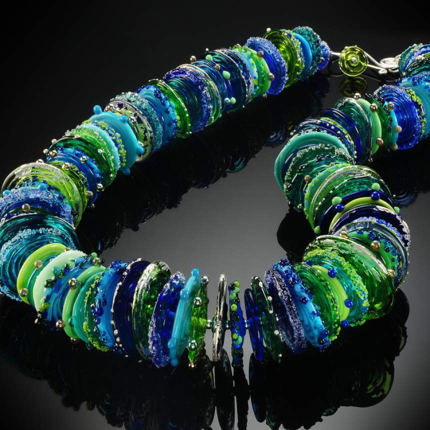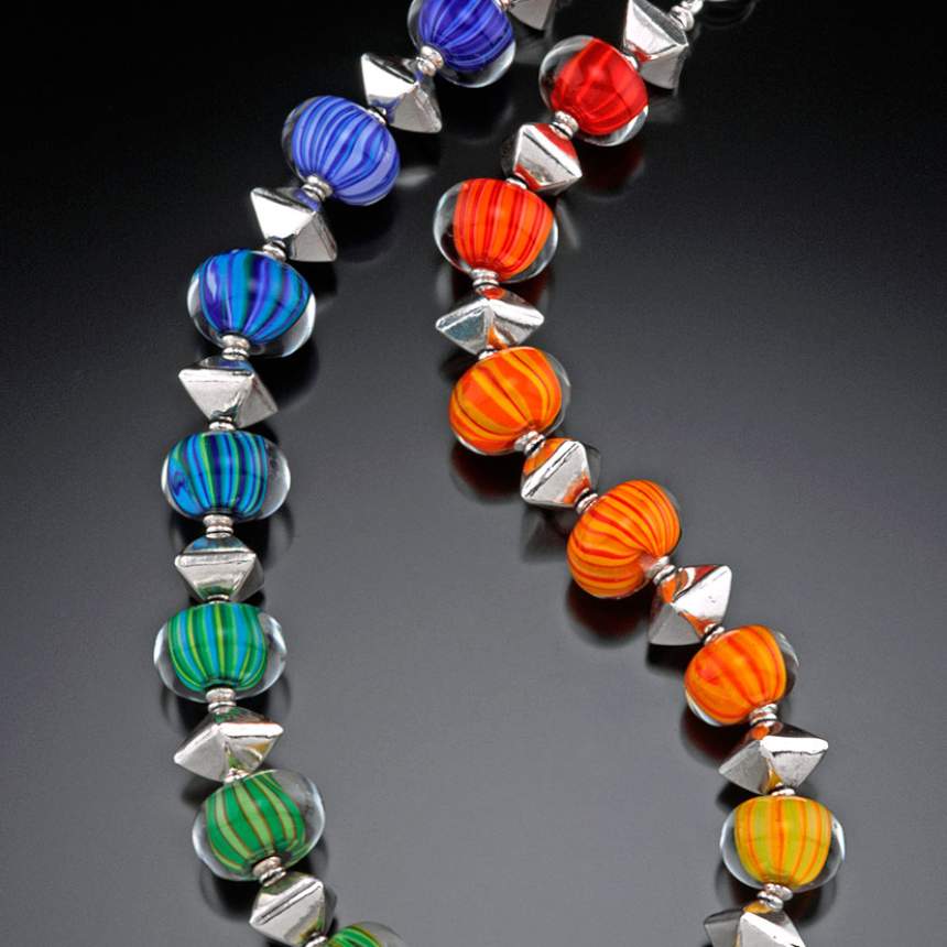 Lampworking (flame-working) is an ancient art developed thousands of years ago. It is the art of melting rods of glass in the flame of a torch and winding the molten glass around a steel rod or "mandrel" which has a clay-based release agent on it to keep the glass from bonding to the steel itself. The steel rod must be evenly rotated to center the hot glass. The bead can be shaped and decorated using a variety of simple tools, all the while keeping the glass at a molten state by moving it in and out of the flame. Some of the tools used for intricate patterns, textures and designs are called: frits, powders, stringers and foils. The flame-worked bead is then placed in a kiln and held at 950 degrees to anneal (to toughen and reduce brittleness) making the glass bead stable. I then combine my lampwork glass beads with findings of sterling silver to complete each piece. I am always expanding my knowledge of bead making by attending several workshops and working with the "Masters"!