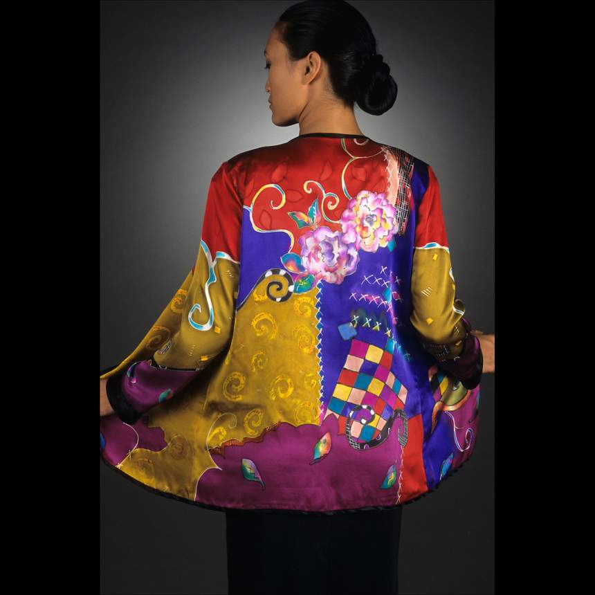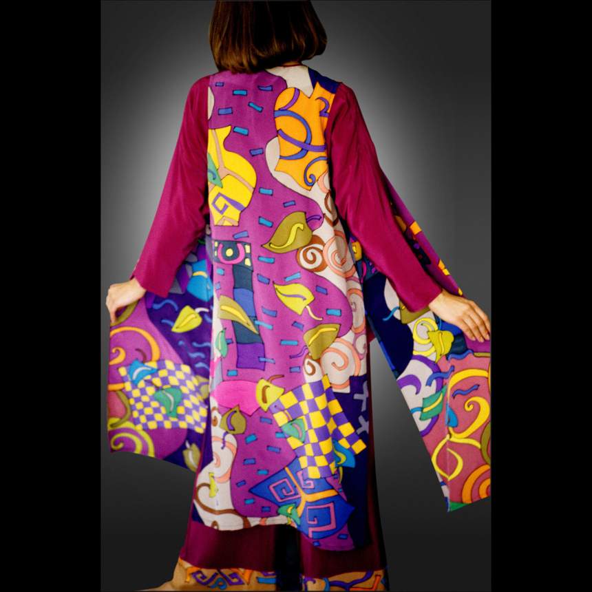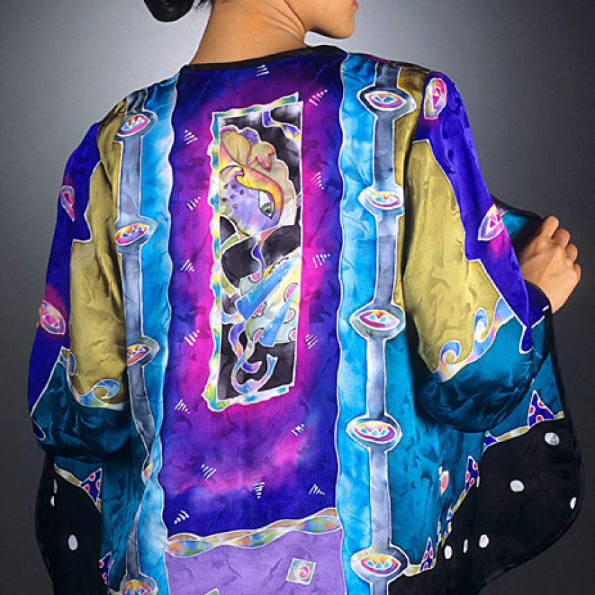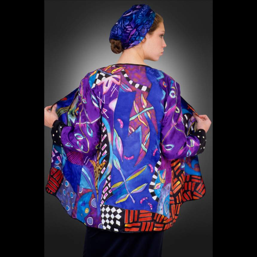 Designs are drawn onto white silk using a resist. The silk is then stretched onto frames and hand painted with custom mixed dyes. When the pieces are dry they are wrapped on a tube between newsprint and steamed for several hours to bond the dye to the fiber after which the silk is washed and ironed. Now the pieces are ready to be cut and sewn into the garments and accessories they were designed for. Easy wear wearable art.