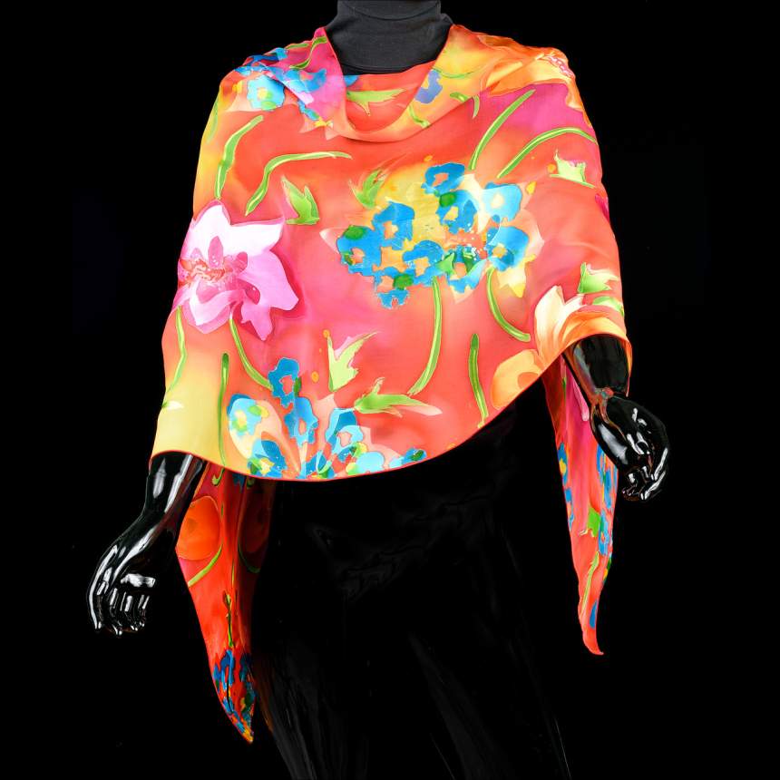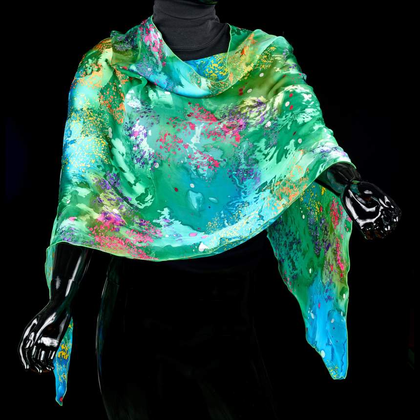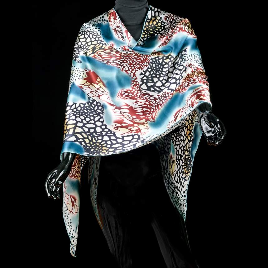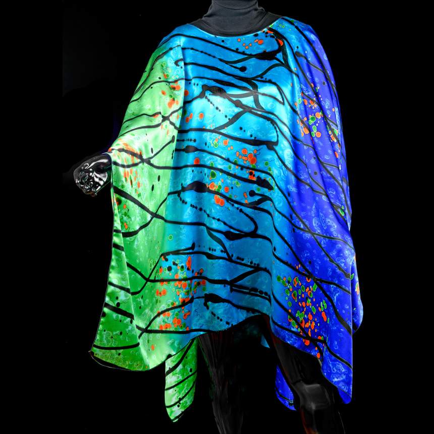 Beginning with mostly white silk or a rayon silk blend, each piece is first stretched taut, then dyes are applied by hand using finely pointed French brushes. I use salt, shibori, devoré, and some marbling techniques for special effects. After the piece is dried, it is steamed for five hours and then washed to ensure color permanence. Then each piece is hand-cut and sewn into various pieces of wearable art for patrons to enjoy for years to come.