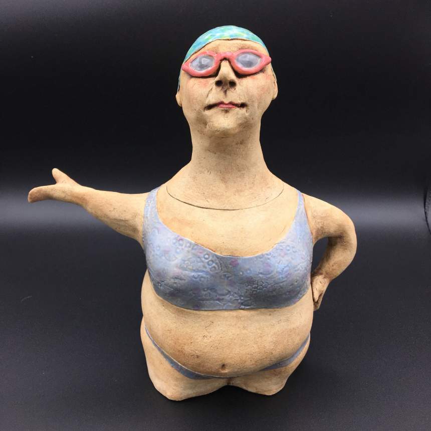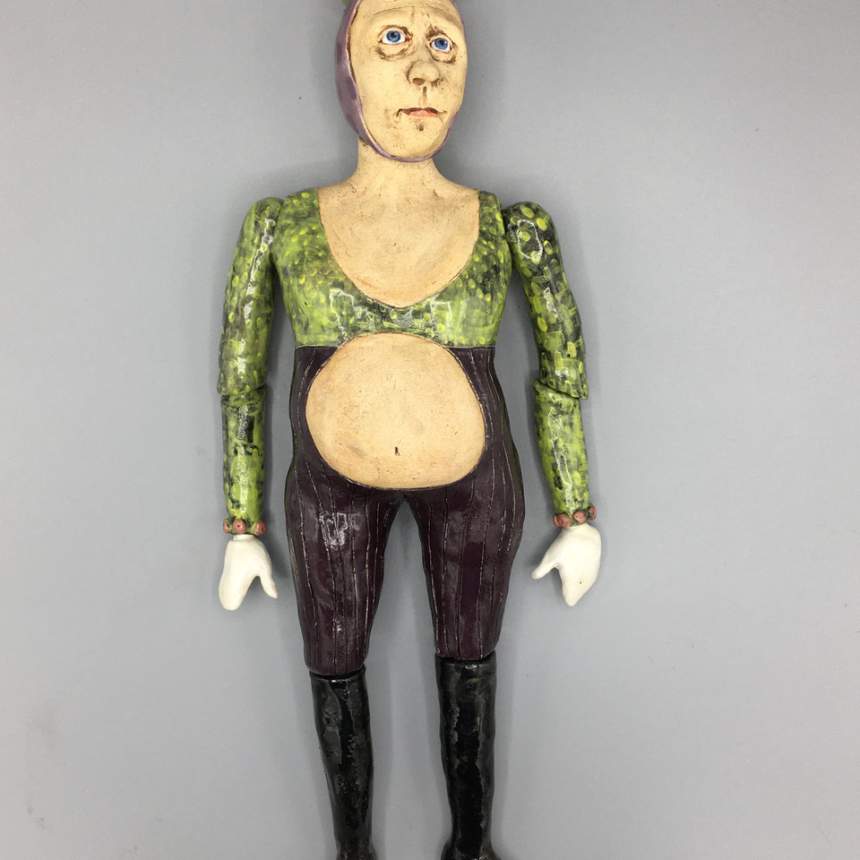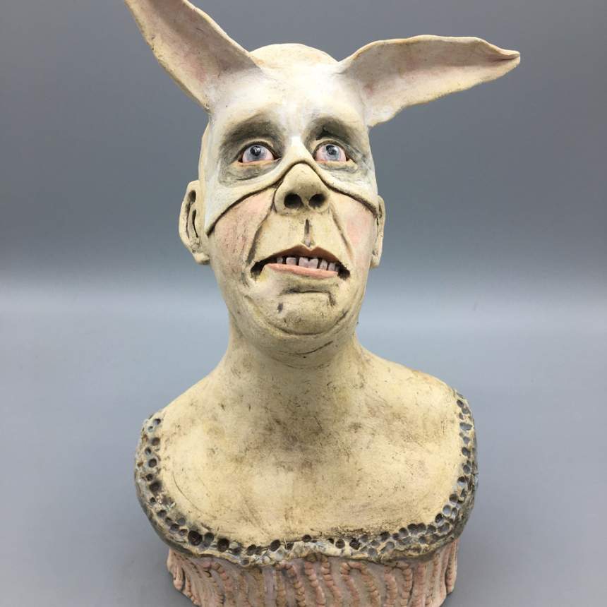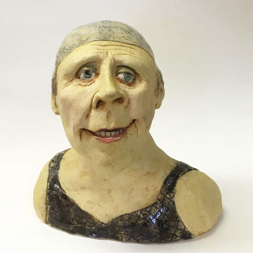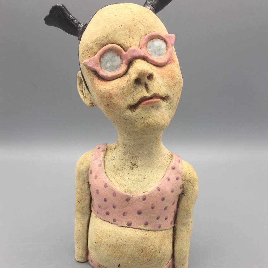 My figure sculptures were born from my love of illustration. I strive to make each figure express an emotion either through the curve of a mouth or the glint of an eye. Each figure is individually sculpted of kiln fired paper clay, and though they are not direct portraits they do hint at people I have known. My sculptures are created in small bits of time. I am attracted to gesture drawing and consider each to be a small sketch in clay. I believe my process adds to the feeling of an illustration. I see a detail in the clay that I will pull out to form a mouth or a nose then I build the face from there. Each is a unique sculpture, formed completely in the moment. I bisque fire my sculptures multiple times to layer underglazes. I am trying to achieve a feeling of watercolor and ink drawings with each piece. I will do a fine firing to cone 6 in an electric kiln.