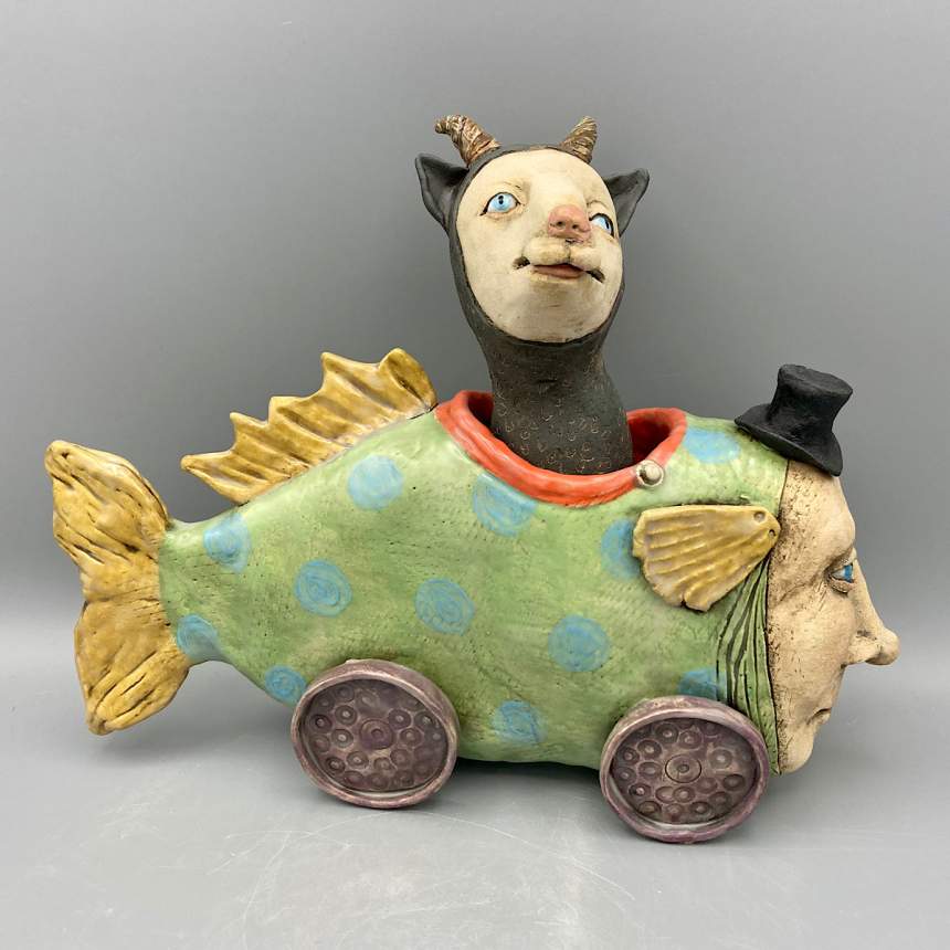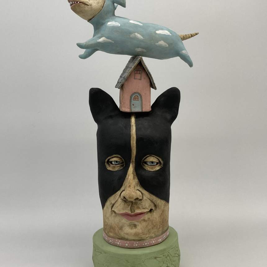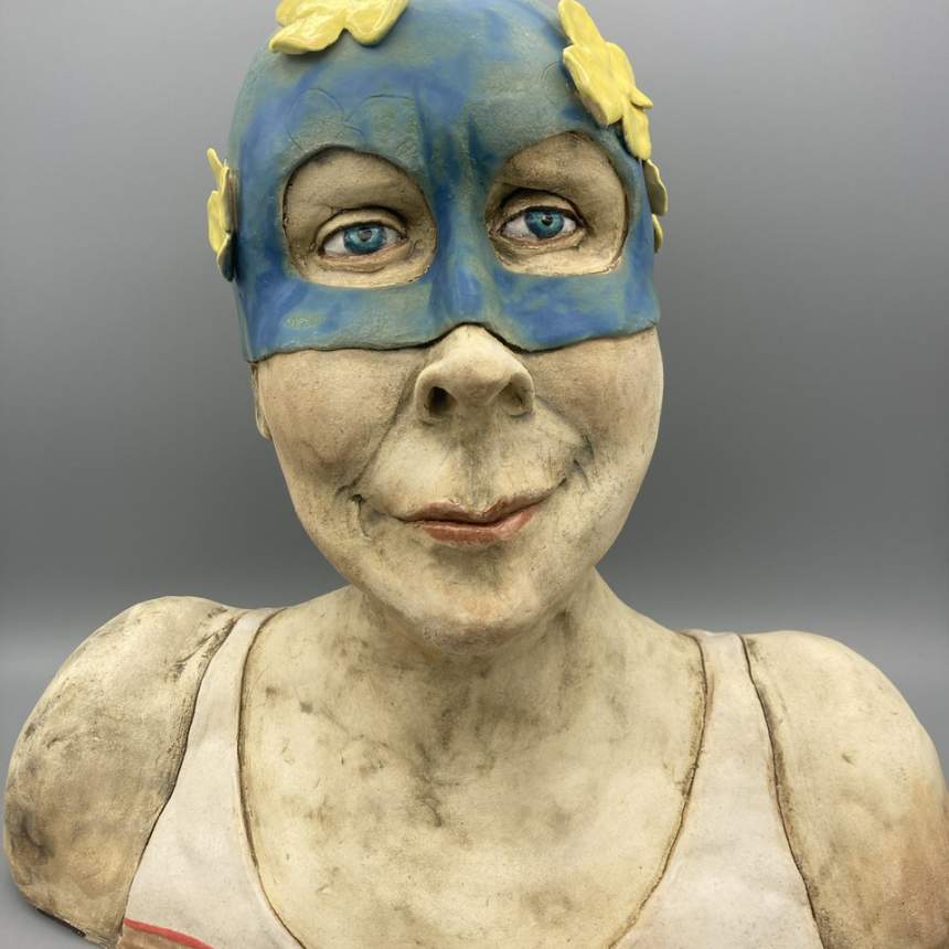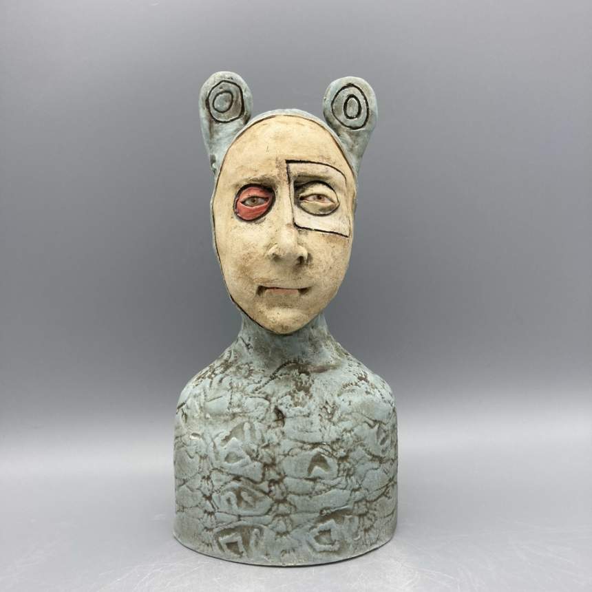 My figure sculptures were born from my love of illustration. I strive to make each figure express an emotion either through the curve of a mouth or the glint of an eye. Each figure is individually sculpted of kiln fired paper clay, and though they are not direct portraits they do hint at people I have known. My sculptures are created in small bits of time. I am attracted to gesture drawing and consider each to be a small sketch in clay. I believe my process adds to the feeling of an illustration. I see a detail in the clay that I will pull out to form a mouth or a nose then I build the face from there. Each is a unique sculpture, formed completely in the moment. I bisque fire my sculptures multiple times to layer underglazes. I am trying to achieve a feeling of watercolor and ink drawings with each piece. I will do a fine firing to cone 6 in an electric kiln.