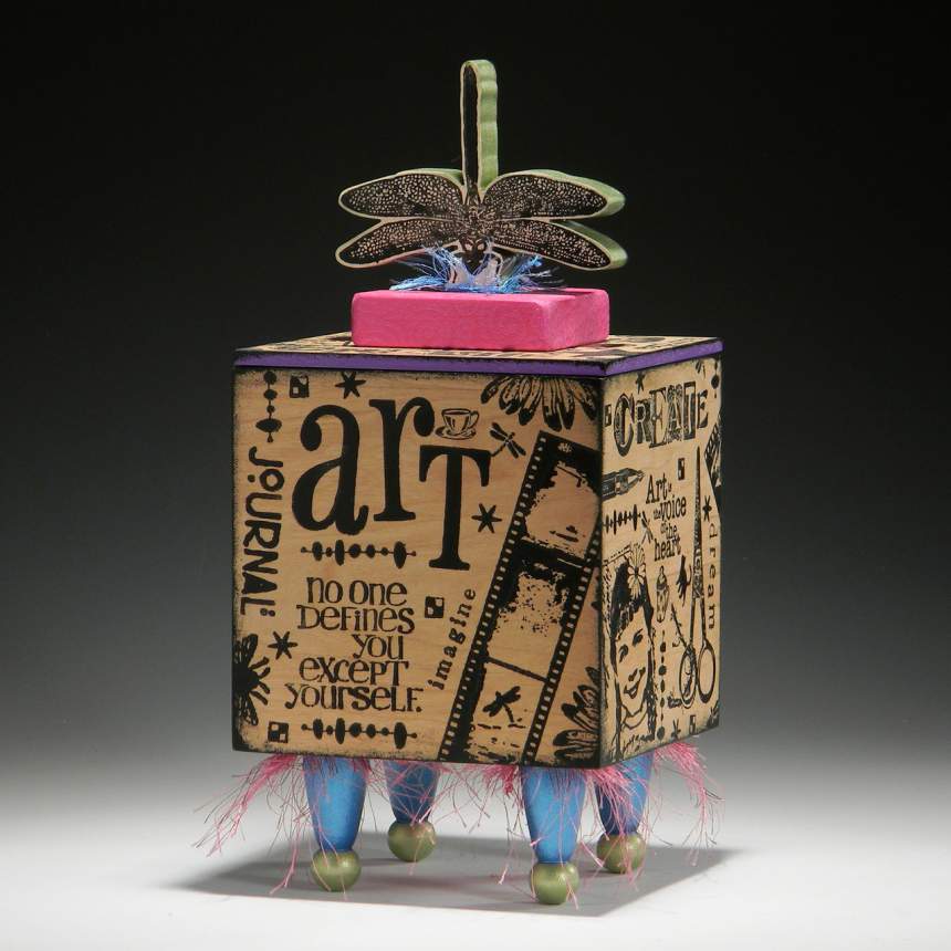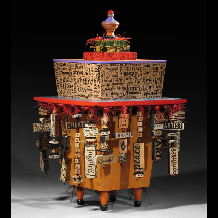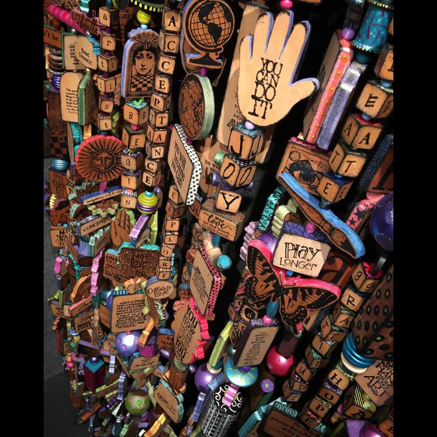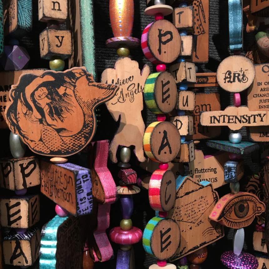 Handmade story boxes in themes of love, peace, music, art and life. These boxes come to life in this body of work looking like tattoos on wood – thus the name, TattooDreams. We are a husband and wife team working together for 30 years. Jon builds all the boxes, cutting and drilling every shape. Patricia conceives the integration of the images and phrasing as she develops the theme for each piece. She utilizes her vast collection of rubber stamps to impress the images permanently onto the wood. She uses paint, not ink, because of its depth, opacity, texture, and permanence. Our studio proudly maintains a zero-waste policy. When the wood is too small to build another box, we cut smaller beads from it to incorporate our stellar Good Karma Bead Strings – a unique beaded curtain. Even smaller cutoffs from the waste wood are set aside as kindling to fire our wood stoves for heat. Finally, the sawdust from all the woodworking is collected and used for compost.