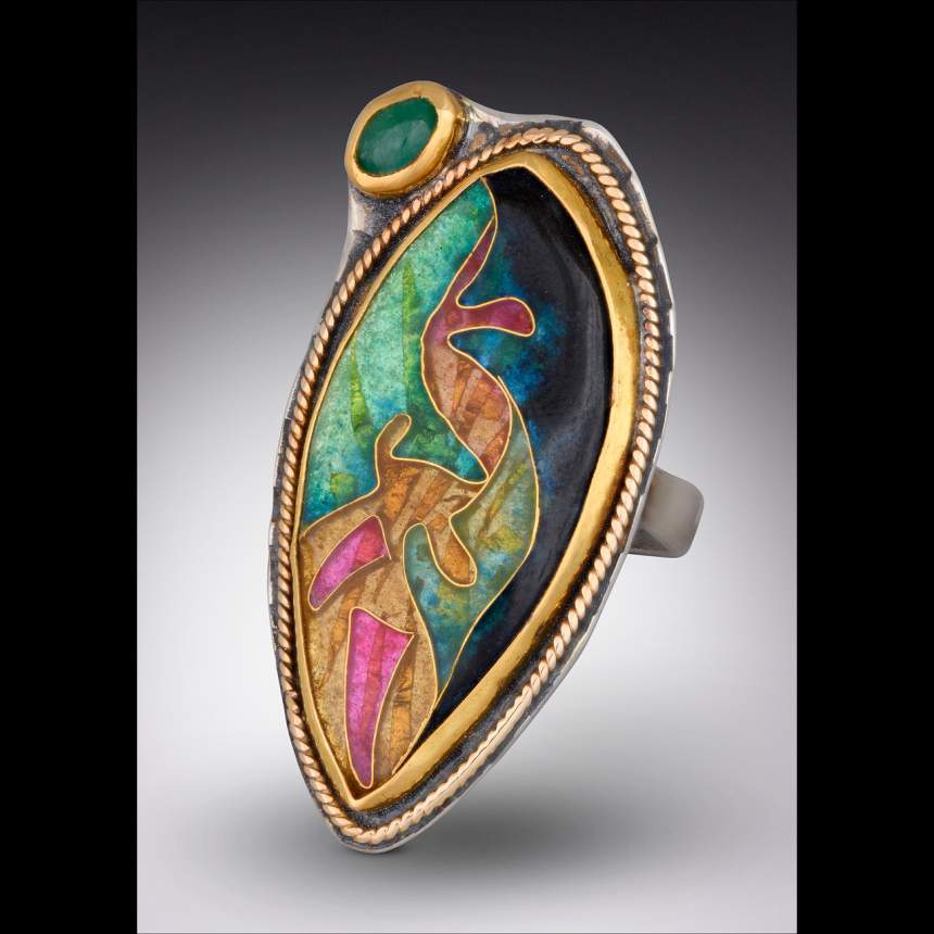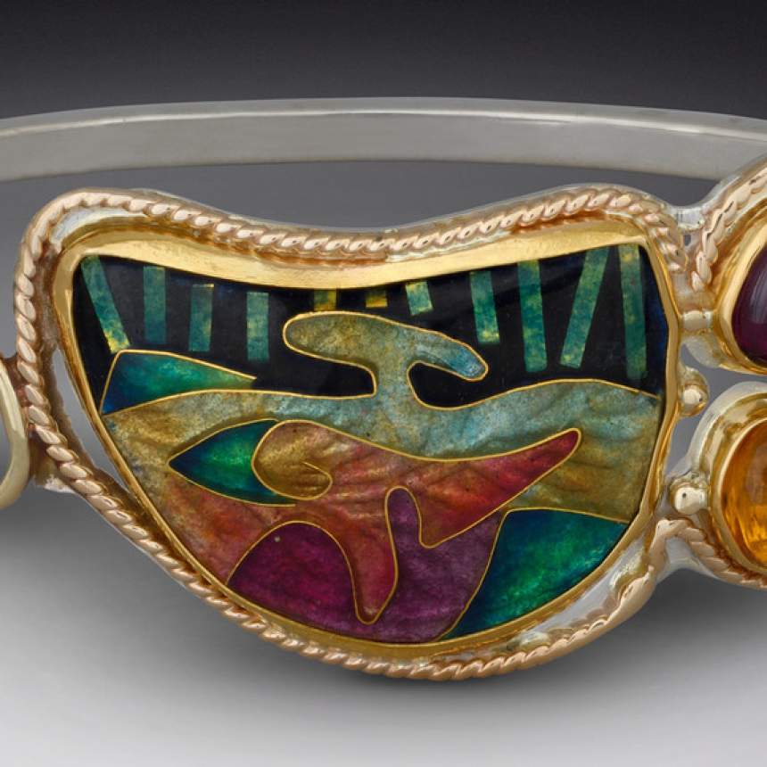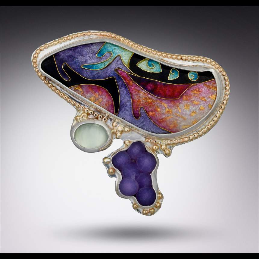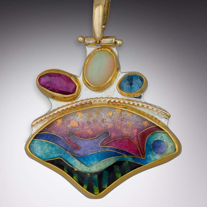 Cloisonne enamel done in translucent and opalescent enamels fired at 1400F create a world of dimension. Pure silver or gold foils are used sometimes in the layers. I use stones for inspiration and I love stones nature creates.. Each piece is a unique painting of metal enamel glaze fired at 1400 By building color and I use the unusual shapes to paint in glass layers complementing them.