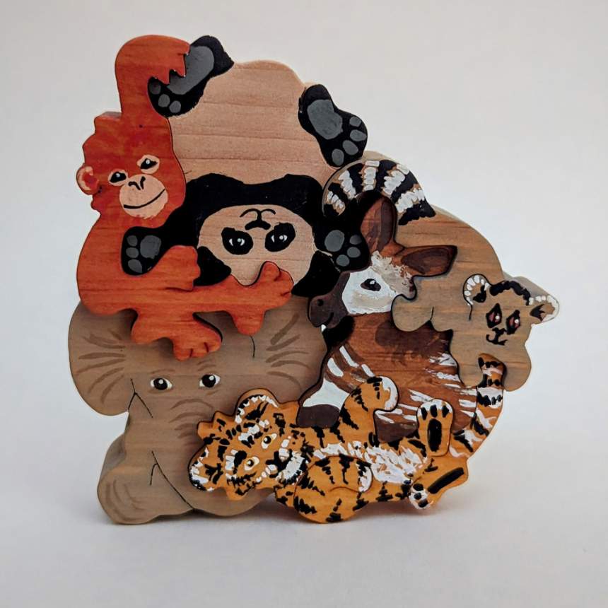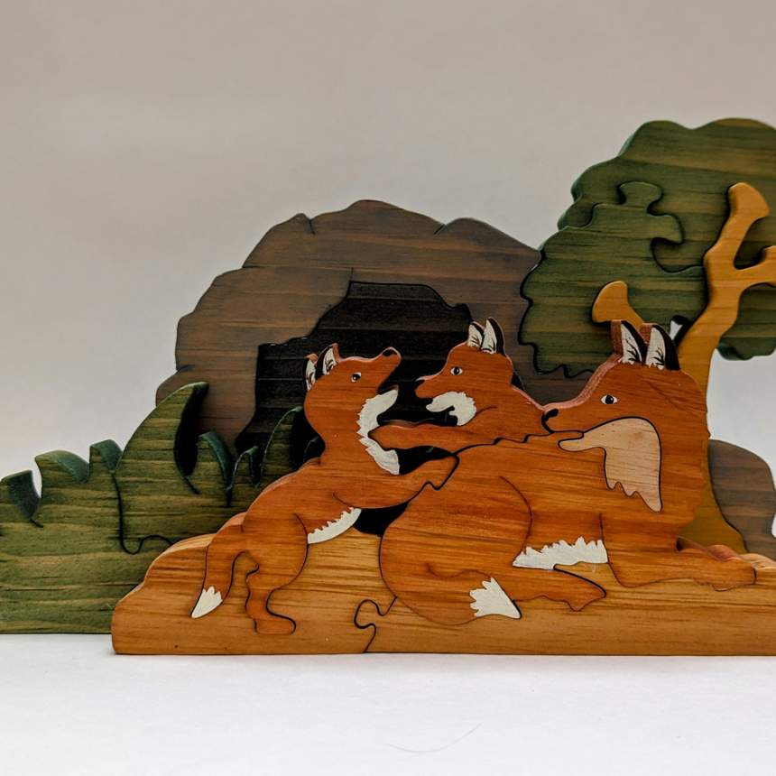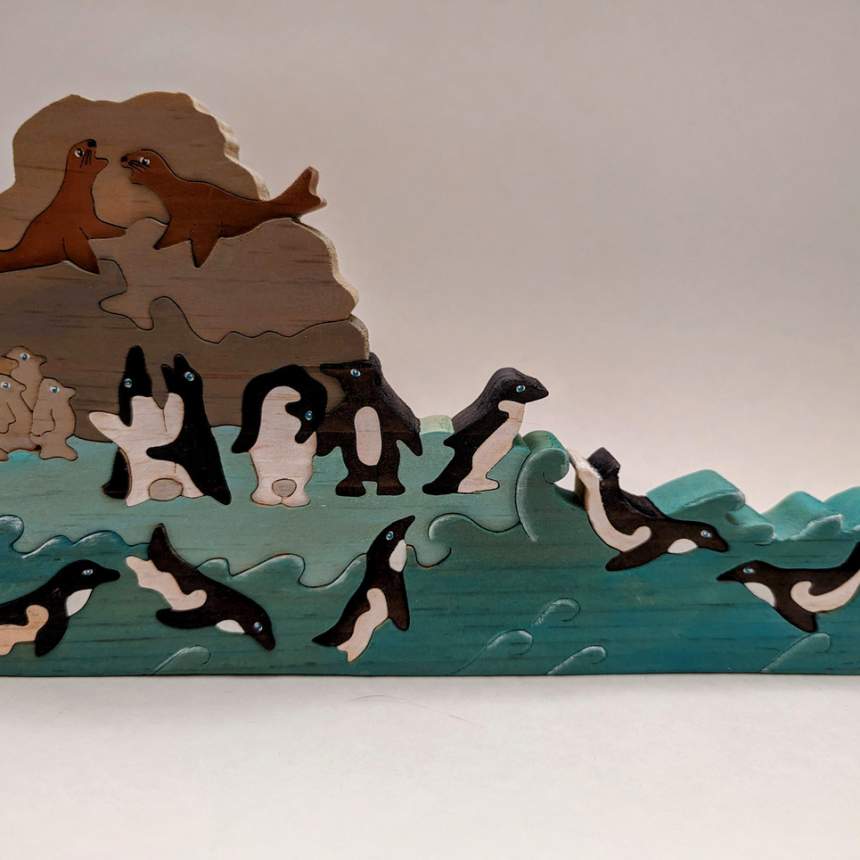 Creating unique and original art puzzles has been our passion since 1984. All of our work is individually cut by hand on a scroll saw, sanded, stained and painted. To share both new and treasured designs continues to bring joy to our hearts. With respect to our Natural world as well as human kind, our work is safe and non-toxic. This year’s images reflect our love of nature. We use color, design and imagination to bring our puzzles to life.