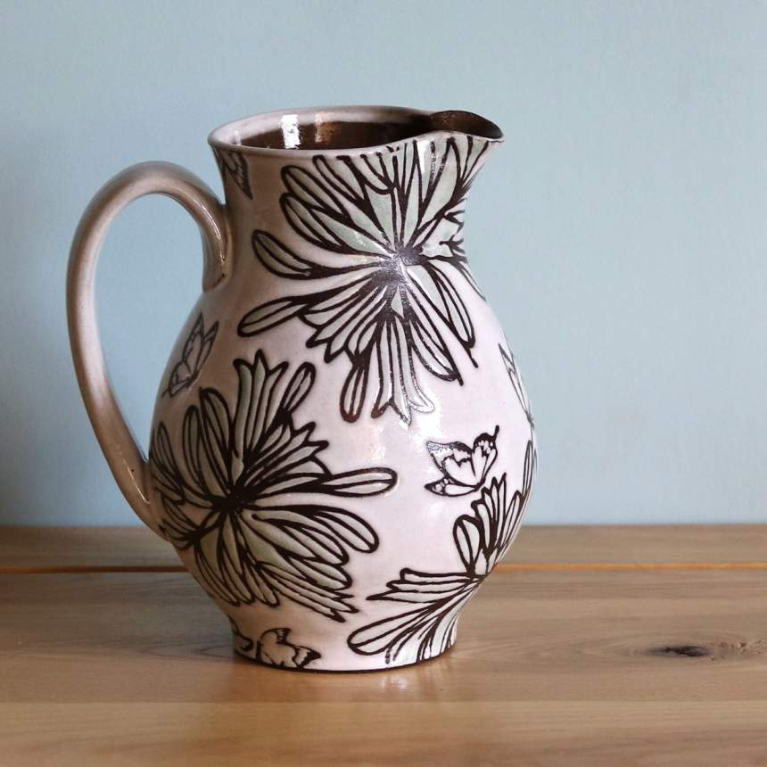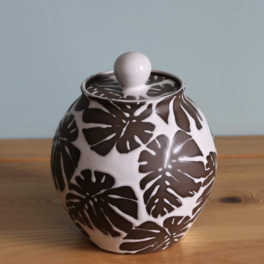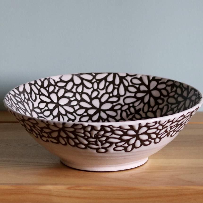 I’m interested in how the use of imagery and pattern can connect a person to a piece of pottery. While designing my work, I look to home décor themes; Eclectic, Bohemian, Mid-century, Cottage Core and Contemporary styles help to inform my ideas about making pottery for the home. I've chosen to throw with dark-brown stoneware because it’s equally rich with or without glaze allowing me to create pattern in unglazed areas. Using glaze resist techniques, I create layers of color and pattern on each surface. I'm partial to botanical and geometric patterns, black and white, high-gloss transparent glazes, jewel tones, muted colors and bare clay. I often integrate these design essentials into my work. A piece is successful when the glaze fluctuates effortlessly throughout the form. Lockwood Ceramics offers a variety of products including vases, bowls, platters, lamps, cabinet hardware, spoon rests, sponge holders, soap dispensers, bottles, jars, garlic keepers, and mugs.