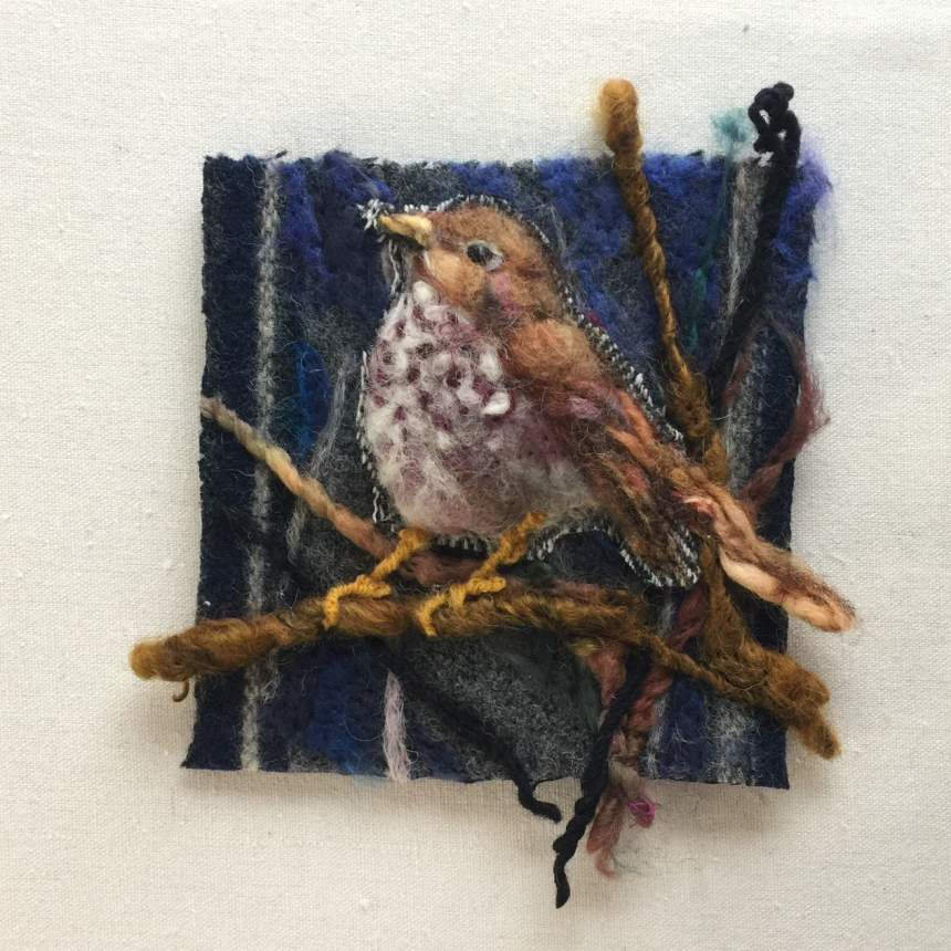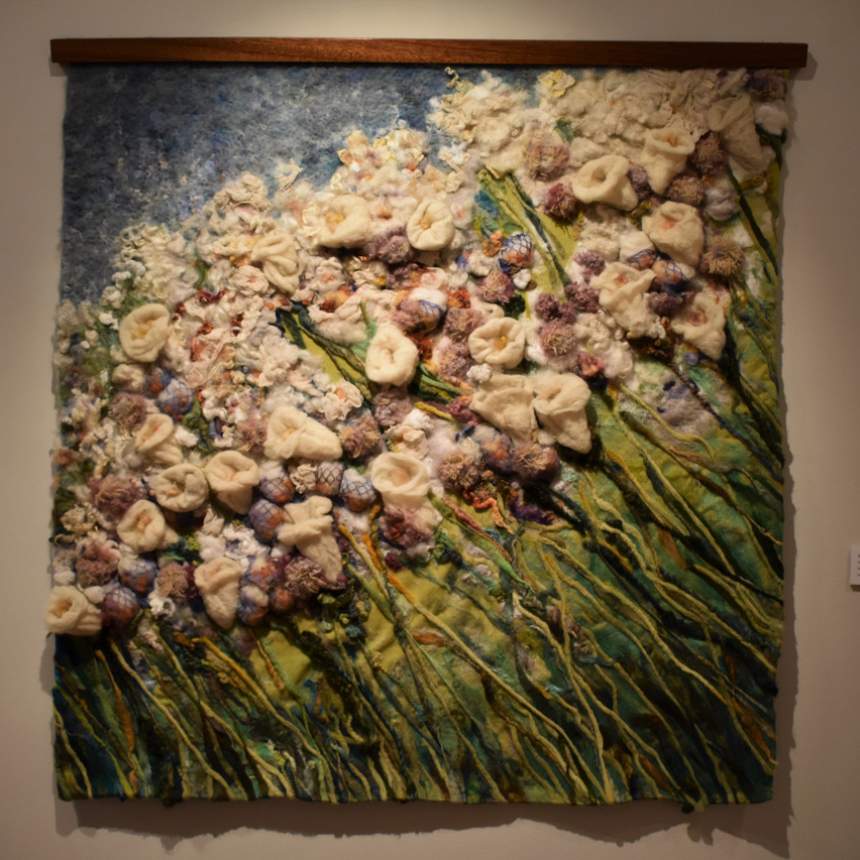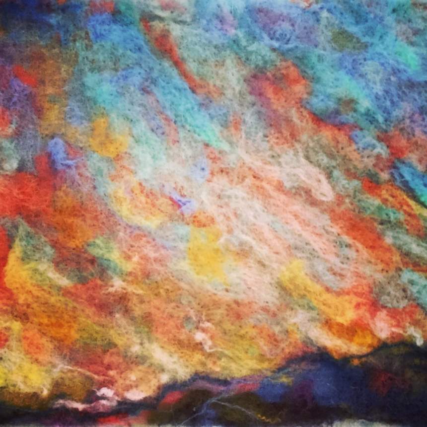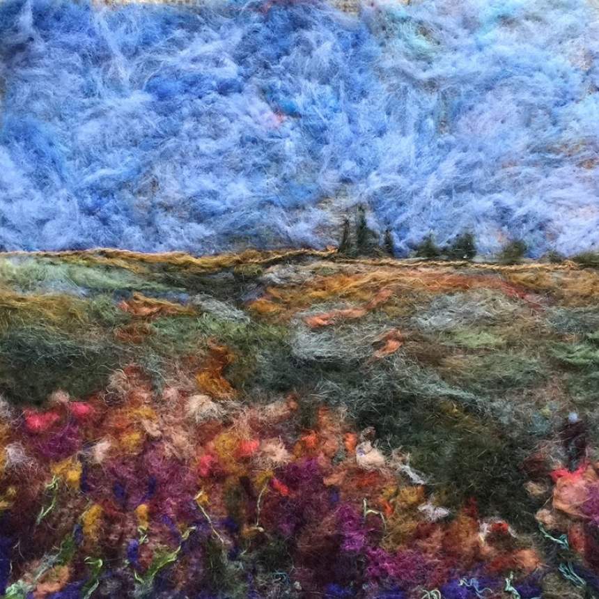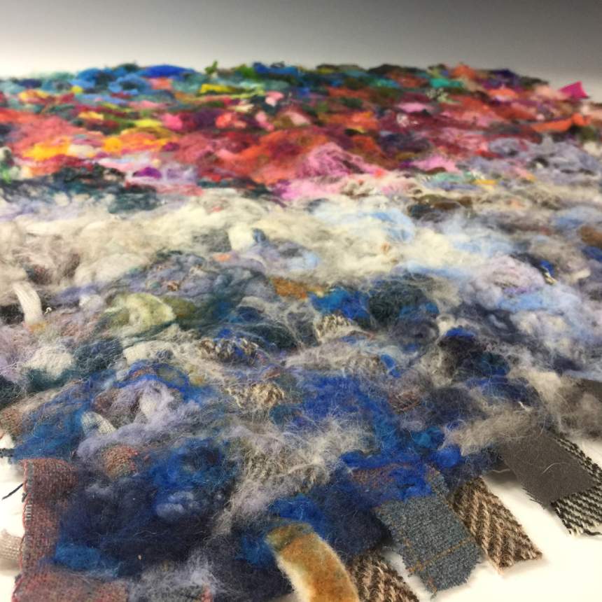 I enjoy the process of taking fibers from their raw state and reworking them into a palette of lustrous vibrant silks and woolen vibrant tones. When I construct, I layer my hand worked fleeces and roving onto reclaimed textiles. This process creates a type of contemporary tapestry, bringing a three-dimensional element to my impressionistic work.