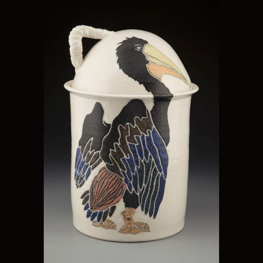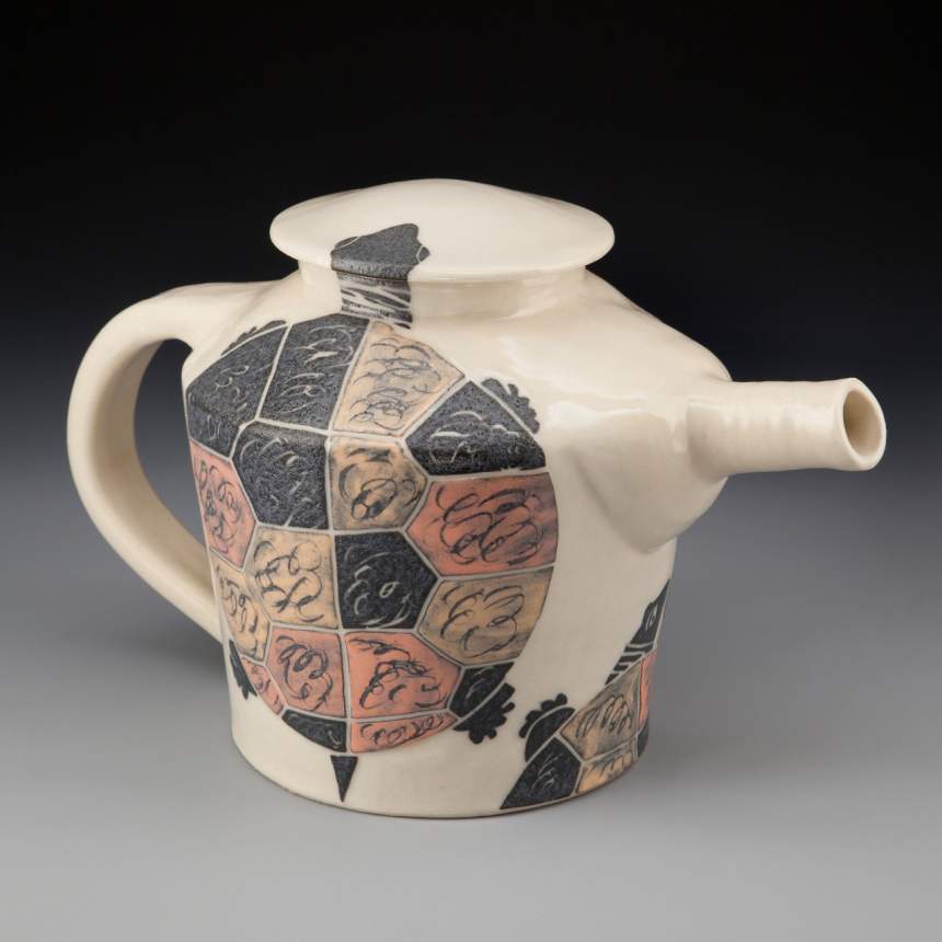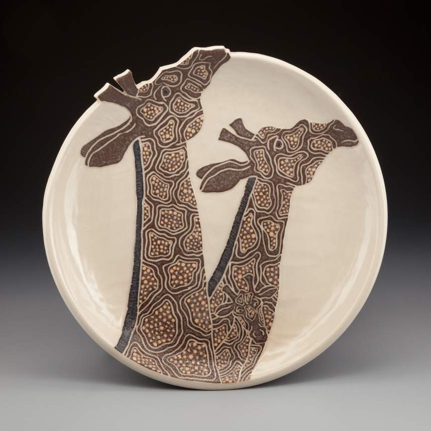 Functional wheel thrown porcelain with engobe and sgraffito surface decoration, underglazes and glazes.