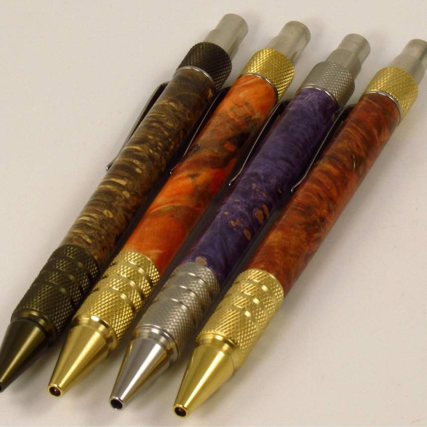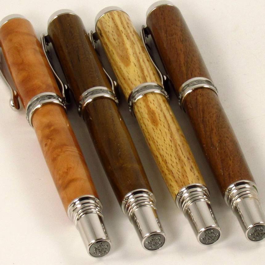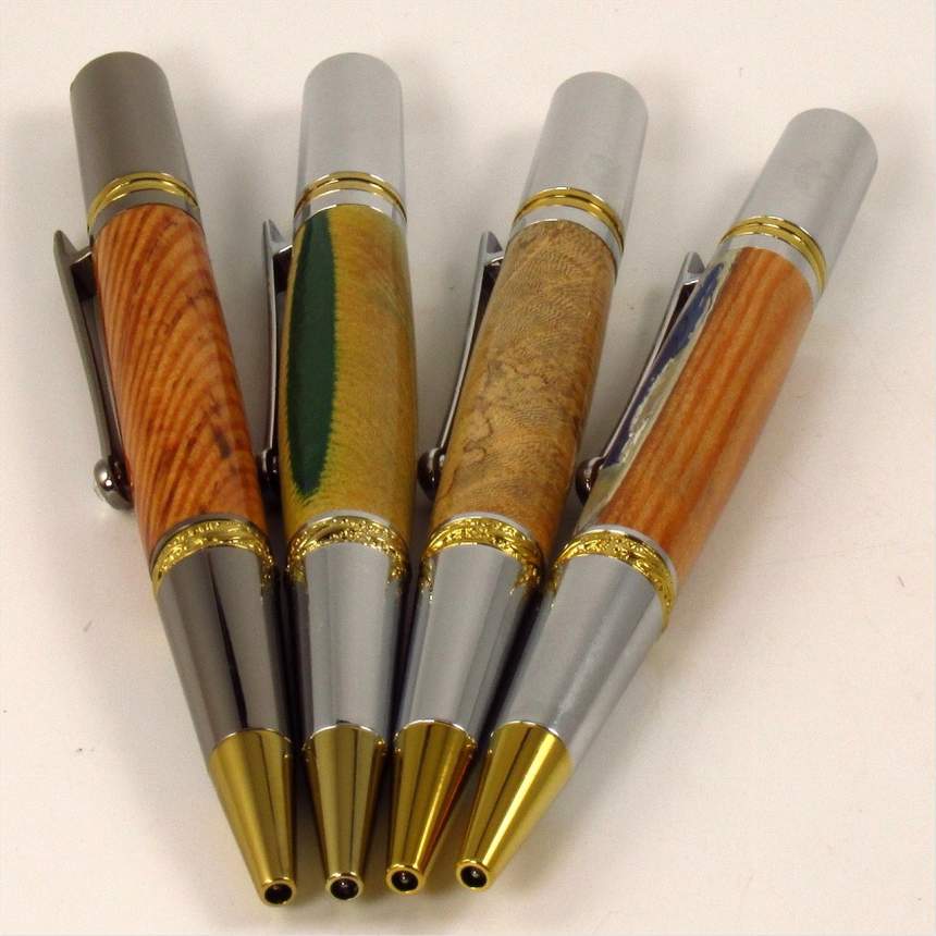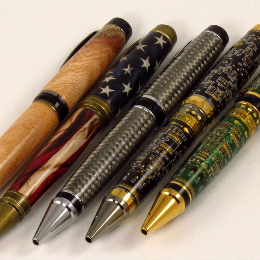 Unique handturned pens & pencils created from exotic woods, colorful resins and various items cast in resin. Materials are sourced from all over the world. I have started to work with historical woods including: stadium seats, presidential homes, and other places of interest. Pens begin with a wood or resin blank that is cut to length, prepared for turning, rough shaped on one lathe, final shaping and finishing is completed on another lathe. A multi-step polishing process is completed and then final assembly.