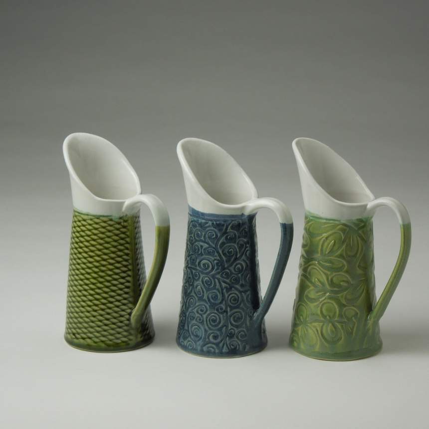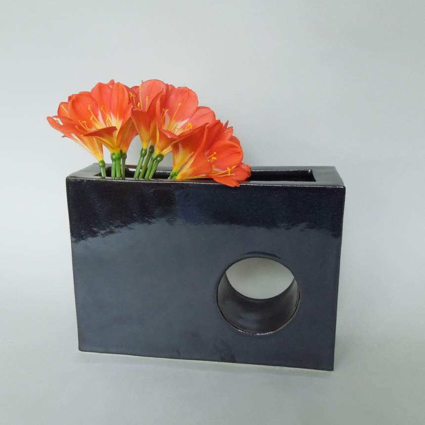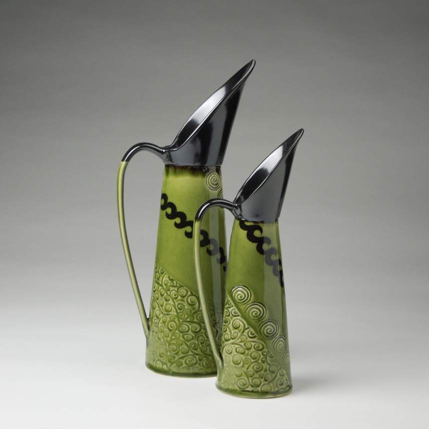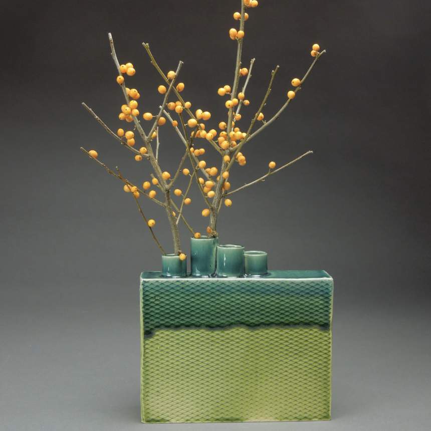 Some time ago, I realized I preferred hand building to throwing pots on the wheel. I like the intellectual process of conceiving a form, working it out in clay, creating a template for the pieces that are needed, and then putting the pieces together to make the pot. Using slabs allows me to decorate the surfaces with embossing, stamping and slip before I build the pot. This additive process inspires endless shapes and gets me away from always working in the round. Building the pieces becomes a meditative process and I love working quietly in my studio. Most of my influences come from the man-made world. I am particularly fond of Chinese bronzes and Asian ceramics. Their spare silhouettes are clear and strong and seem to have an inner peace. This love of simplicity and clean lines informs all my work. Having people appreciate or even buy my work is inspiring and encourages me to keep inventing pots.