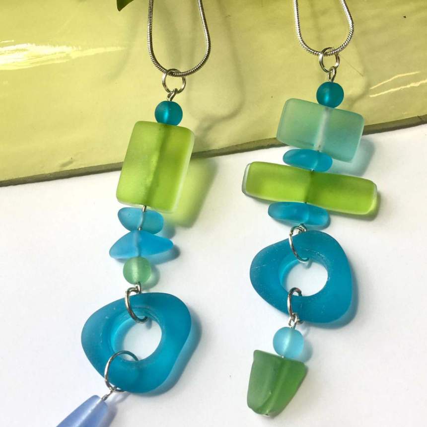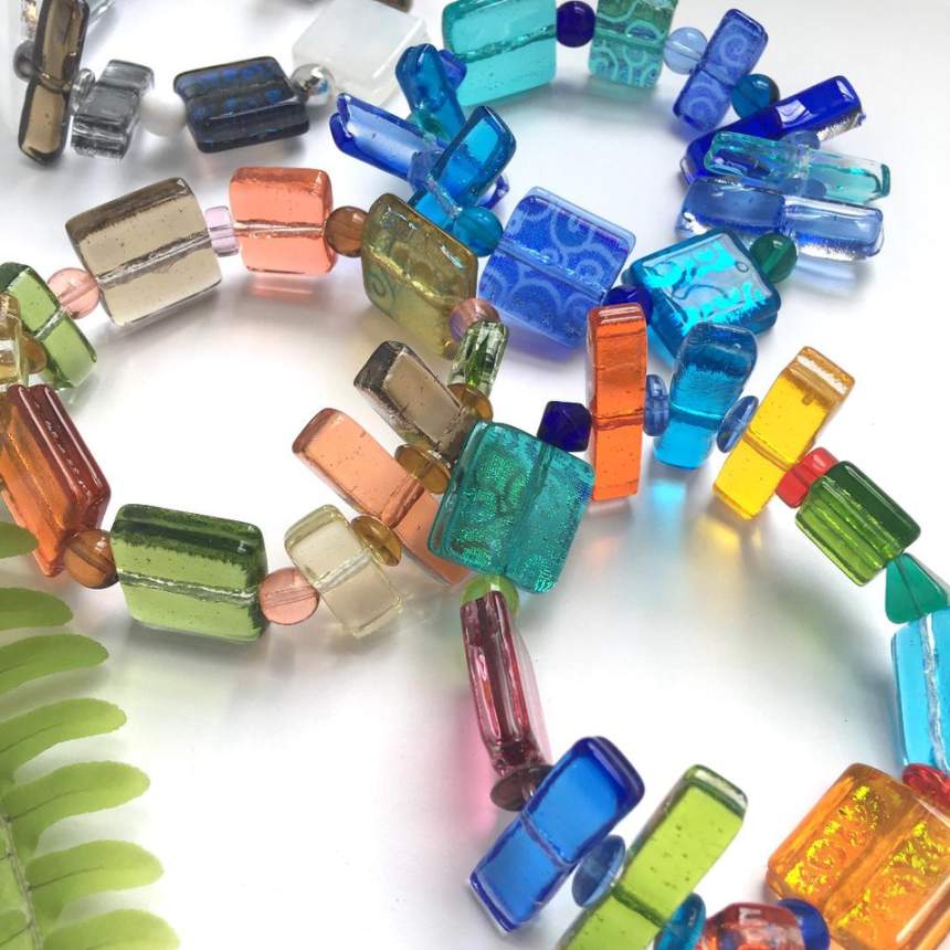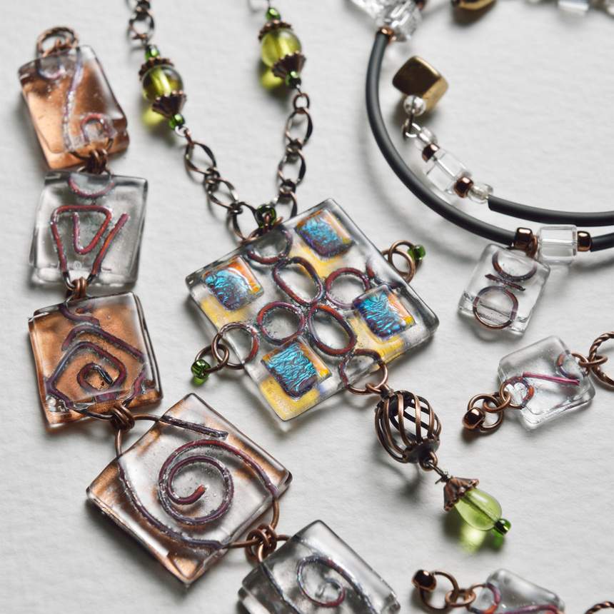 We design fused glass jewelry. The collection includes earrings, necklaces, bracelets and rings. We create custom templates to hand cut large sheets of colored art glass to the shapes we need and all scrap is used to "mosaic" our unique focal point necklaces. All the jewelry pieces are hand composed and fired in a glass kiln, some numerous times, to 1350+ degrees. Laura draws patterns which are custom etched on dicroic glass to create special effects. Some of the different collection pieces are worked "cold" -using drills, saws and acid etching. We are constantly pushing ourselves to try new techniques and enjoy experimenting with both new materials and techniques.