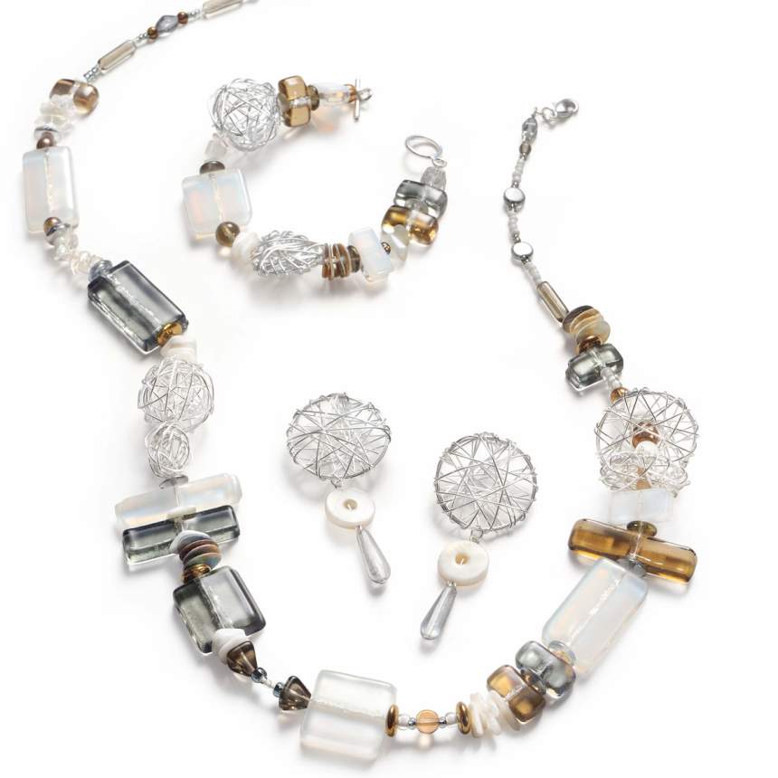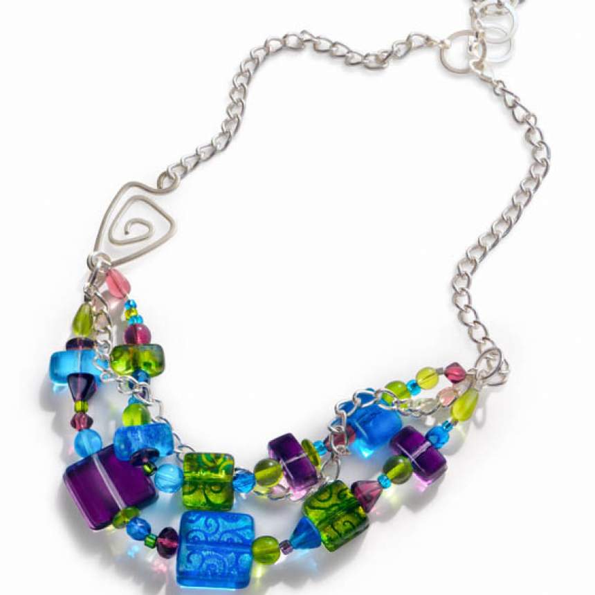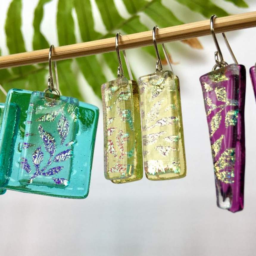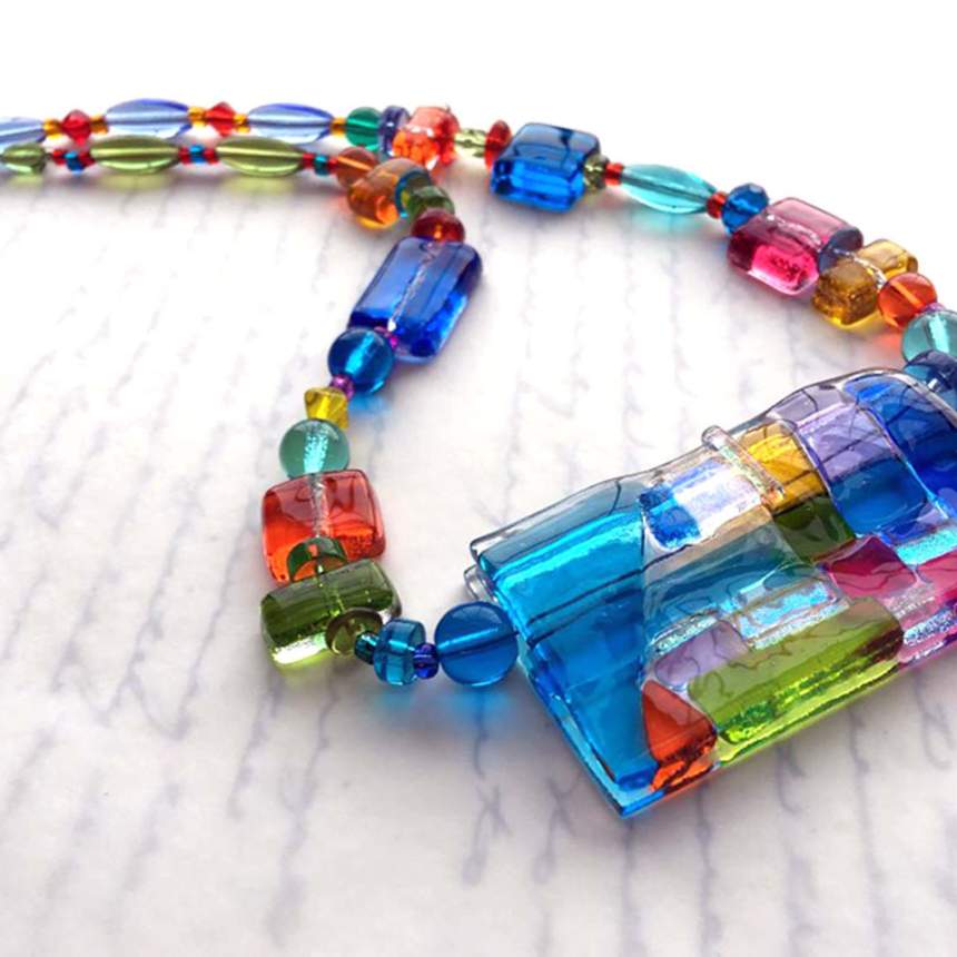 I have handcrafted jewelry for over 30 years. This glass collection is all about color! The collection is comprised of over 10 color stories (designed with over 25 colors), each in over 12 styles. Each piece of glass is hand cut, composed and fired in a kiln to about 1400 degrees. There are a number of cold working techniques used as well, including wet sawing, wet drilling, polishing and bead stringing. Most pieces have dichroic accents and we use some in house custom designed dichroic patterns. We have always prided ourselves in creating quality, unique, colorful and affordable jewelry- something for everyone and every pocketbook. This collection is fun and classic!