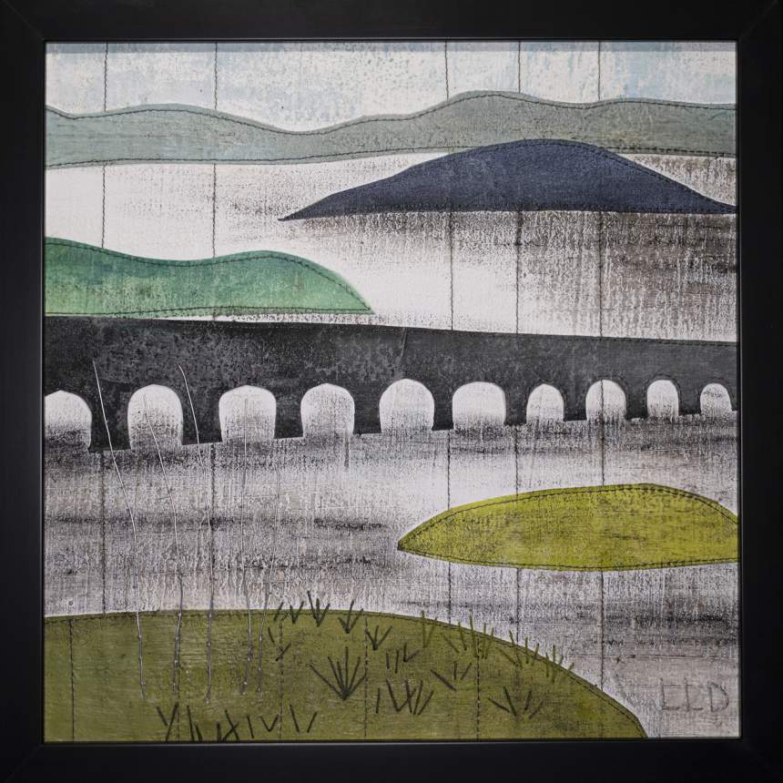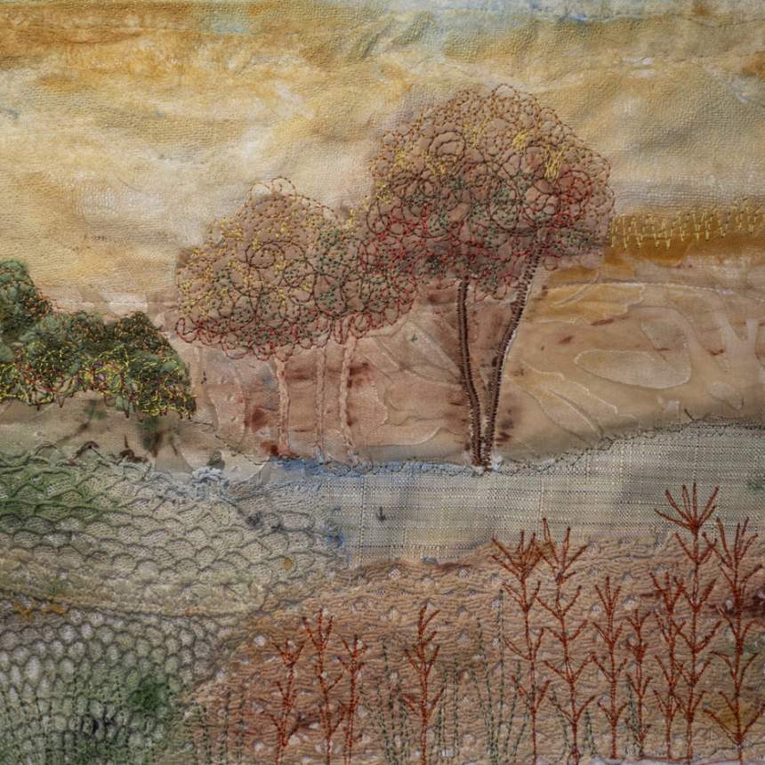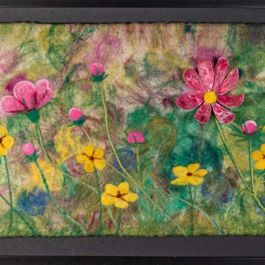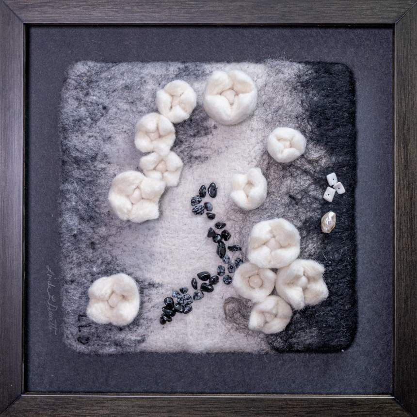 I work with natural fibers and fabrics to create mixed media textile wall art. My new wet felted work combines a colorful wool base with dimensional additions made with steel wire, natural dyed silk and wax. My encaustic textile collages start with vintage cotton, linen and lace that I source from antique shops. I paint the fabrics, cut, collage and stitch the composition. I brush on molten encaustic wax. When it cools I carve into the wax and rub in oil paint to enhance the texture and details. (sgraffito) Finishing touches are added with steel or copper wire and hand embroidery. Some works are not waxed and instead presented under glass.