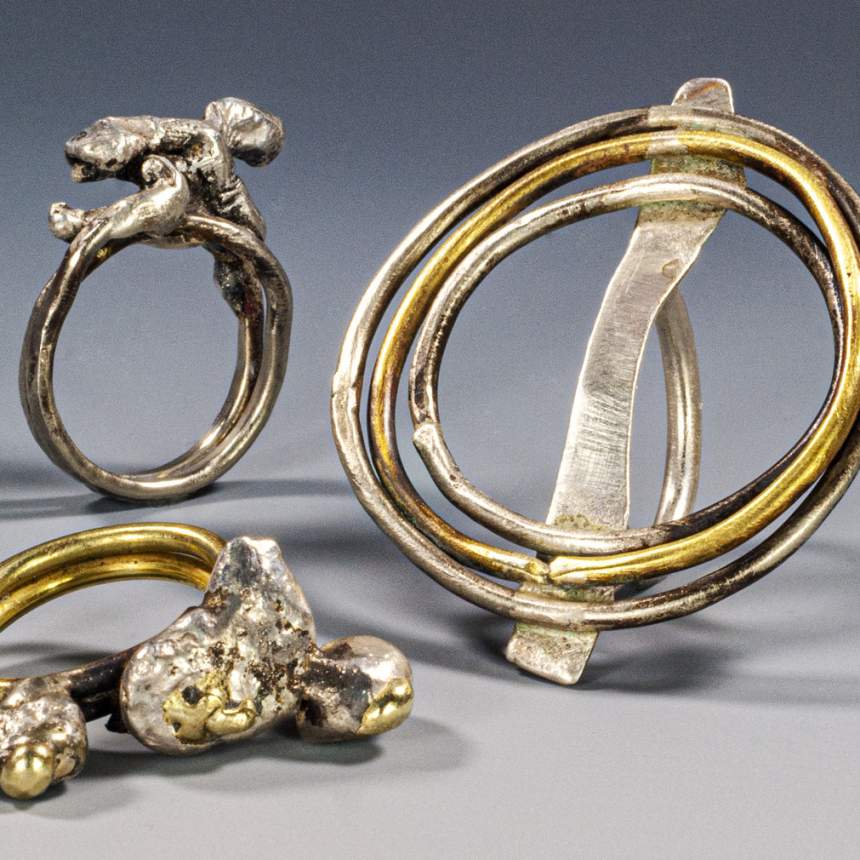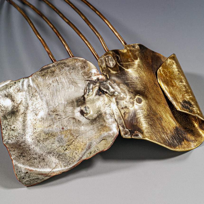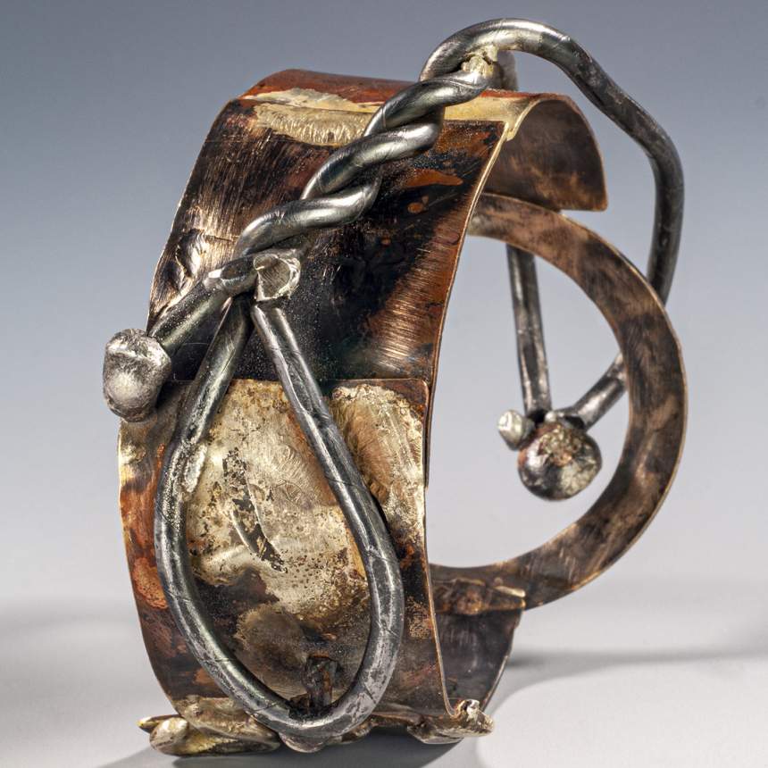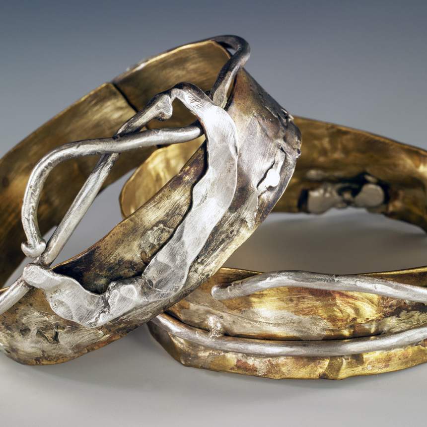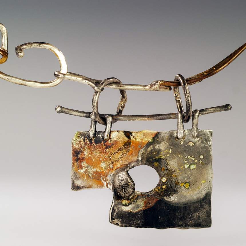 One of a kind jewelry. Forged, fused, chased, soldered, riveted, patinated sterling silver, 18K gold, brass, copper and iron. Fabricated by hand, torch & hammer. We make our own neck rings, closures and earring hooks/posts.