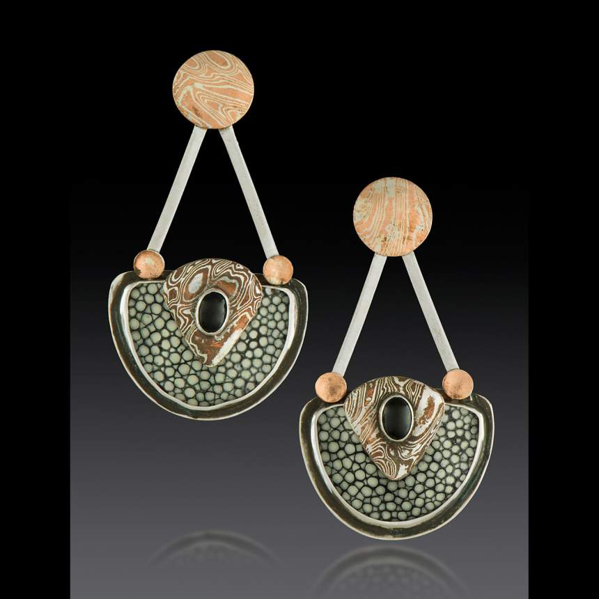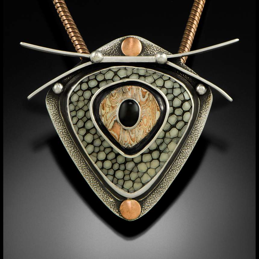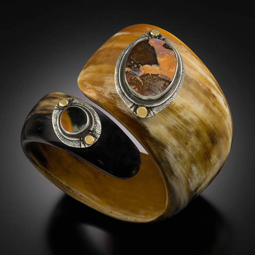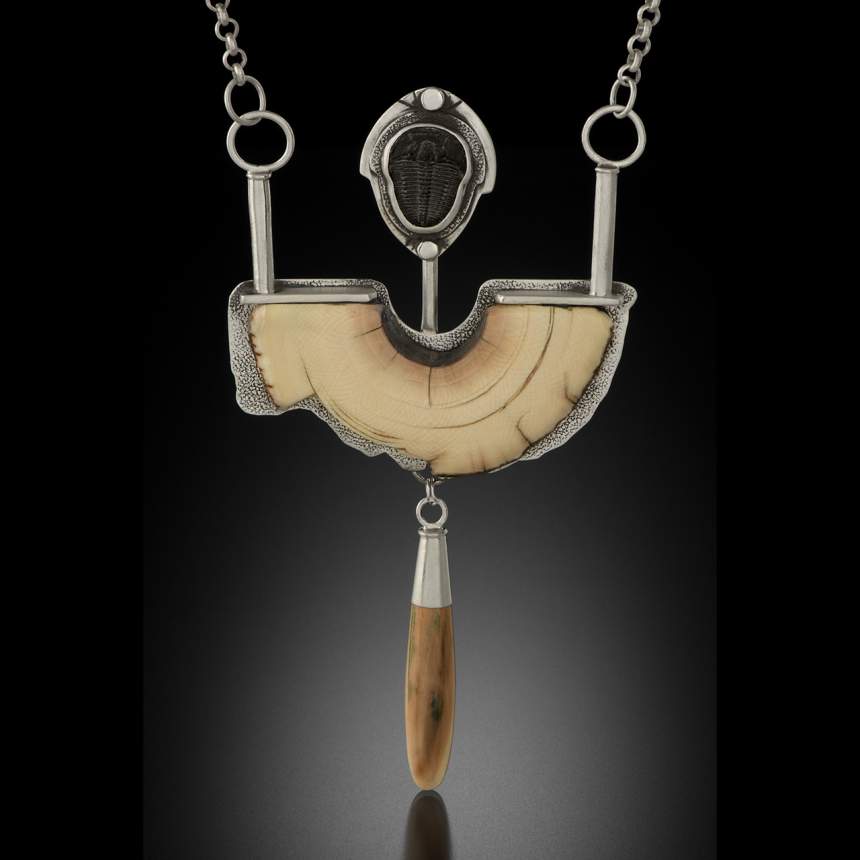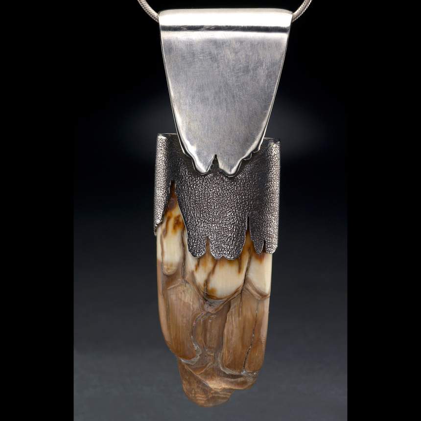 My art jewelry pieces are made using natural recycled materials from all over the world, not limited to but including fossil tusk material,shed antler,stingray leather,horn,seed pods and ancient fossils. These materials are combined with precious metals settings .Techniques used are; Hand building,texturing,oxidizing reprouse' and polishing.I also cut and polish most of my stones and fossil material.
