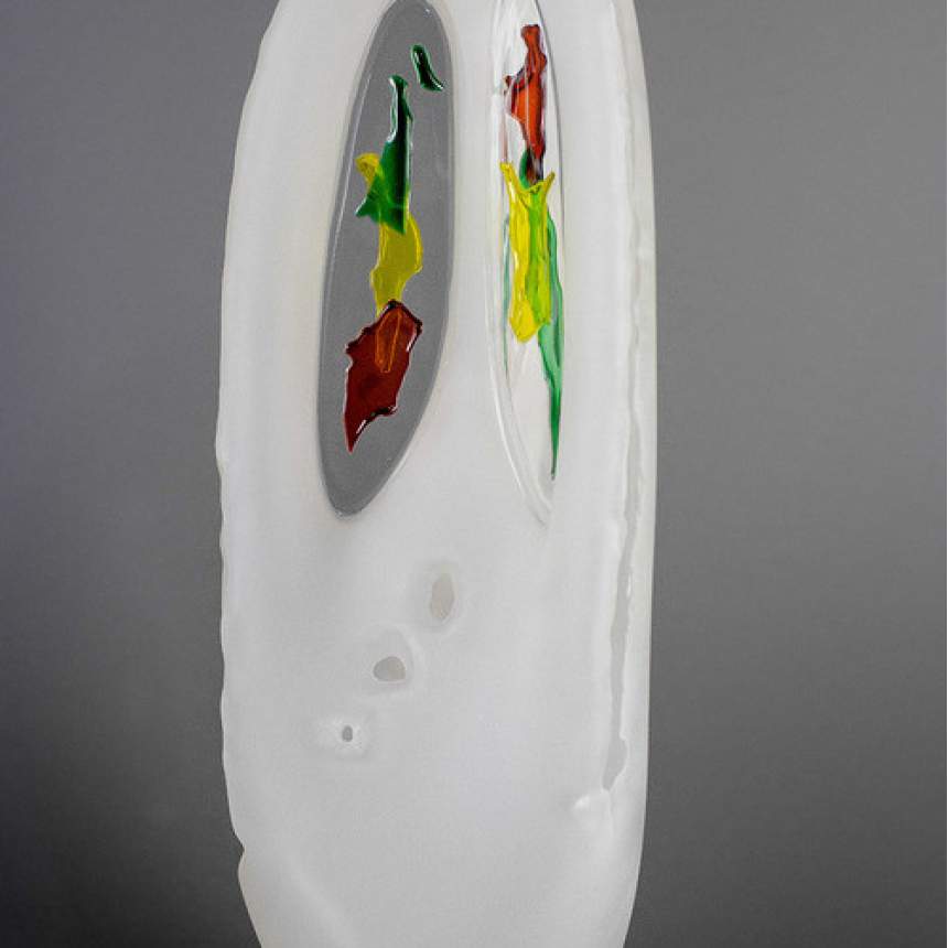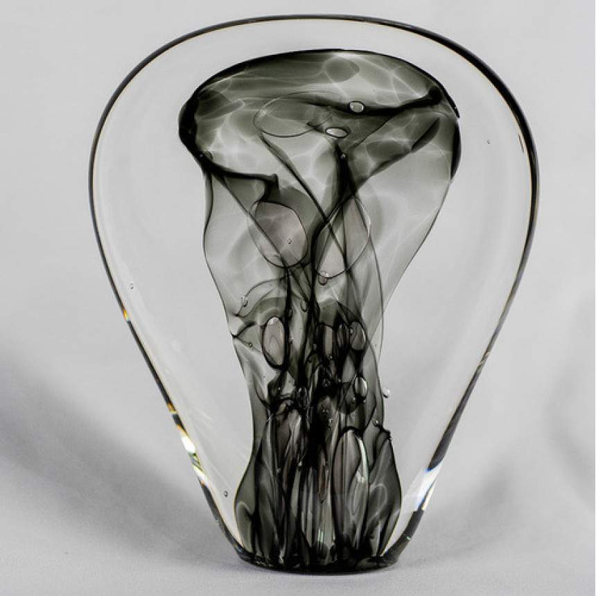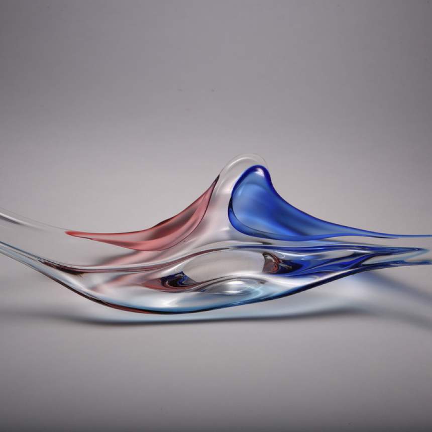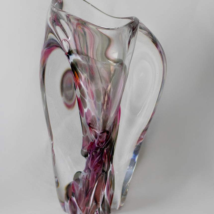 My glass is blown cast and steamed. It can be functional decorative and sculptural. I love to add bits of transparent colors to accent the mostly crystal forms. I also sandblast into some of my crystal forms to create very organic semi crystal and sandblasted sculptures.