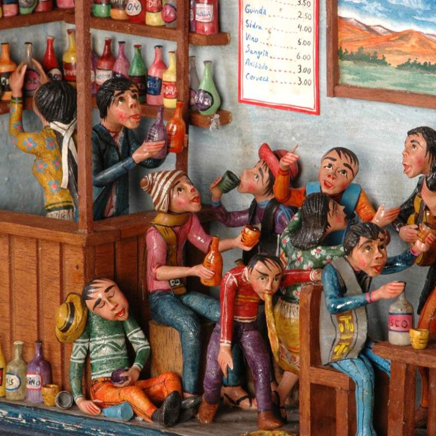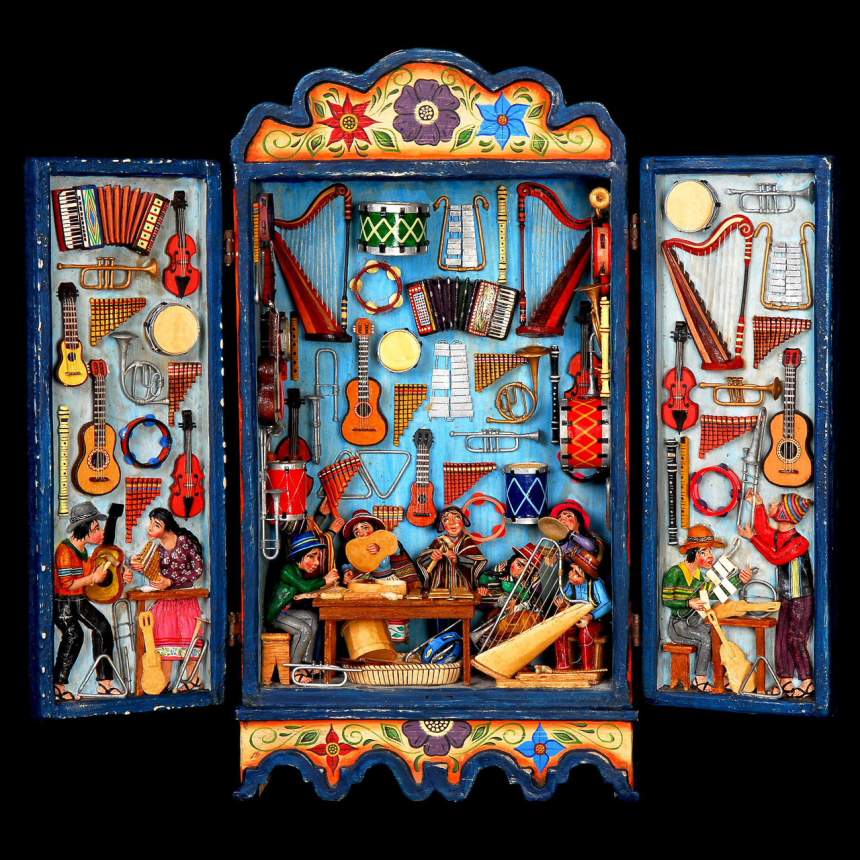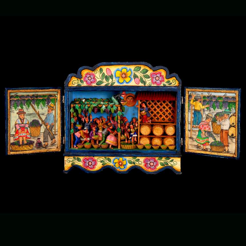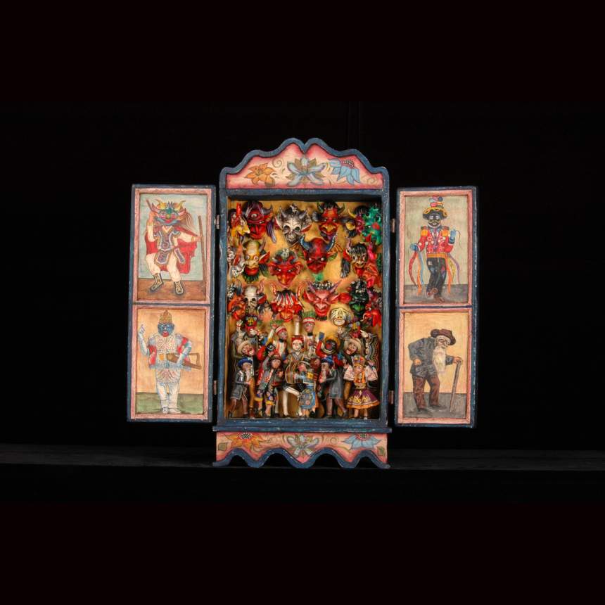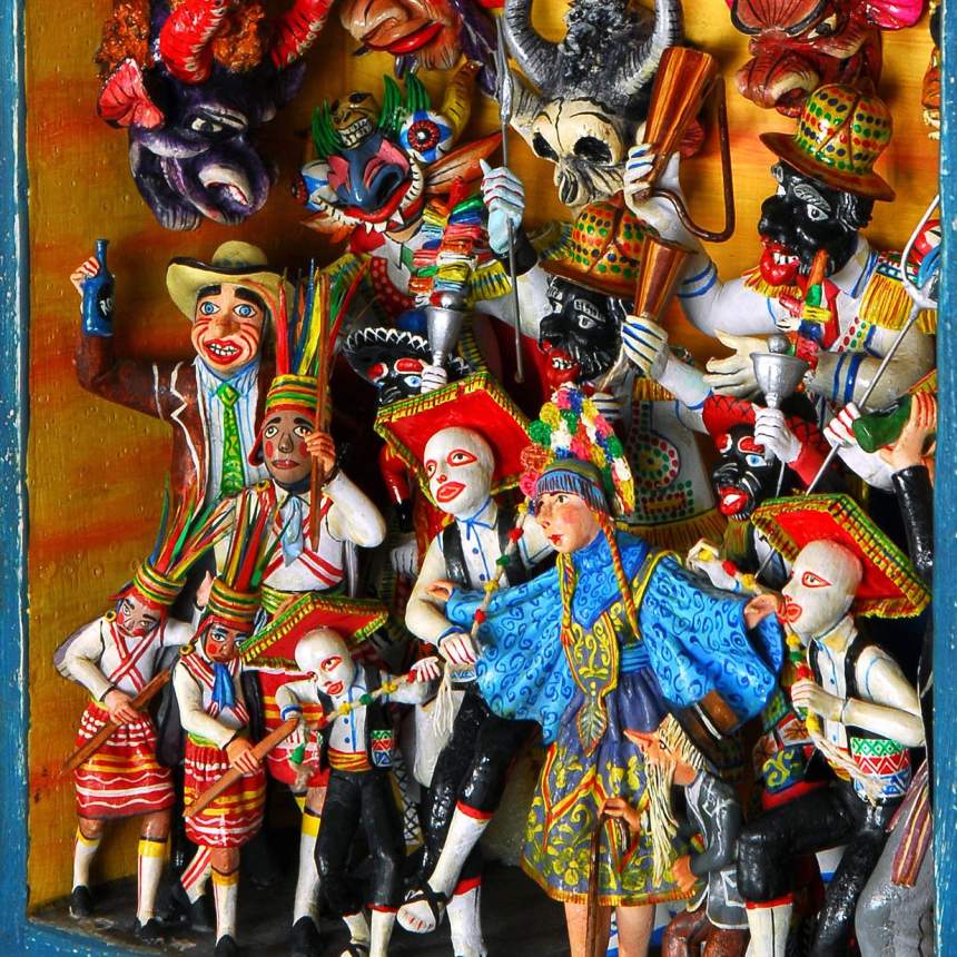 Retablos are portable wooden boxes filled with handmade colored figurines sculpted from a doughy mixture of boiled potato and plaster. My only tools are a small piece of wood resembling an enlarged toothpick and a knife. My compositions depicts historical, political, and everyday life events.