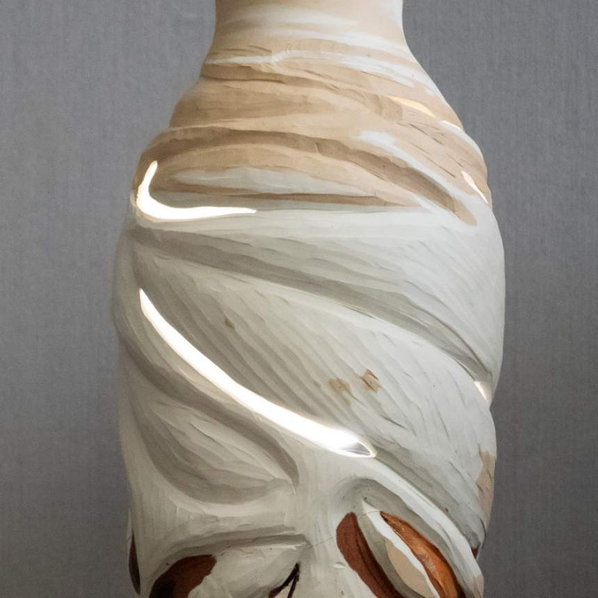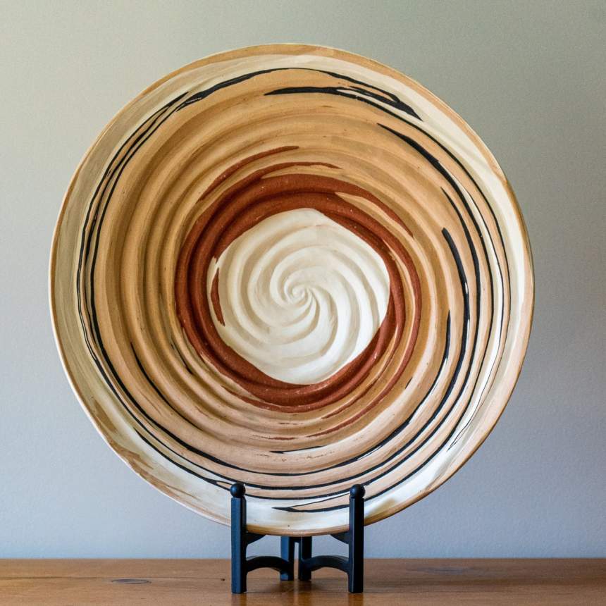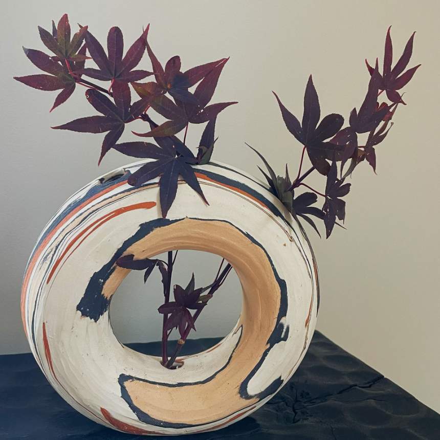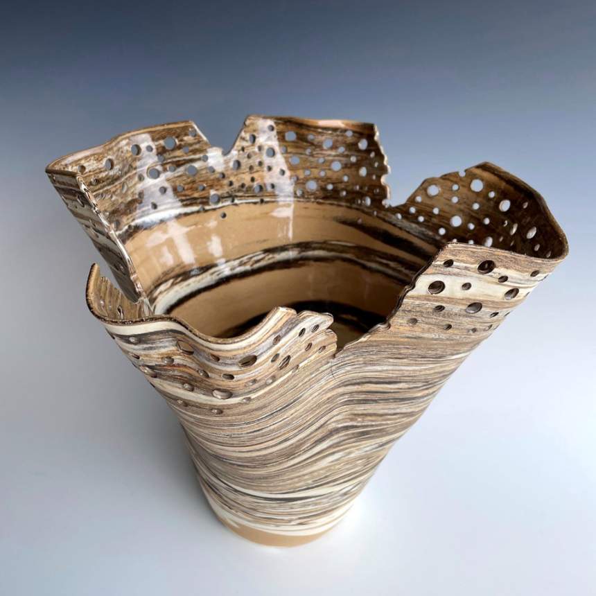 My work invites a tactile experience, celebrating the natural beauty of clay through contrast, depth, and the interplay of light and shadow. I work with natural stoneware clays, layering different bodies that vary in both color and texture to create a striking visual and tactile effect. My pieces are wheel-thrown and mid-fired with unique firing adjustments that maximize the dramatic color potential of the clay. I leave exterior surfaces unglazed to preserve the raw material and emphasize its organic variations. Carving is central to my process, from deep, flowing cuts that create movement to open sections that interact with light and shadow. My freeform vessels, shaped through a process influenced by glassblowing, capture a fluidity not often seen in ceramics. With nearly four decades of experience, I balance technical precision with spontaneity, allowing the material to guide each piece’s final form.