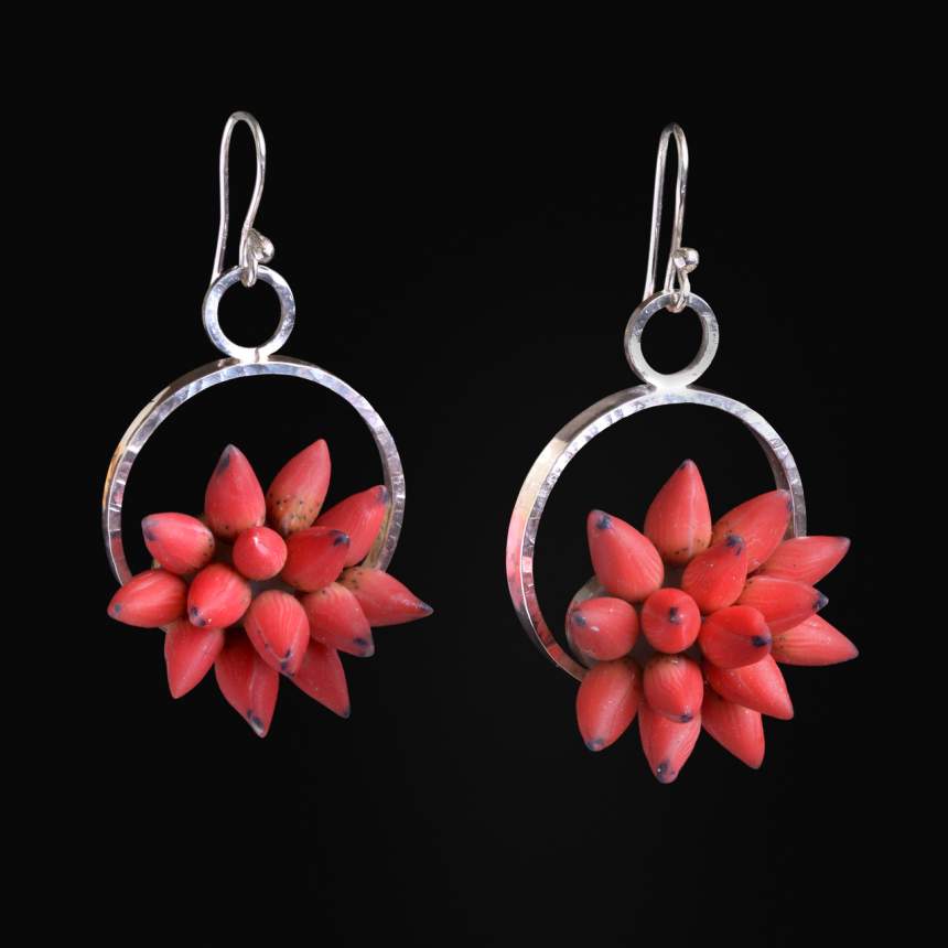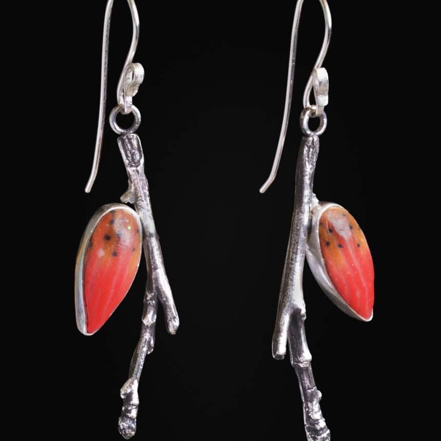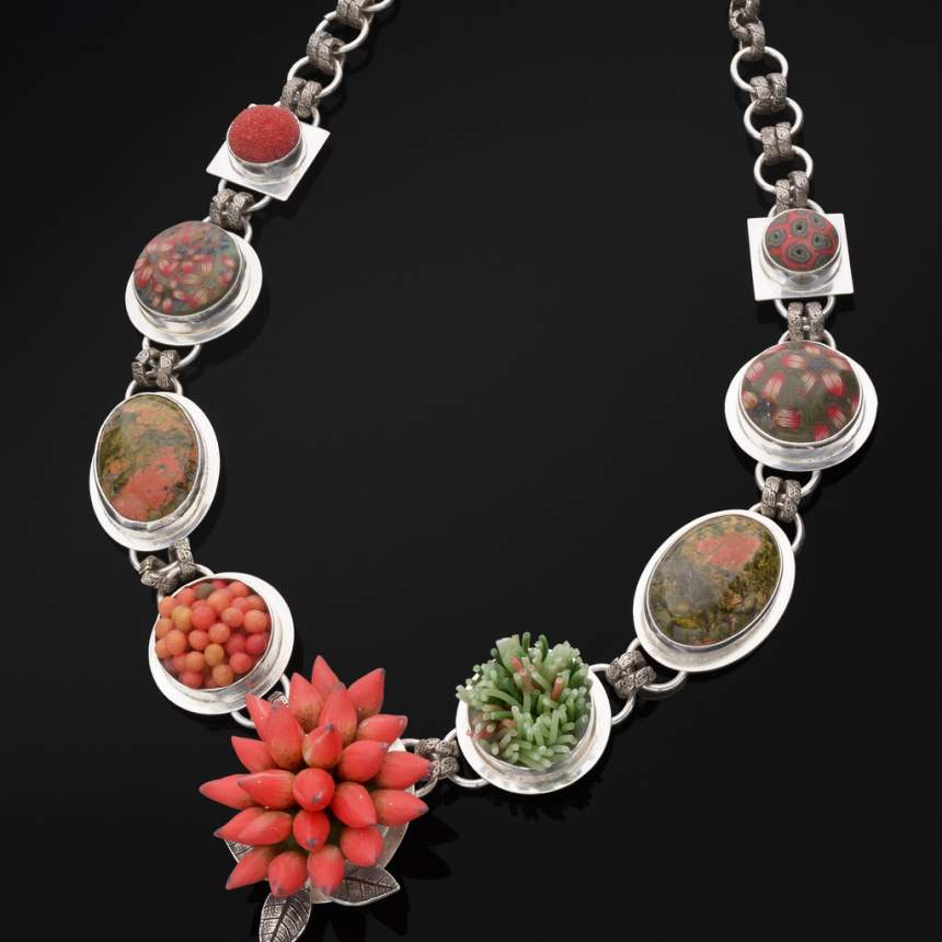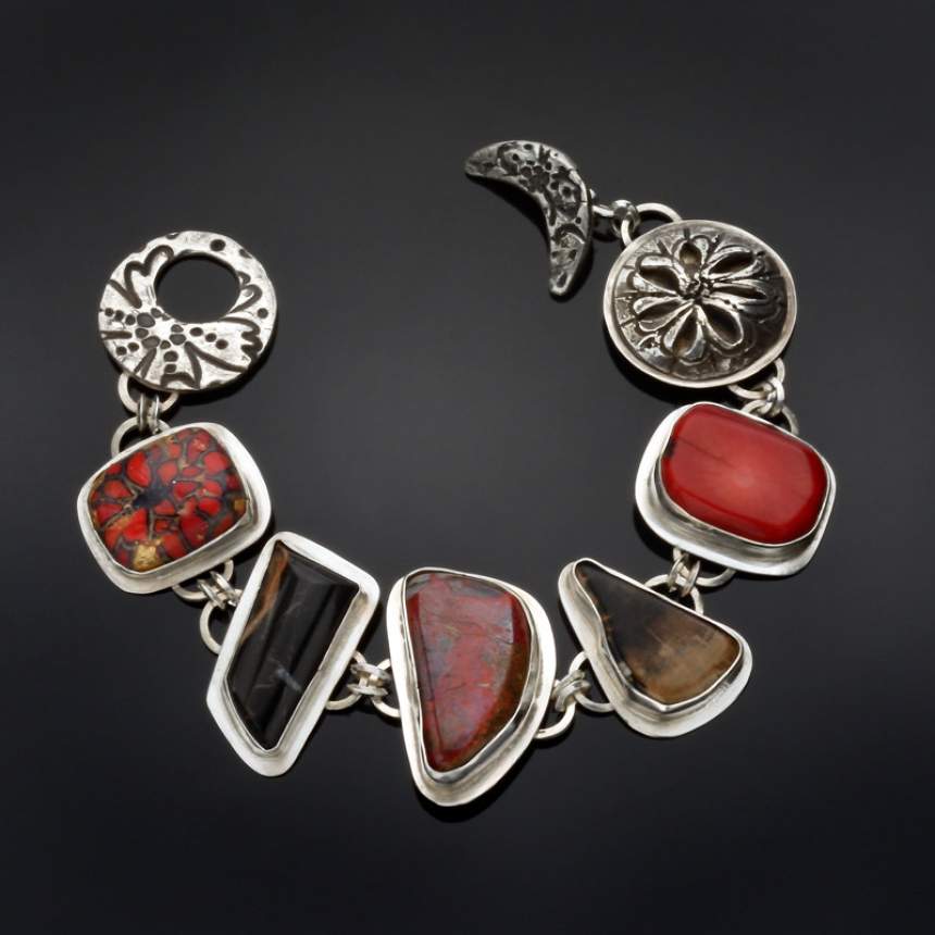 I handcraft the jewelry components using sterling silver, fine silver (PMC), polymer, semi precious stones and found objects. The polymer process I often use begins with cane building, a technique similar to that used in mosaic and millefiori glass. To make a cane, long rods of hand mixed colors of clay are layered, wrapped and arranged to create an image that runs throughout the length of the cane. To create the polymer forms, slices of the cane are arranged on a polymer shape and then fired. Most pieces are then carved, sanded and polished. Fine silver (PMC) is used for organic forms such as twigs, leaves and vines. PMC is shaped and formed just as potters clay. It is then fired in a kiln and the binders are burnt out leaving only precious metal. Bezel plates, earwires and closures are fabricated in sterling silver. The beautiful colors of the polymer contrast and work with the textured silver elements to give the jewelry the unique look for which it is known.