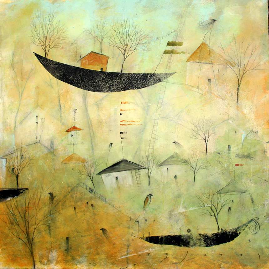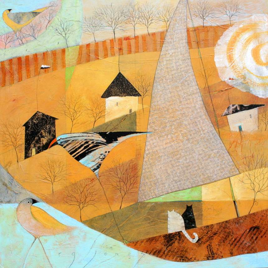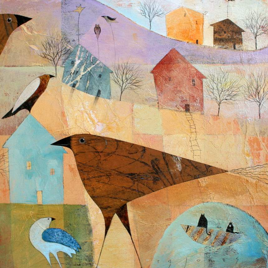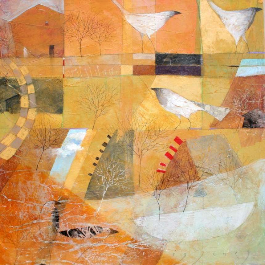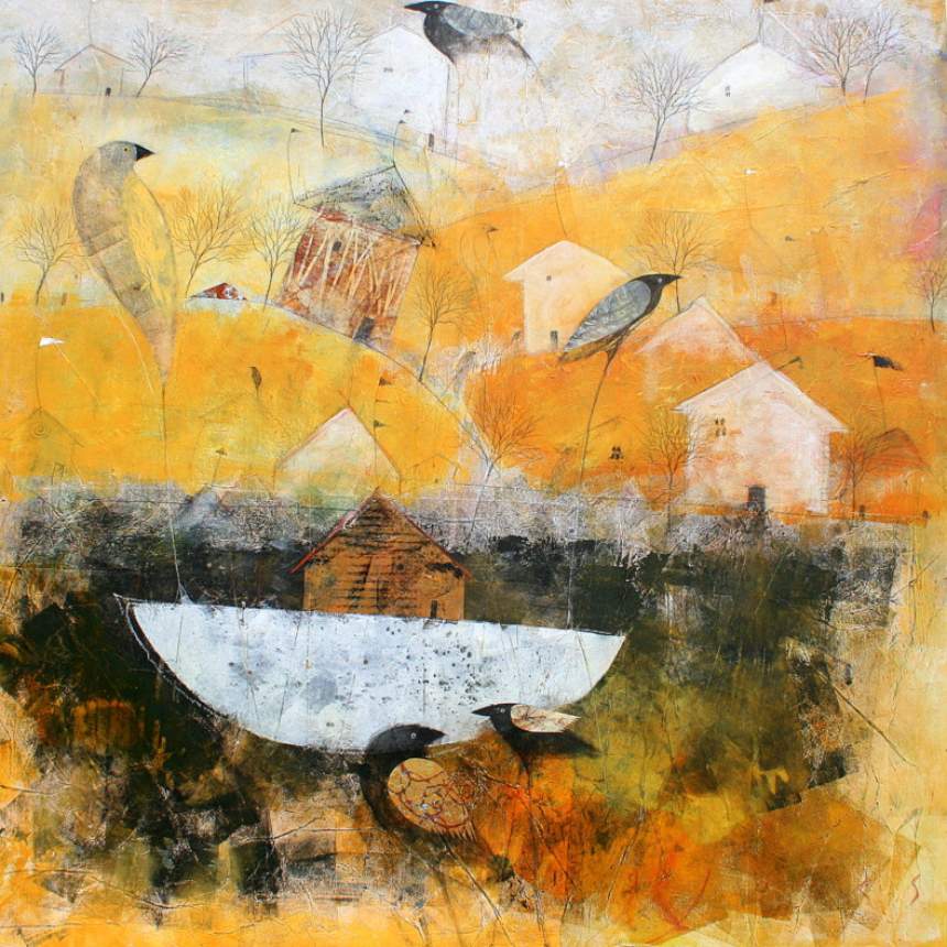 I work in acrylic on wood cradle boards adding charcoal, oil and chalk pastel and paper collage.