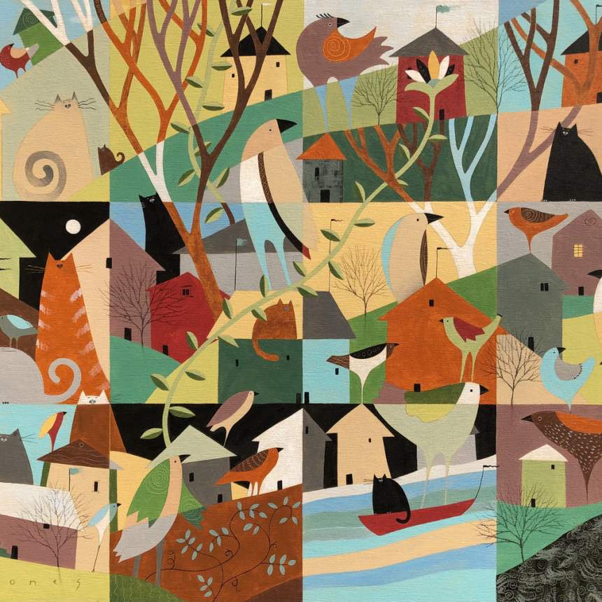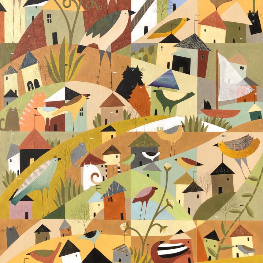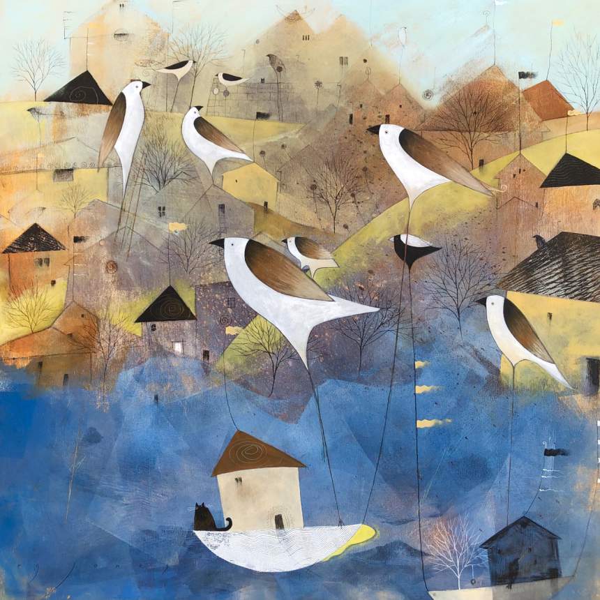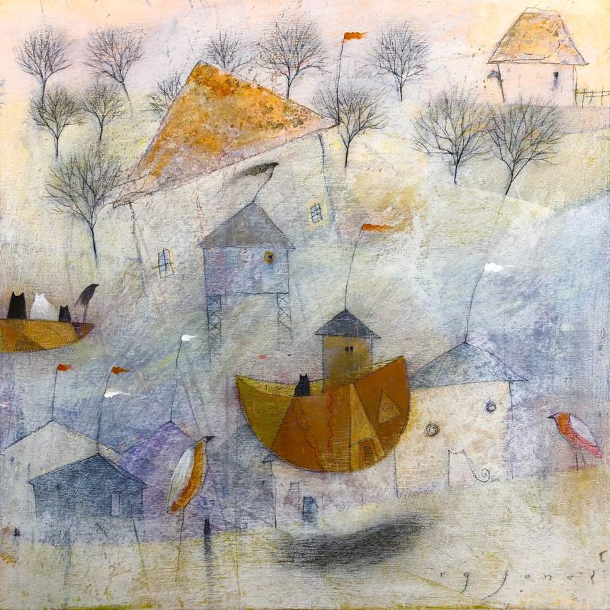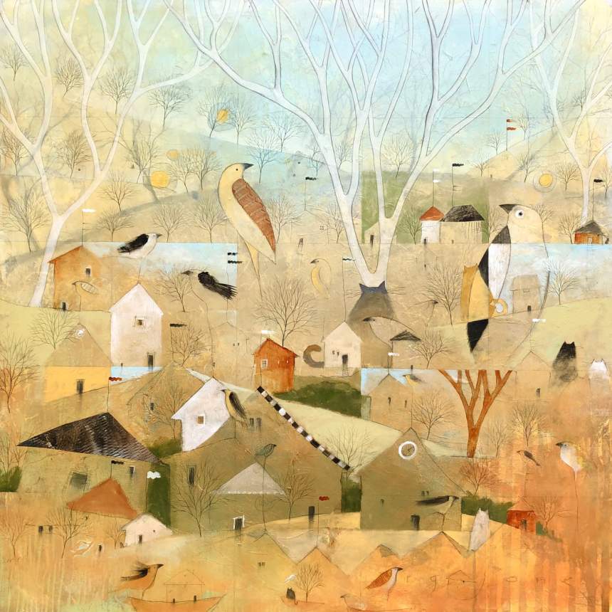 My mixed media paintings are created on wood panels or heavy watercolor paper. Both surfaces start with coats of gesso. Before the gesso dries it is scored with gestural marks using the blunt end of a brush. Once dry, additional layers of acrylic in neutral tones are scraped on rather than brushed to enhance the texture of the gesso. That texture is used to determine the composition of the painting and where to incorporate additional layers of painted and printed papers and other mixed media including charcoal, oil and chalk pastel and colored pencil. The resulting image ends up being a kind of landscape with various flora and fauna and architectural features, influenced by my surroundings here in rural West Virginia.