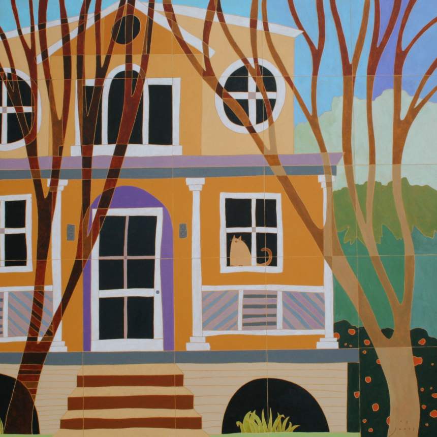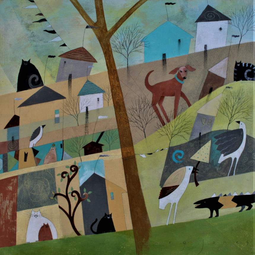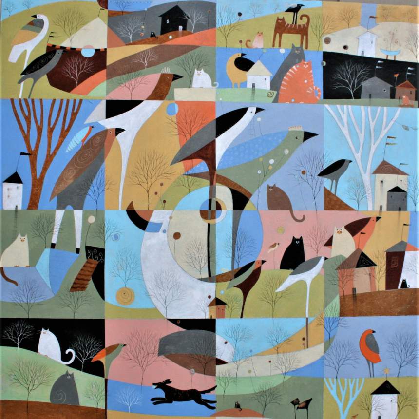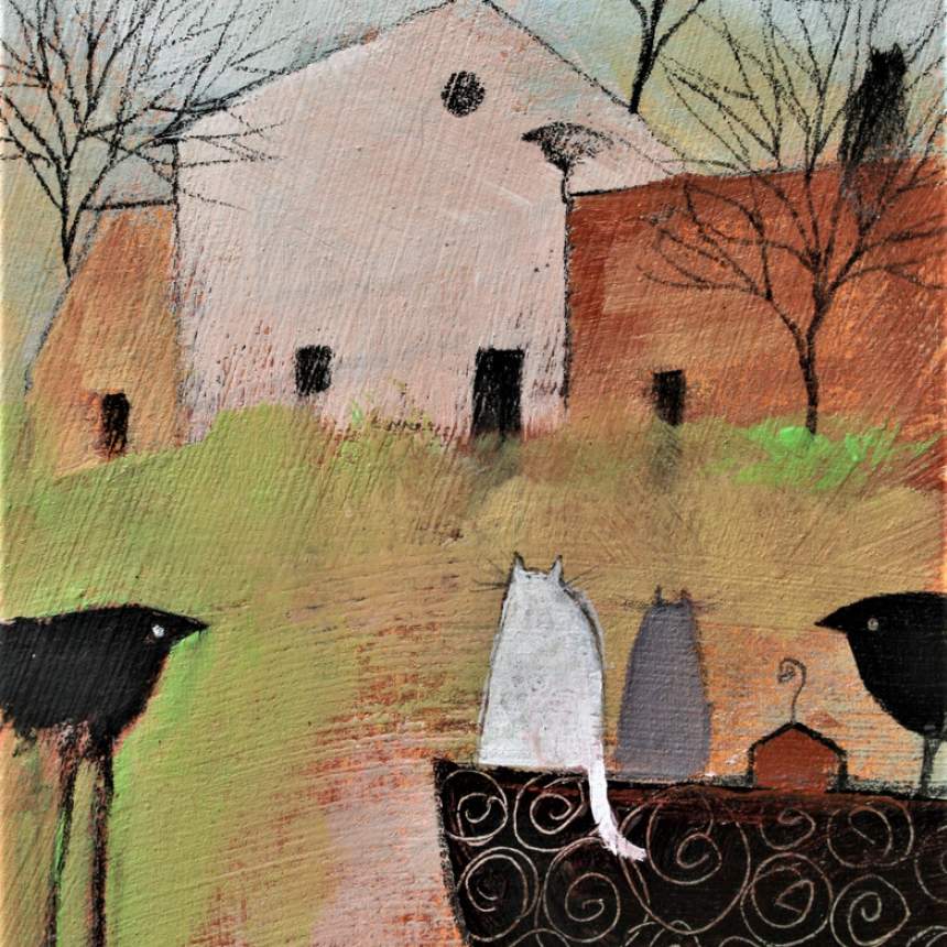 My paintings are not planned, they evolve from a textured underpainting where I find features I want to enhance to create a composition. The result is usually something with a reference to a landscape, including hints of architectural as well as organic features. Compositions are often the product of many layers, even many paintings, with translucent layers revealing the previous images. The goal being to give them a dreamlike quality that will encourage the viewer to become engaged to find what might be hidden or not obvious at first glance.