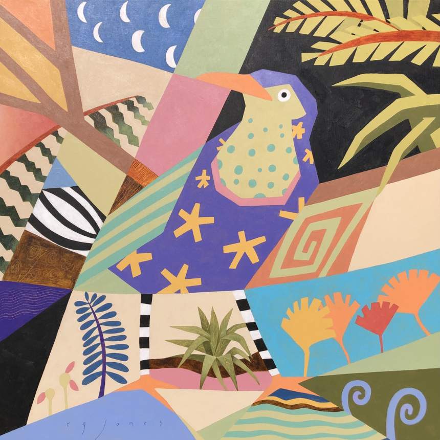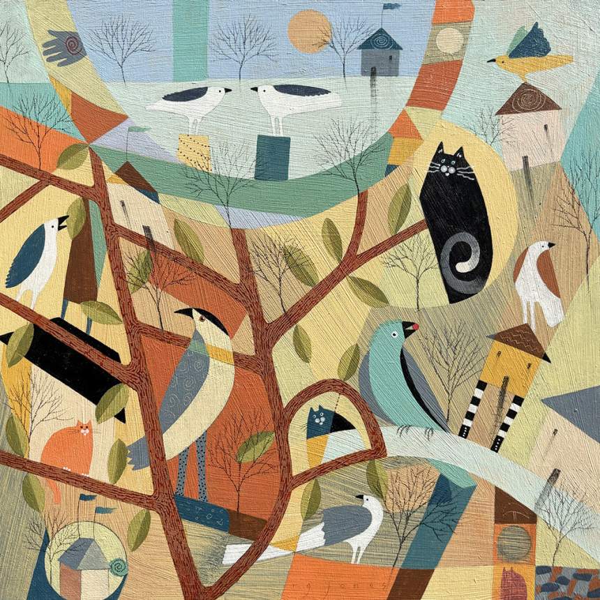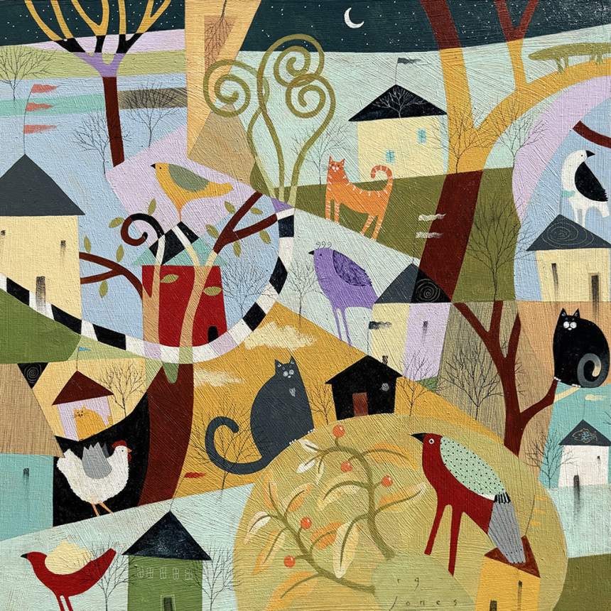 A good friend once called my work “seriously whimsical”. I work in acrylics mixed with other media on wood cradled boards and heavy watercolor paper. The compositions evolve spontaneously, or intuitively, or both, using my preferred iconography of stylized birds, trees, houses, critters, boats, ladders, flags and whatever else appears and fits in with the theme.
