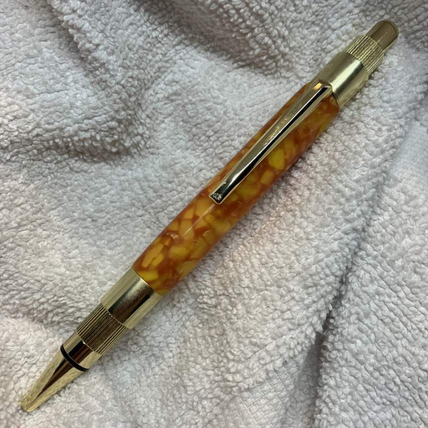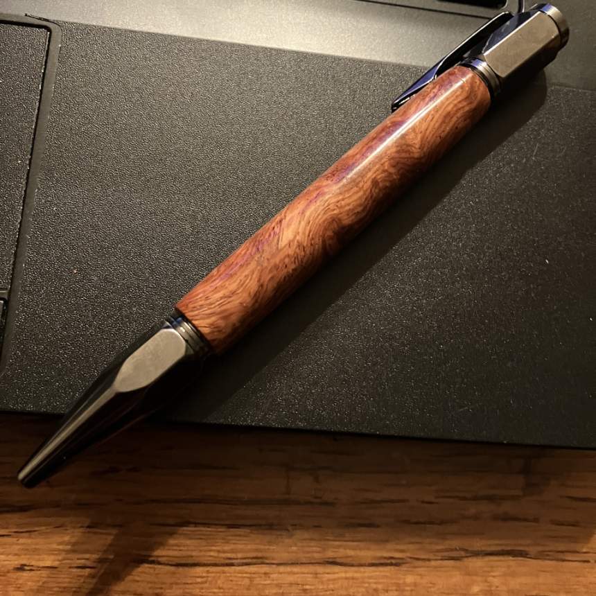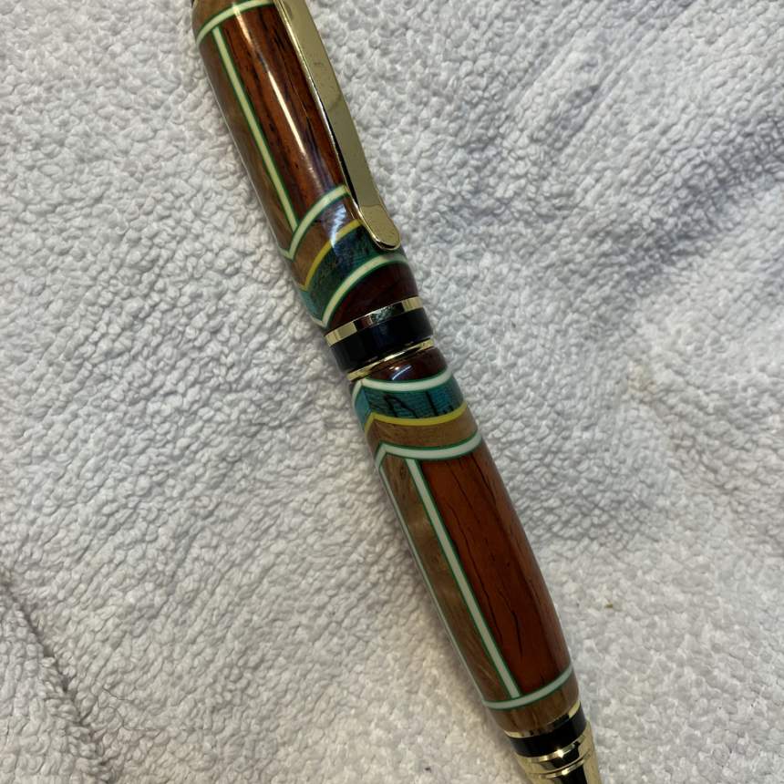 Description of my work. Horner’s Pens I create one of-a-kind writing instruments and various hand turned items All my works are created by me> I chose different types of wood, I hand poured acrylics and items embedded in clear and colored resins to turn to create the bodies of my works. The material is cut to the length I need. A hole is drilled length wise for a brass tube to give the pen strength. The material is turned on my lathe, sanded and a finish applied as it is spinning. Different metal components are chosen that will complement the turned body. Titanium-gold, 22k gold, rhodium and platinum are used Items include Ballpoint, rollerball, and fountain pens. Also Office accessories, letter openers and magnifying glasses are hand turned on my lathe. Different styles of key chains and fan pulls are made.