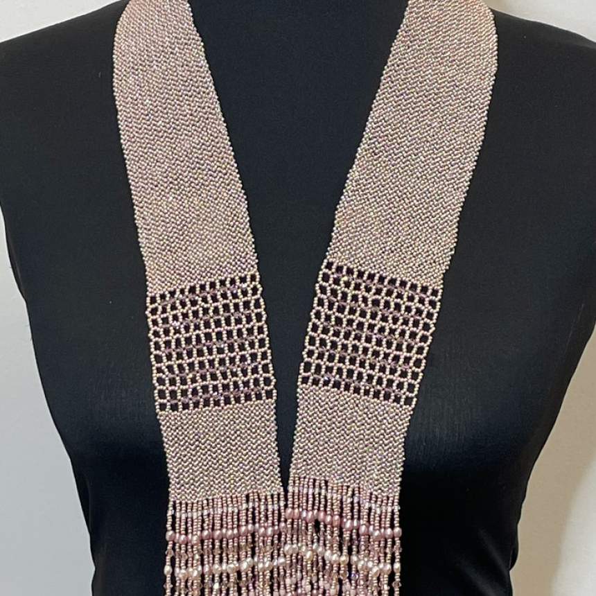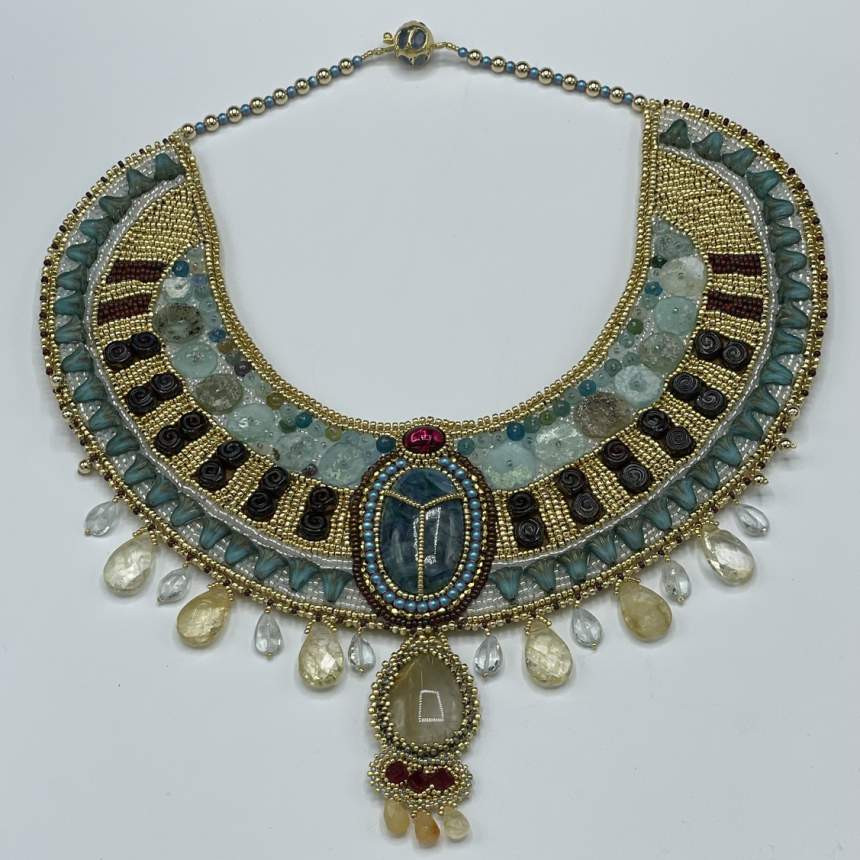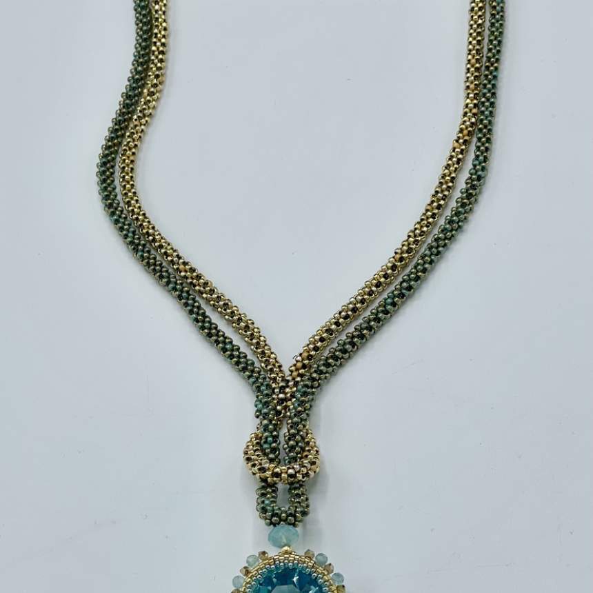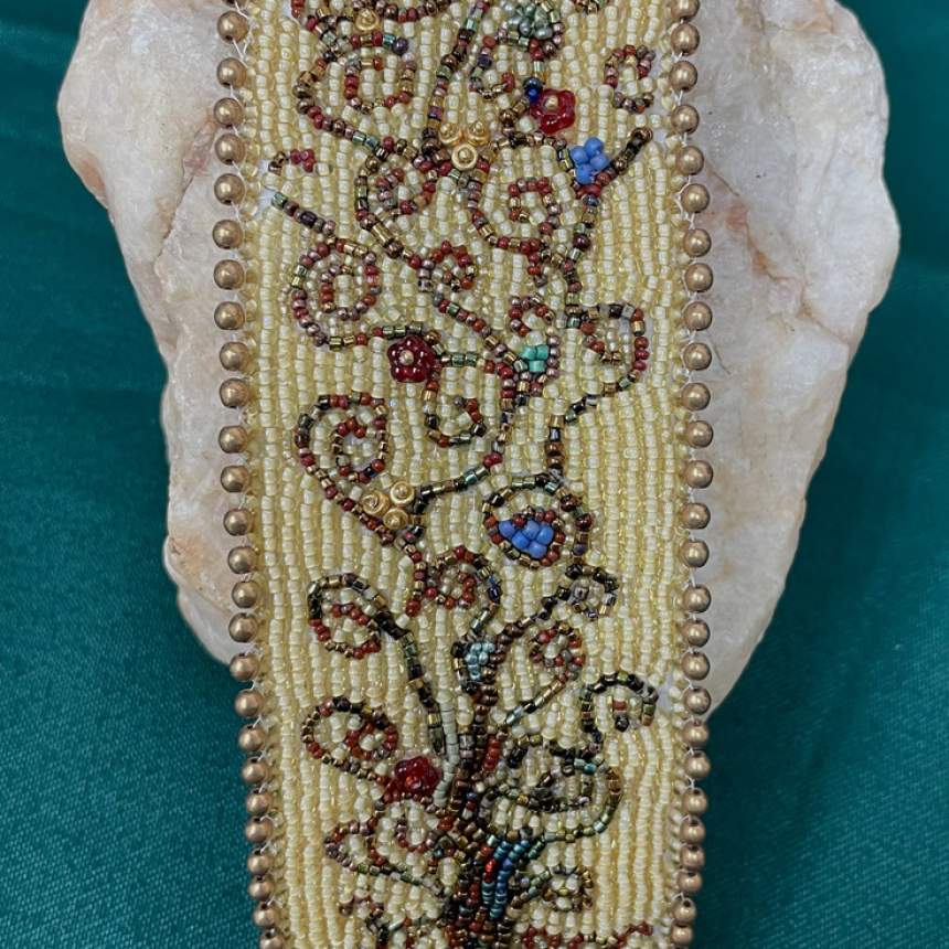 Original, one of a kind jewelry in bead weaving and bead embroidery. I use very good quality materials, including glass, gemstones, and freshwater pearls, mostly with sterling, gold filled or bronze fittings. This work is accomplished with needle and thread, one bead at a time, in a meticulous and time intensive process that requires imagination, good design, and a focus on detail. The results, I hope, are eye-catching and comfortable to wear. The unique pieces draw from the long history of jewelry design. I have this year been juried and admitted as a Roycroft Renaissance Artisan.