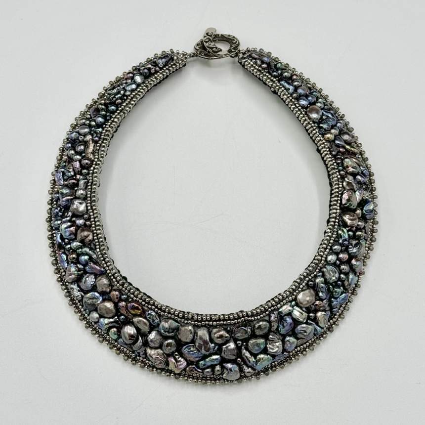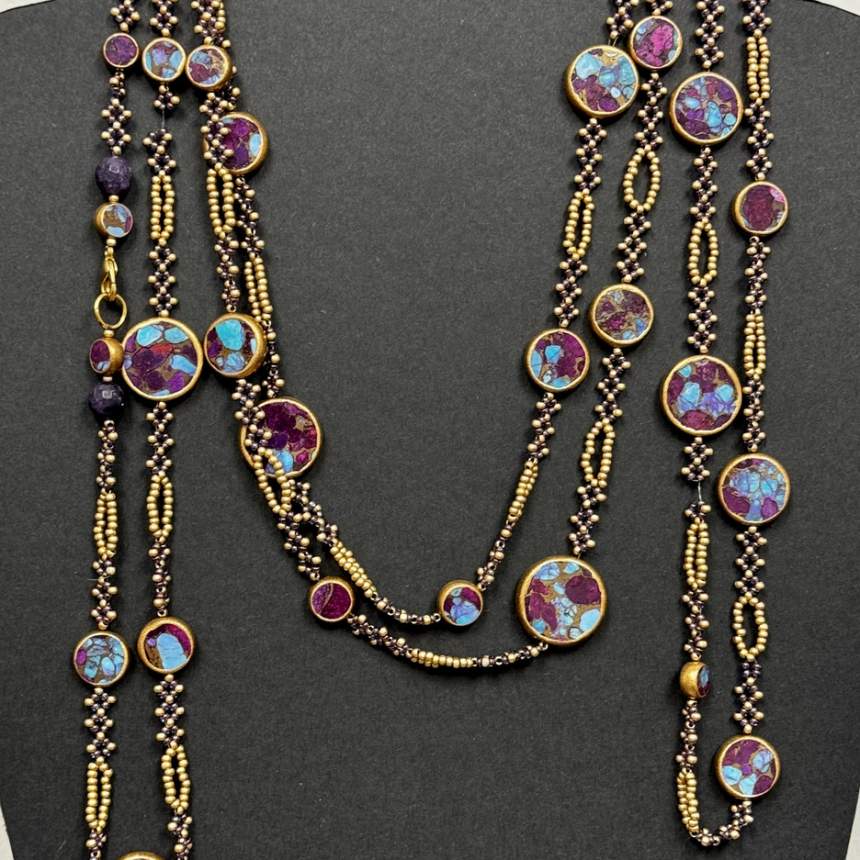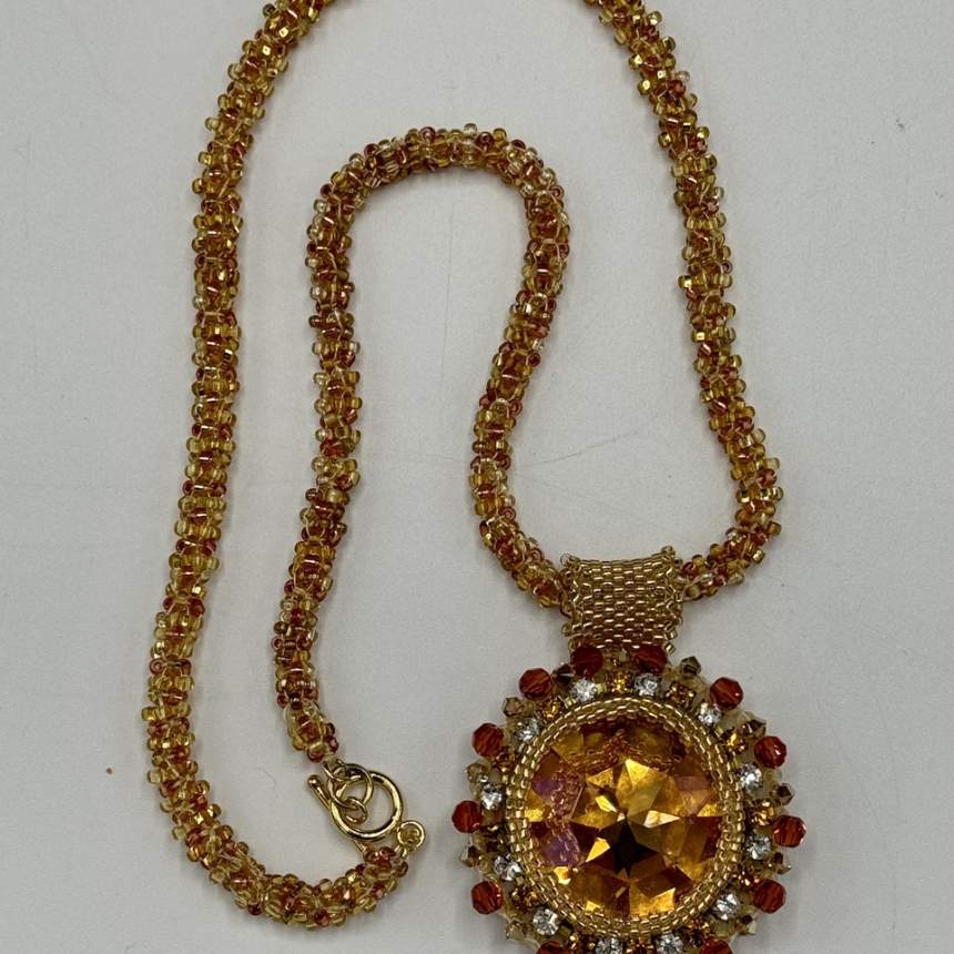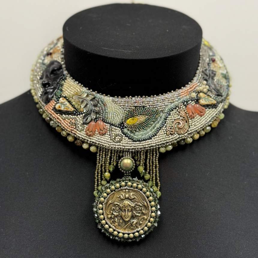 I make original neckpieces, bracelets and earrings in bead embroidery and/or bead weaving. Primary materials are semiprecious gemstones, crystals, pearls and glass, with silver, gold filled and bronze fittings. Inspired by historical motifs and techniques, I produce modern pieces that are eye-catching, unique and wearable.