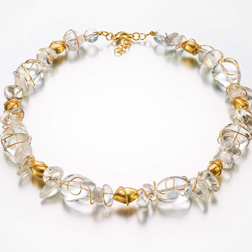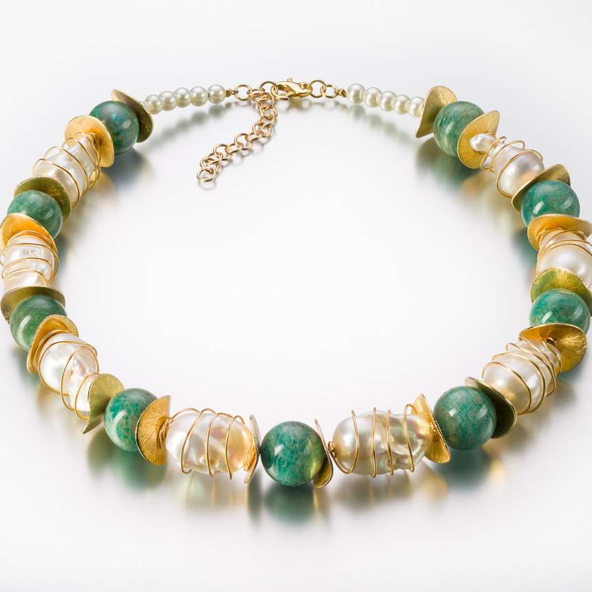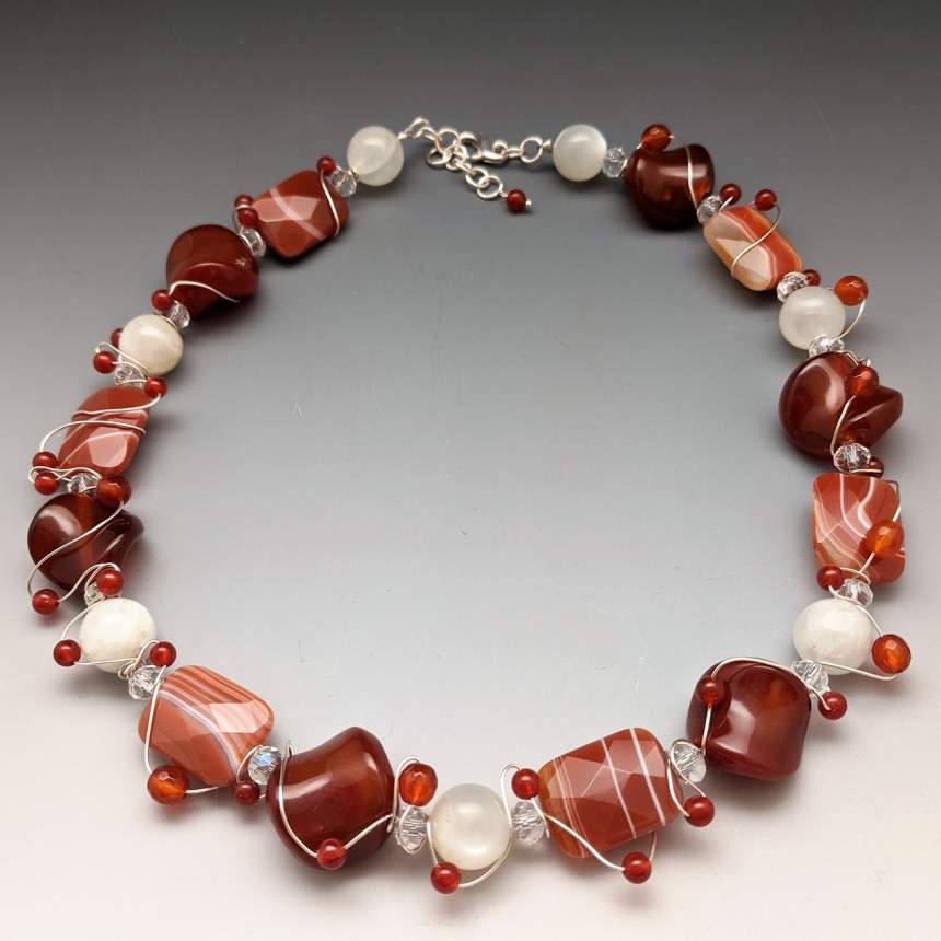 I use wire embellished with small beads to encircle the natural stones, soften their sometimes harsh appearance, to emphasize their beauty and harmonize the colors of the stones. The effect enhances the life, color and dimension of the stones. I design wearable art using Nature's most beautiful creations, mineral stones.