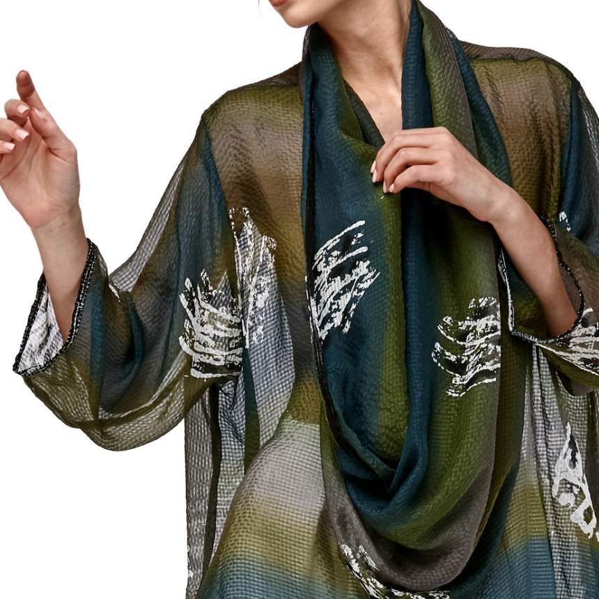 I take white silk fabric of varying textures, stretch onto horizontal frames, then handpaint with dyes/brushes...after heatsetting and washing, i cut/sew the painted silk into my own timeless, flattering, one of a kind fashion styles