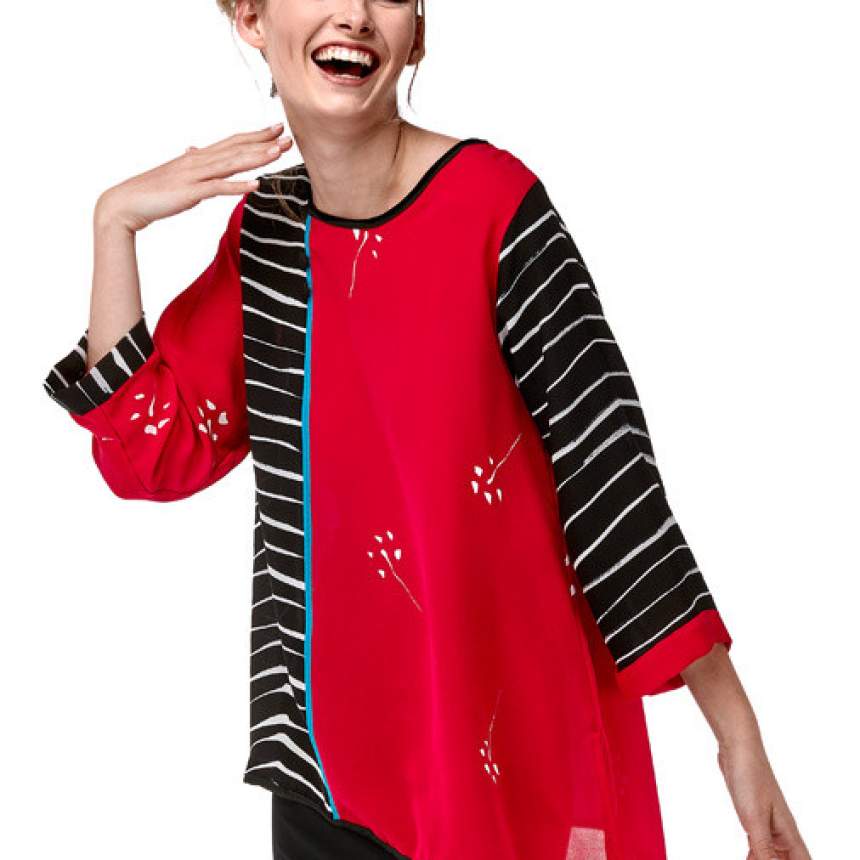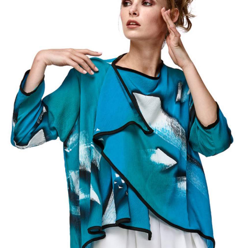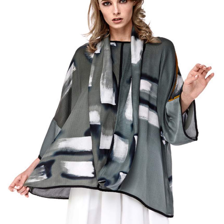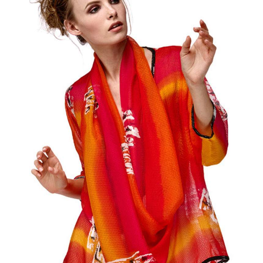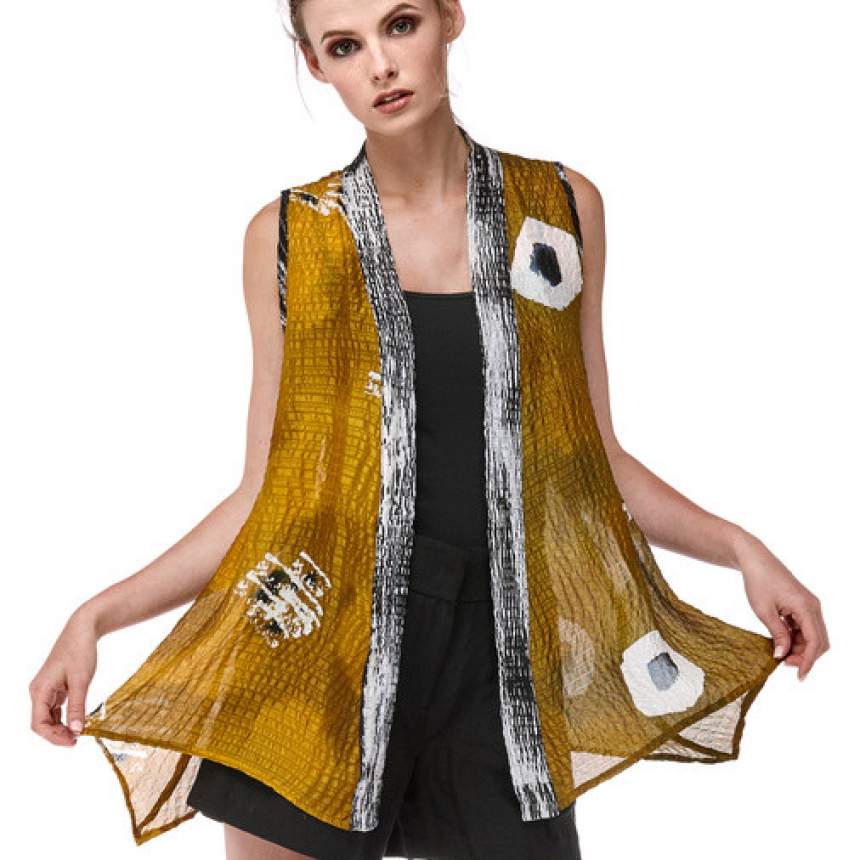 I take white silk fabric of various textures, stretch it onto horizontal frames, hand-paint with dyes, brushes, and heat-set. Then I cut and sew the painted silk into my own timeless, flattering fashion styles.