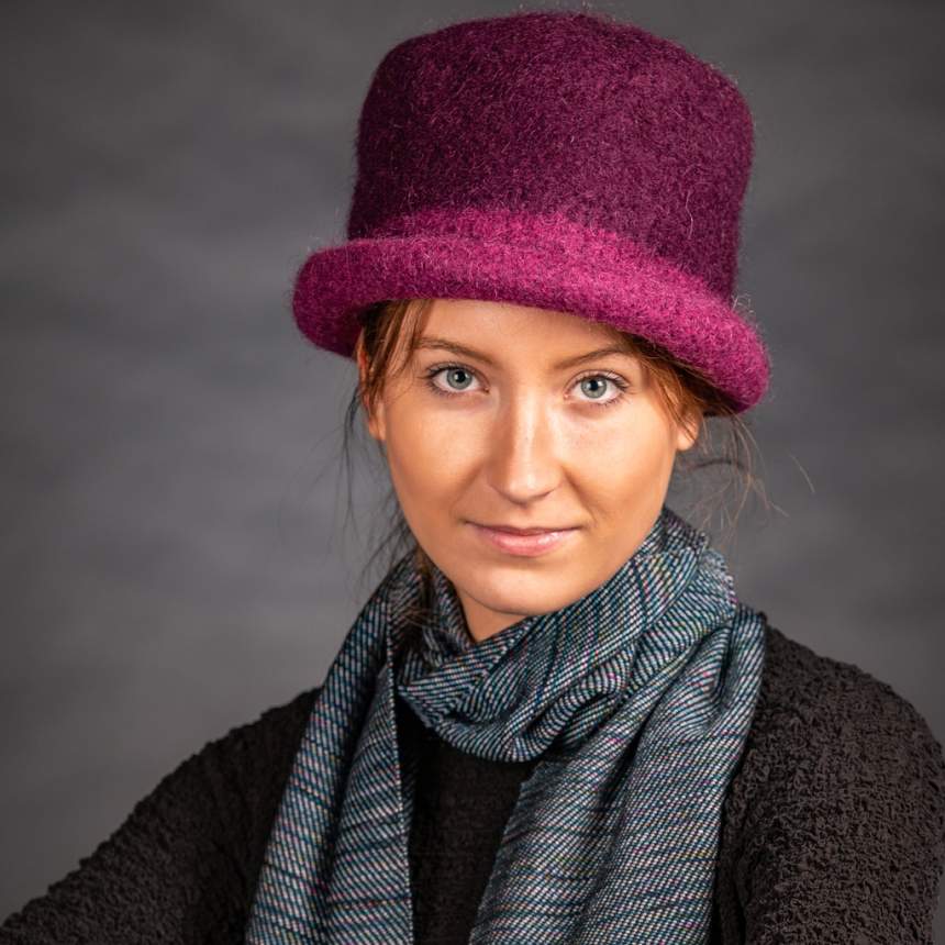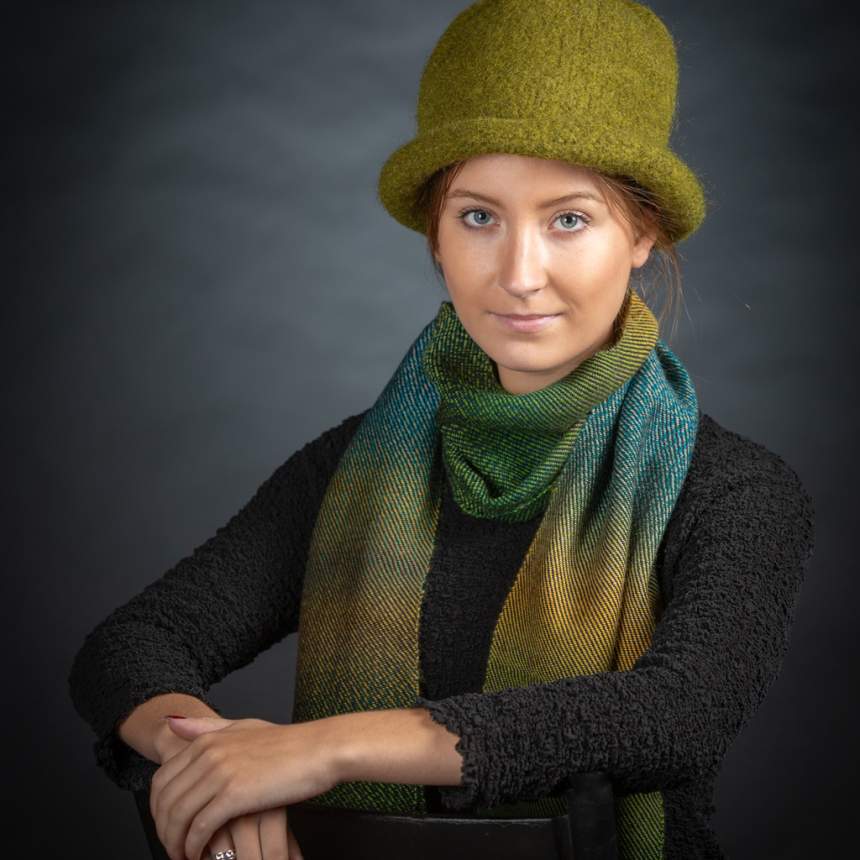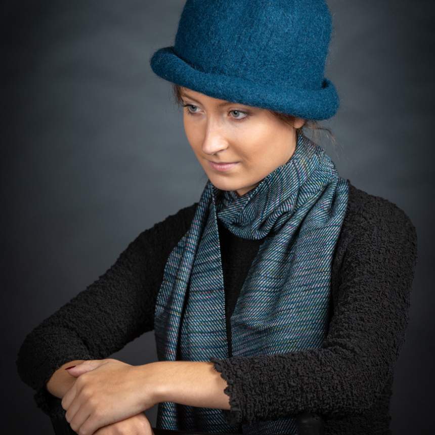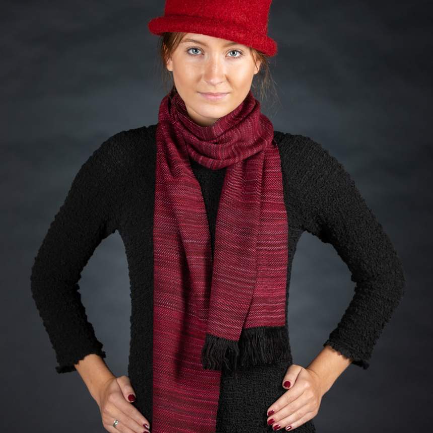 Felting is the process of matting wool by subjecting it to moisture, heat, and pressure to create a dense fabric. Felting has been known to man for thousands of years and has origins from around the world. Today, this ancient process is used to create modern hats for the contemporary women. They are hand knitted, then washed in hot water, and air dried for several days to create a hat that is naturally windproof and waterproof. Hand weaving is another ancient form of textile making that traces back to Neolithic times. The aid of a floor loom allows for the combination of contemporary fibers such as Tencel, an eco-friendly, light weight yarn made from Eucalyptus Trees, and Bamboo, another plant based eco-fiber, with historic luxury fibers such as Merino, Alpaca, and Cashmere to create scarves that are both functional and beautiful.