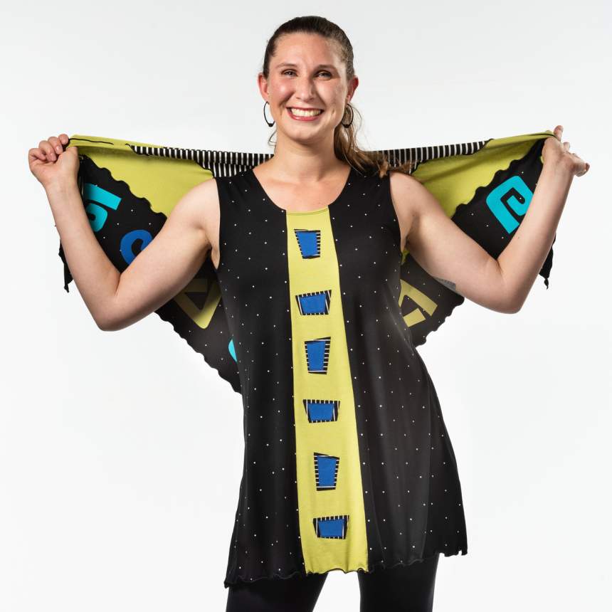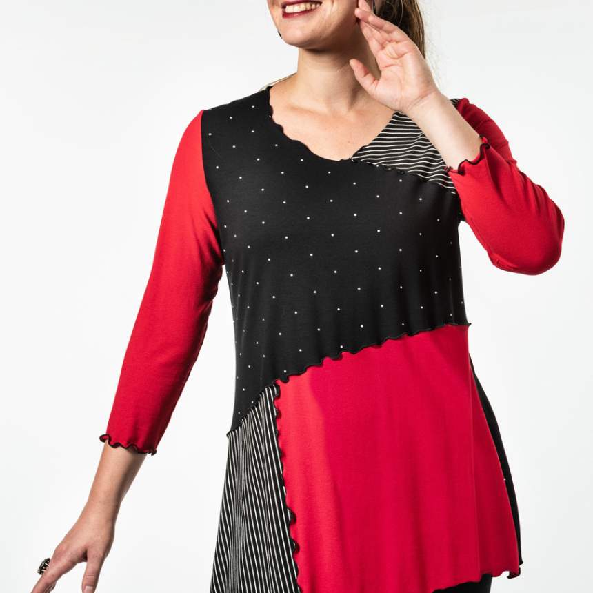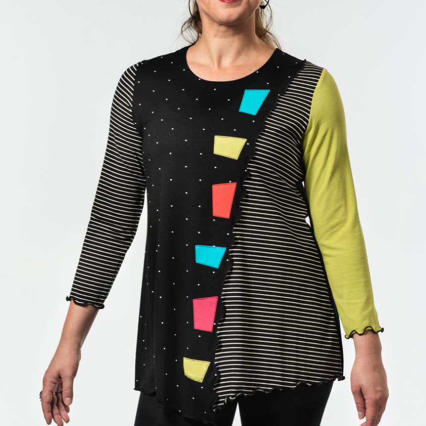 From a doodle on a pageI bring my ideas to life. I make a pattern and amend it until I am happy. Then I decide on color and the geometric shape within. Fun with color begins. Some are one of a kind and some are several of kind. Each piece is thought out and executed and made individually. Fit is really important and not always evident. I pay close attention to body shapes and create forms that complement them.