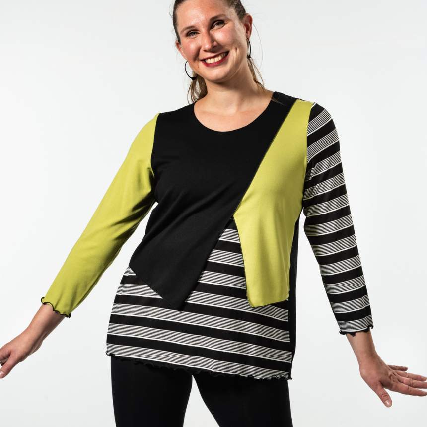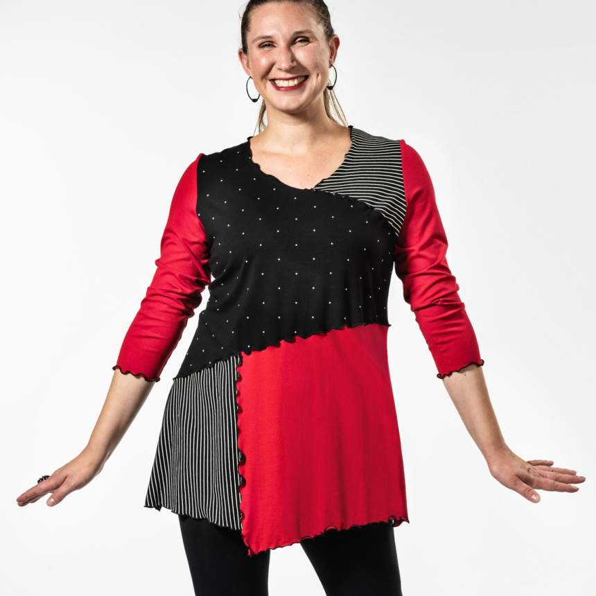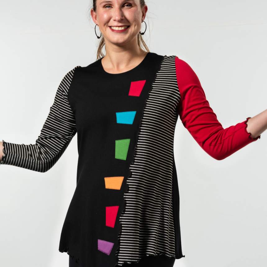 From a doodle on a pageI bring my ideas to life. I make a pattern and amend it until I am happy. Then I decide on color and the geometric shape within. Fun with color begins. Some are one of a kind and some are several of kind. Each piece is thought out and executed and made individually. Fit is really important and not always evident. I pay close attention to body shapes and create forms that complement them.