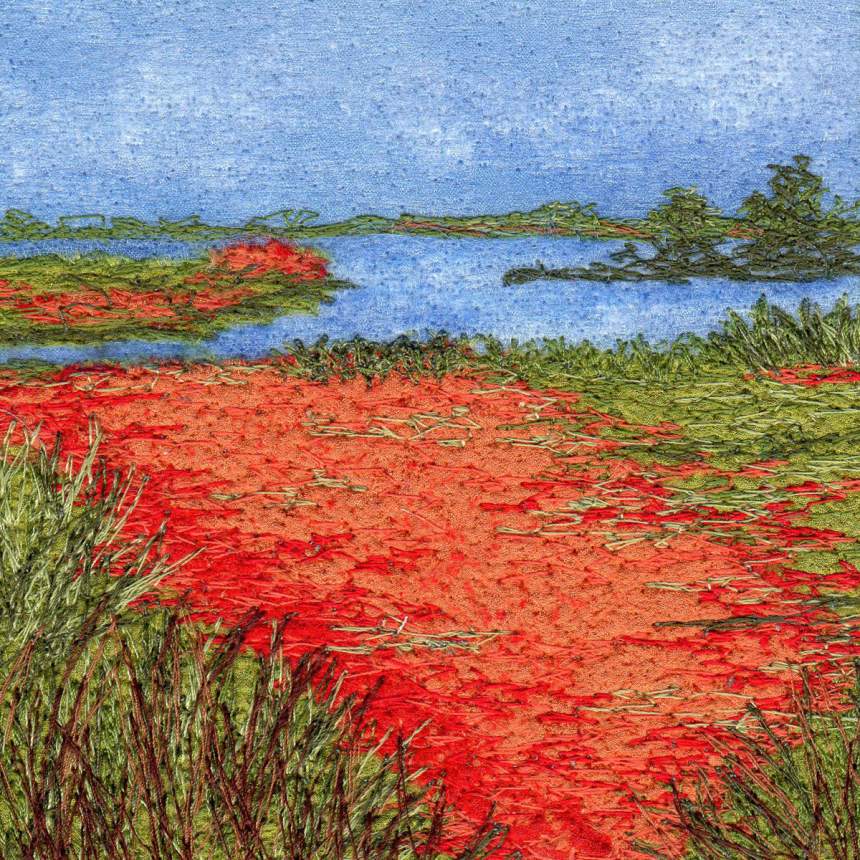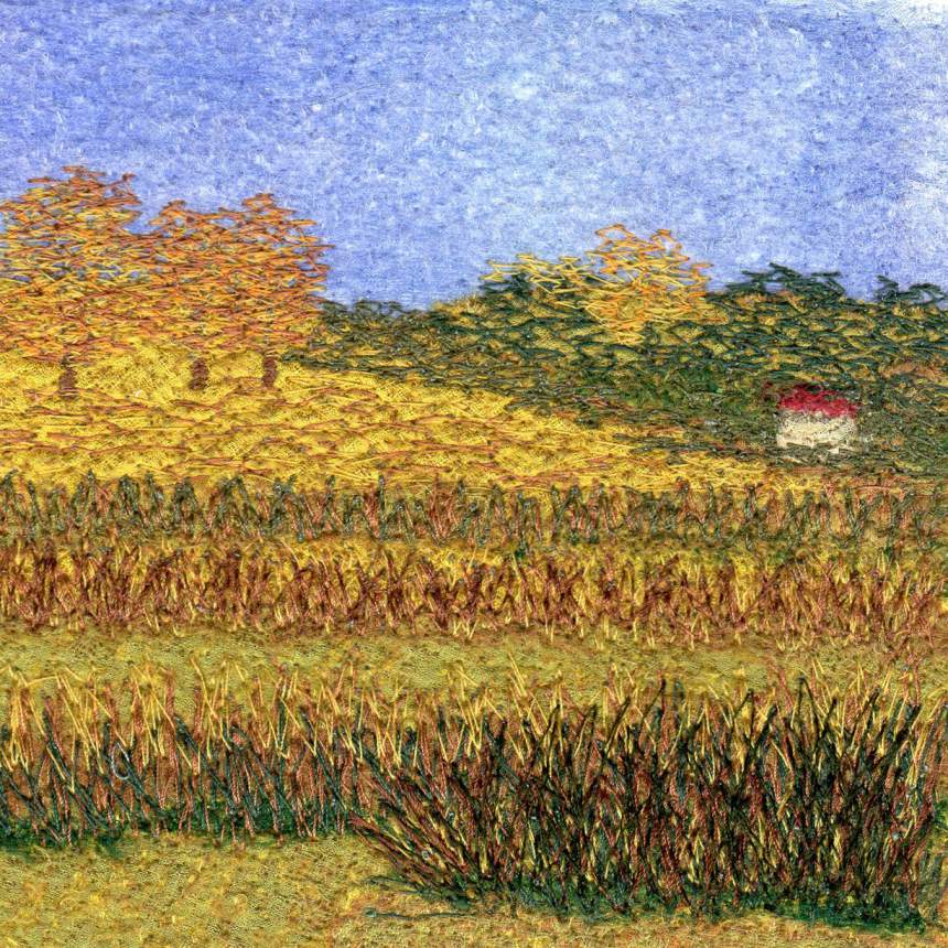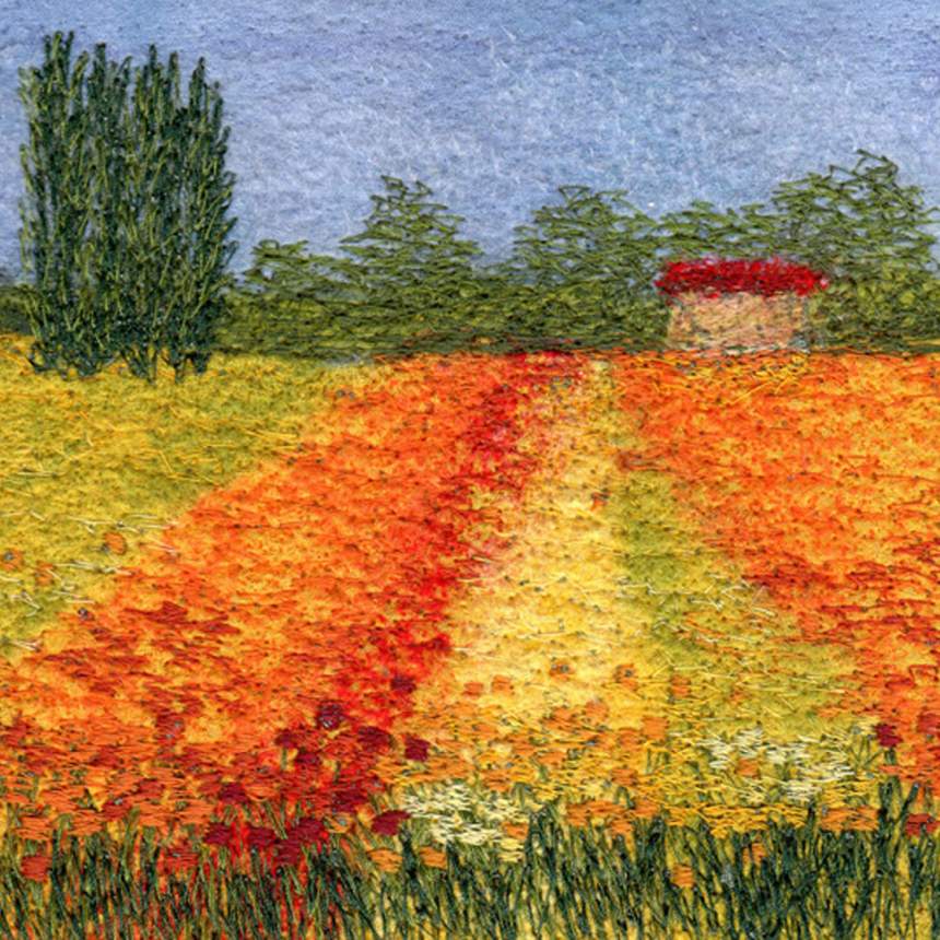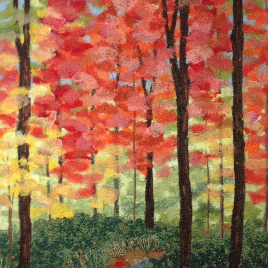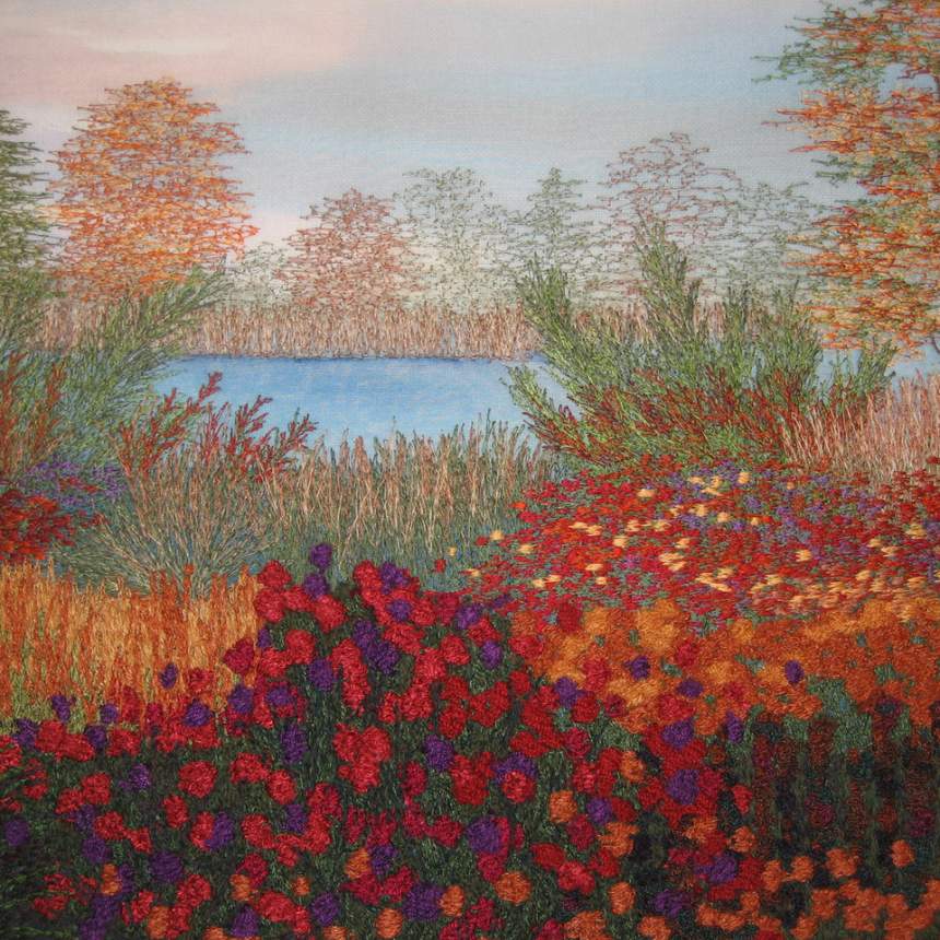 My work is a combination of painted and dyed silks, free-motion machine embroidery, and needle-felting. All work is matted and framed. For my free-motion embroidery, I use my 40-year-old (non-computerized!) sewing machine as a drawing tool to blend and mix colors by layering threads. I create painterly effects through thousands of stitches and achieve rich textures by fluidly and continually shifting the fabric under the rapidly moving needle. The imagery is inspired by landscapes and gardens encountered during my travels, and by favorite photographs. For my needle felting, I incorporate different weaves of pure silk to "paint" the image; each shade of color is a different piece of fabric. I assemble the work without adhesives or stitching; I use barbed needles, traveling over and through the multiple layers in order to tangle the fibers, fuse the fabrics, and blend the colors. I may add details with free-motion embroidery and/or with bobbin embroidery.