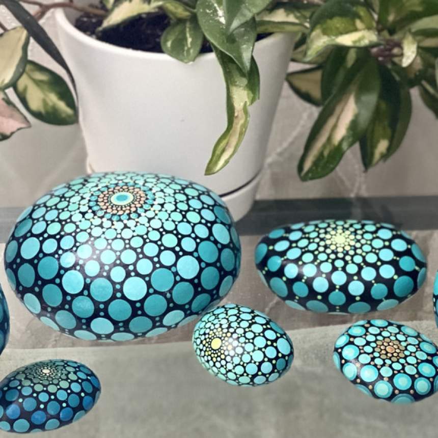 1) Hand-crafted "lampwork" glass beads. I use my Lampwork Beads in my original jewelry designs. 2) Mandela style painting (rocks)