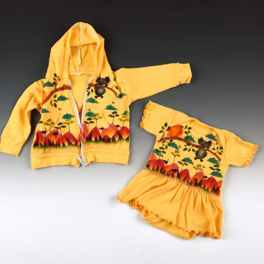 I design, cut, sew, dye & hand paint wearable art, using cuddly natural fabrics and hand mixed, eco-friendly dyes for children & infants. My whimsical designs utilize recognizable images and are painted in a rainbow of vibrant color, depicting nature in all its wonderful splendor. My current line incorporates images of endangered species, teaching children about environmental themes.
