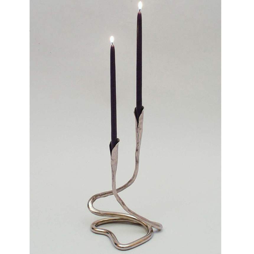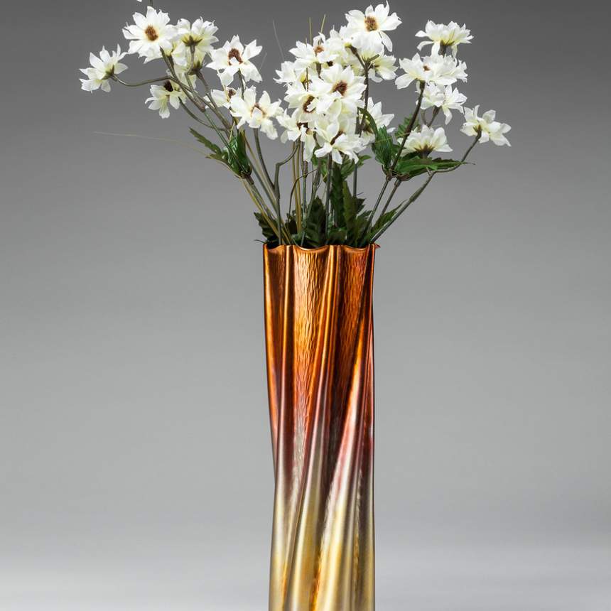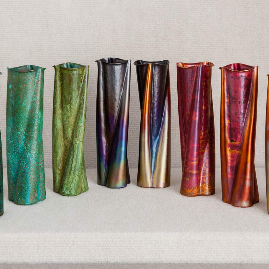 The procedure I use is called forging, the controlled shaping of metal by the force of a hammer. This technique makes graceful transitional shapes from a piece of copper tubing. I also use a specialized technique called crimping, where a gentle, radial fold in sheet copper is used to begin the process of raising the material. After the desired form is achieved, a bottom is attached to the vase, or a hook to the wall piece with silver soldering. To remove all the oxidation and borax glass (the left over flux that has been heated during soldering) the piece is soaked in an acid bath. This is called pickling. The chemical is Sparex #2 which works best for nonferrous metals. Along with the easy malleability of copper, it also has the ability to turn many beautiful colors. Chemicals in the air will achieve this, but most coppersmiths prefer to control the process themselves. I am capable of obtaining most colors by the use of heat and chemical reactions to the copper.