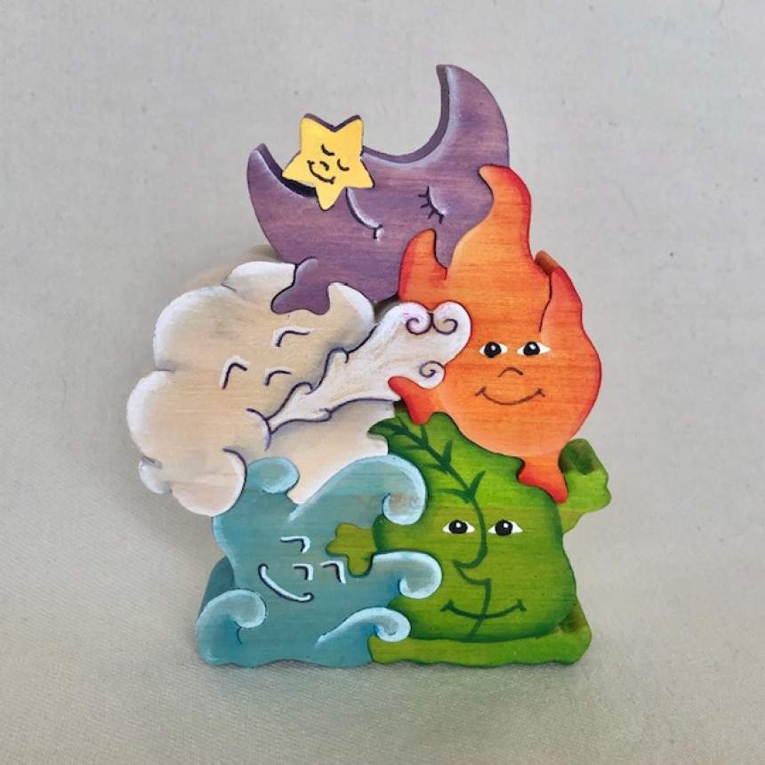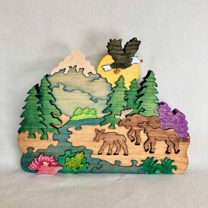 Creating unique and original art puzzles has been our passion since 1984. All of our work is individually cut by hand on a scroll saw, sanded,stained and painted. To share both new and treasured designs continues to bring joy to our hearts. With respect to our natural world as well as human kind, our work is safe and non-toxic. This years images reflect our love of nature, using color, design and our own imagination to bring our puzzles to life.
